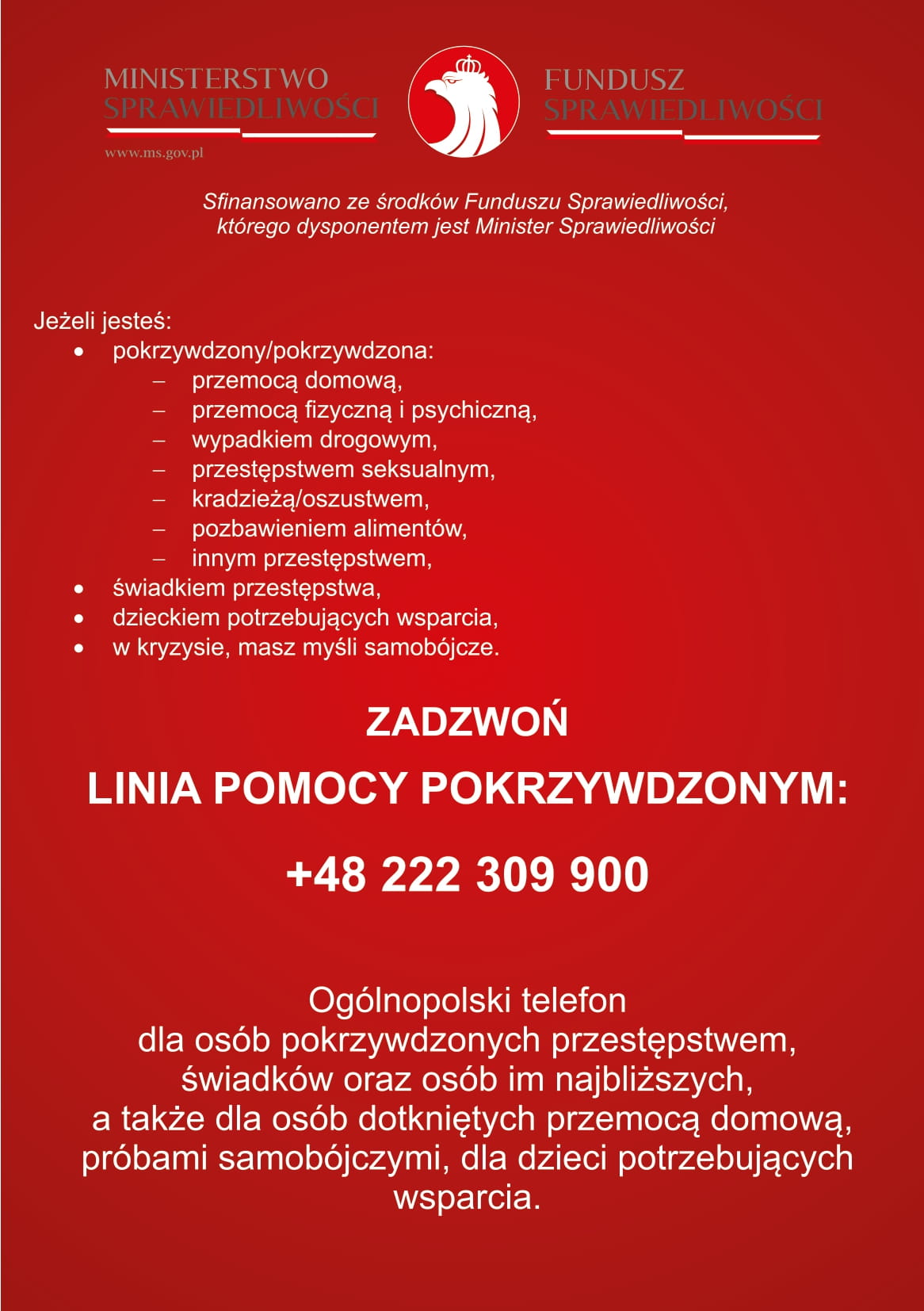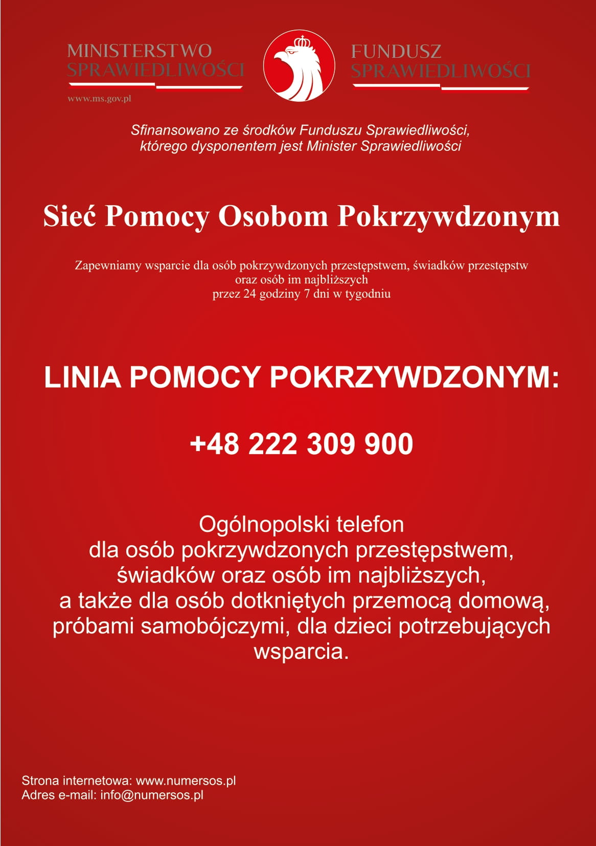 Linia działa z inicjatywy i dzięki środkom Funduszu Sprawiedliwości. Więcej informacji znajdziesz na stronie linii: numersos.pl