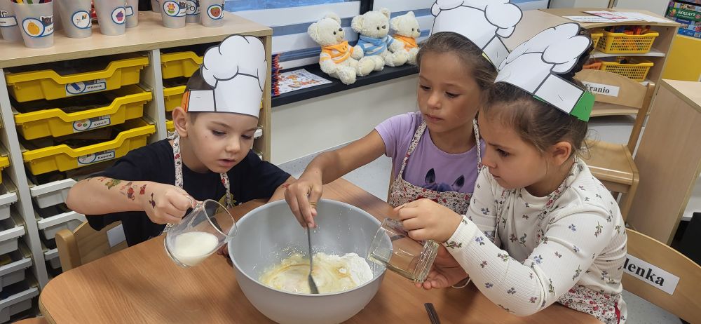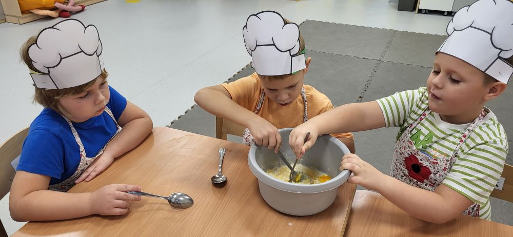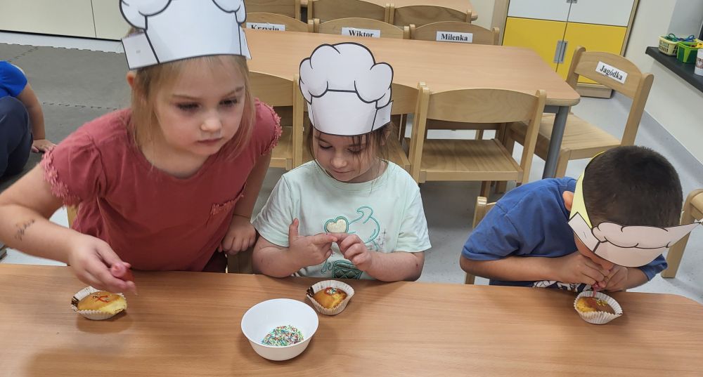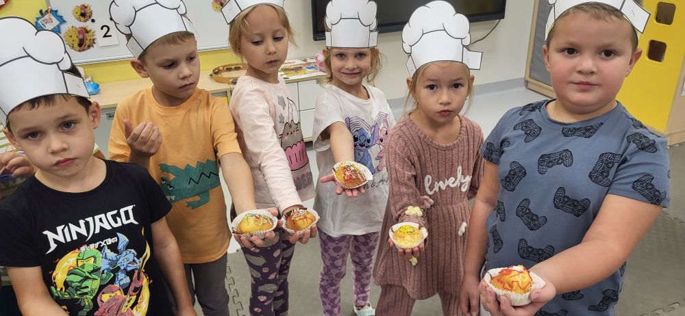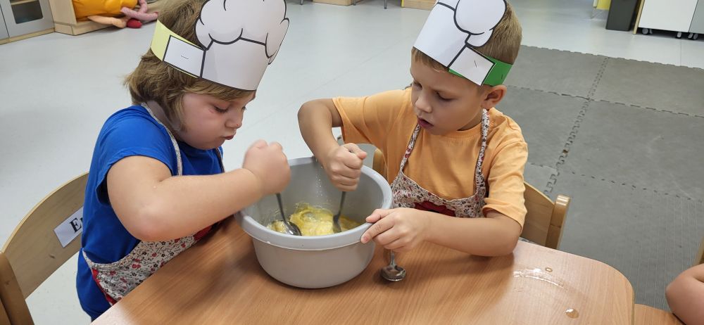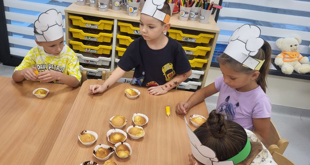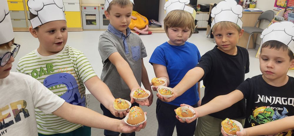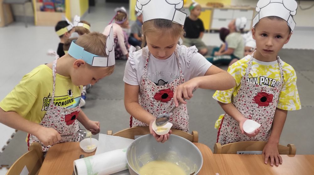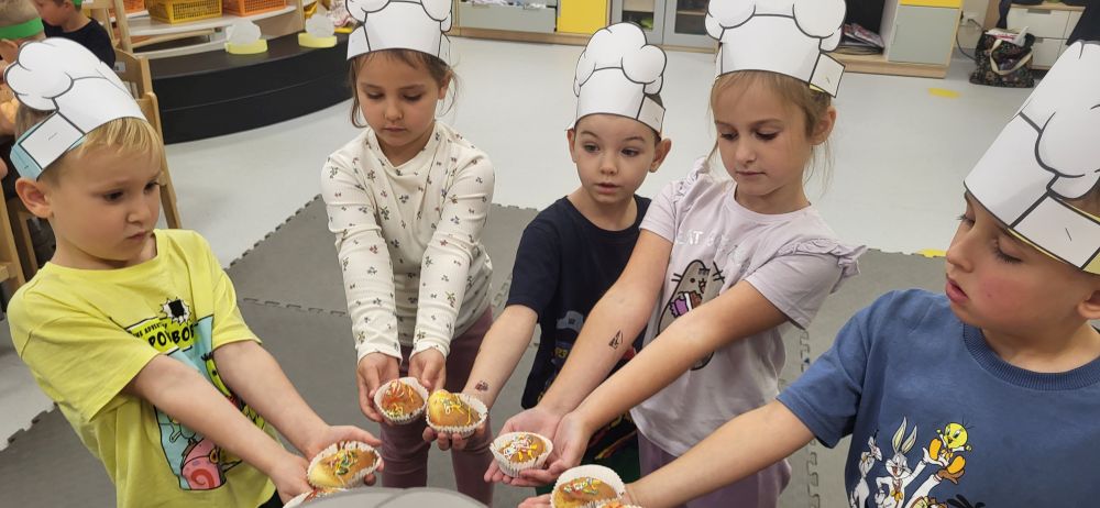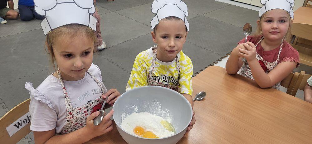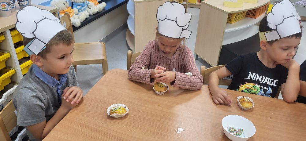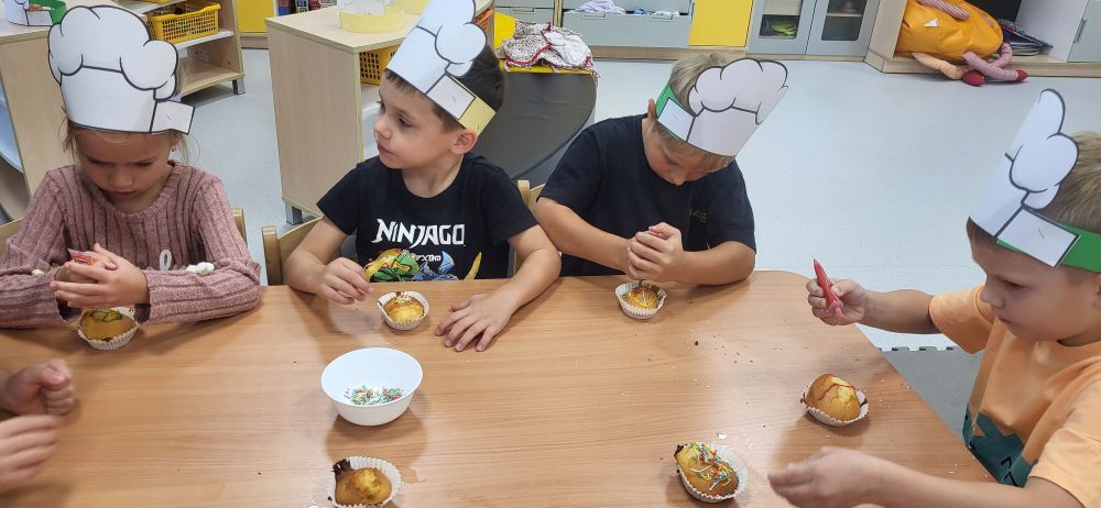 Podczas zajęć kulinarnych dzieci piekły babeczki. Z wielkim zaangażowaniem wykonywały kolejne polecenia, mieszały składniki, odliczały odpowiednie porcje składników, a po upieczeniu dekorowały swoje babeczki. Był to dla wszystkich doskonały i apetyczny deser.