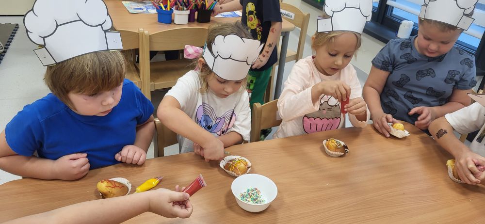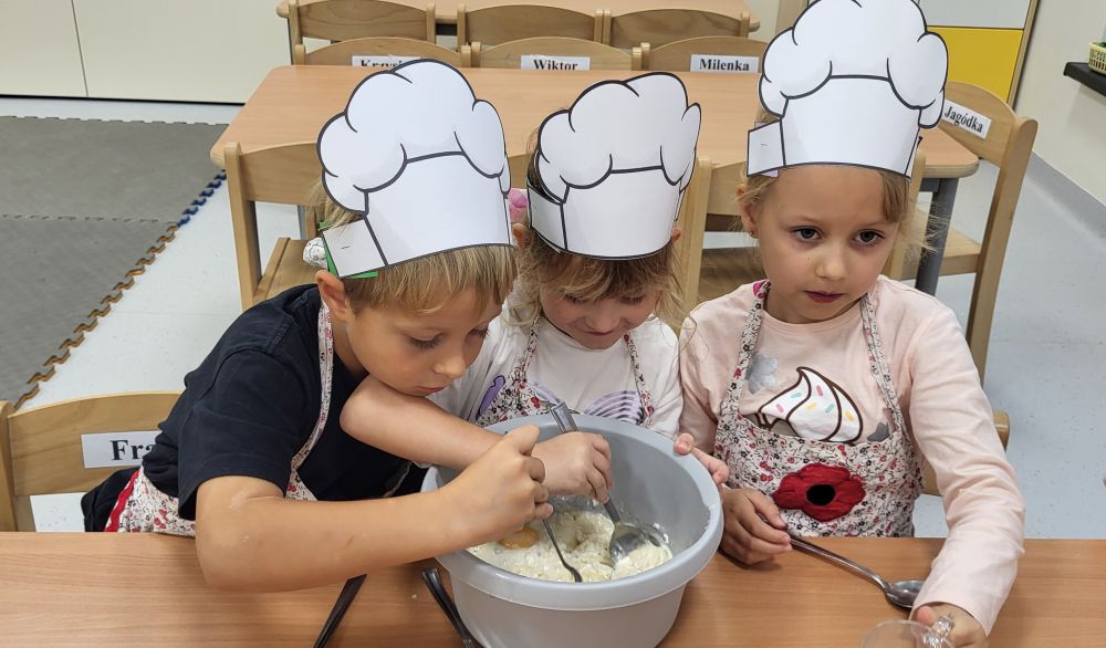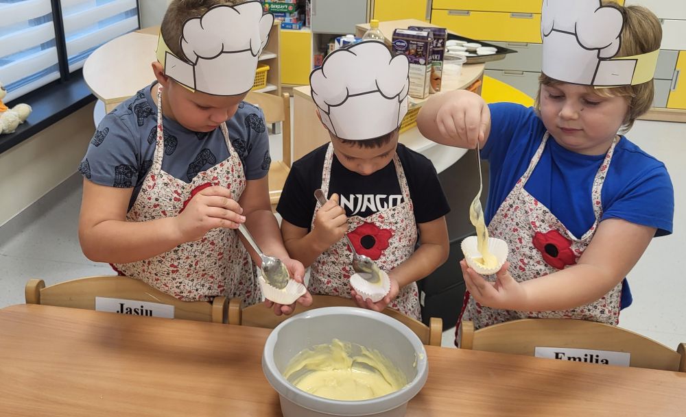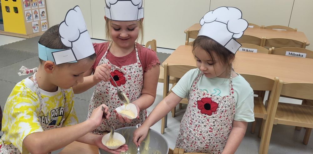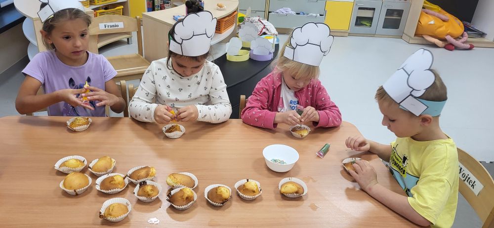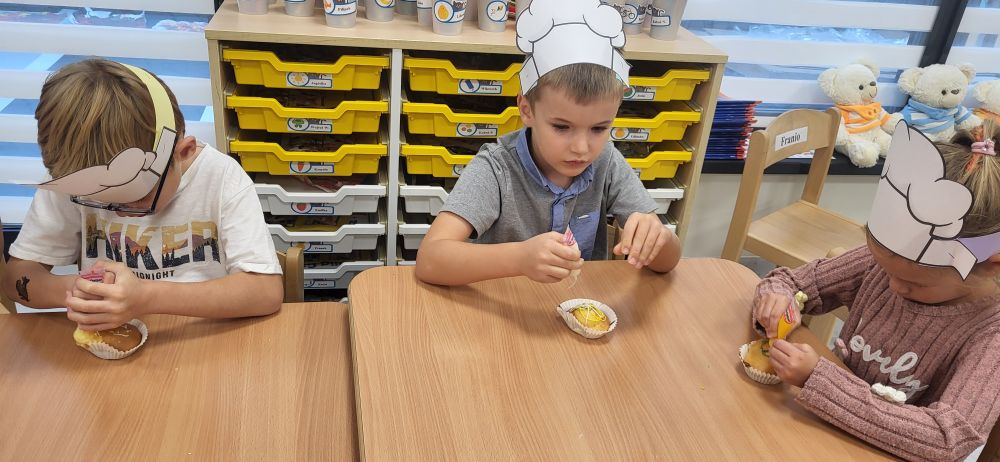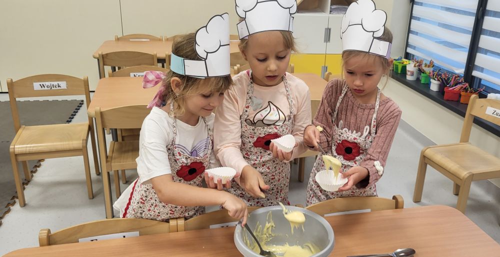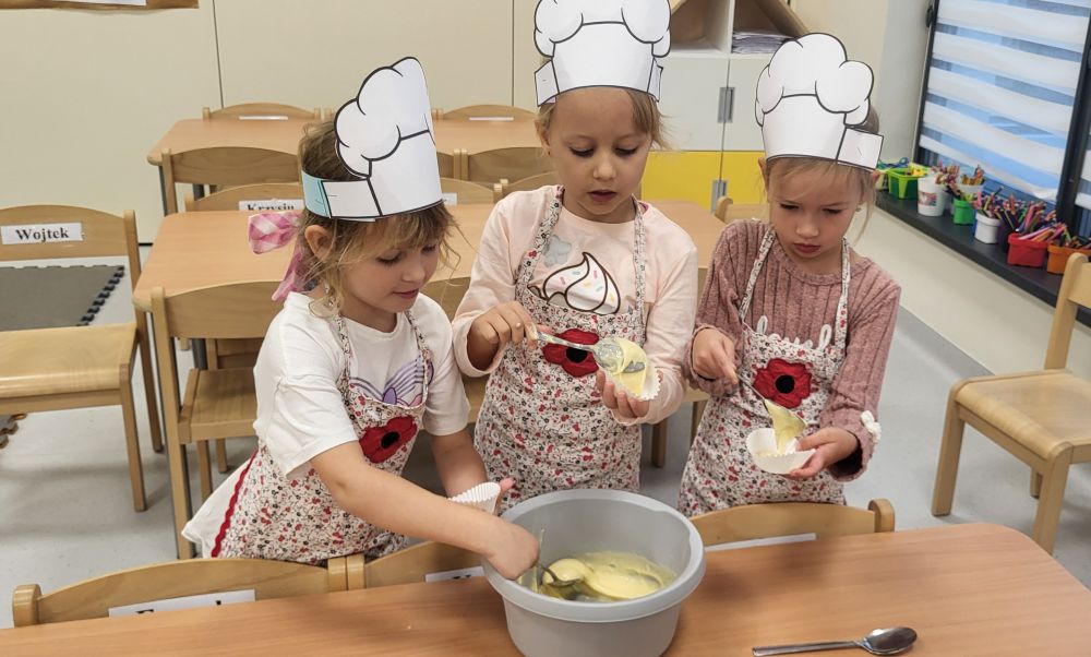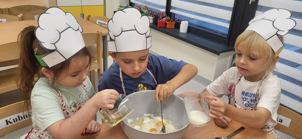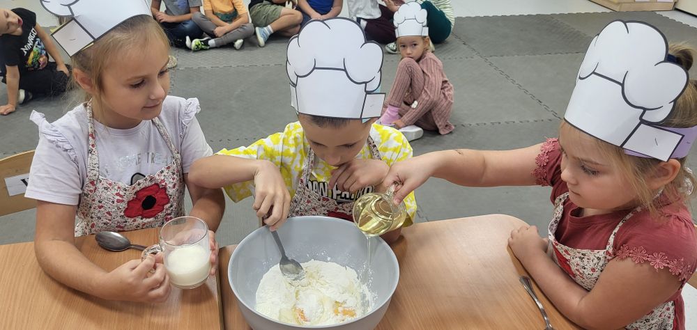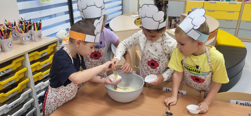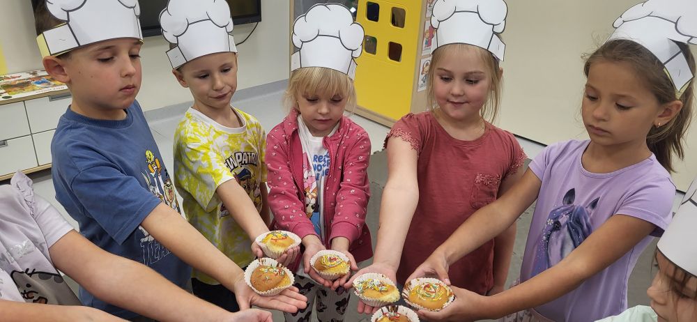 Podczas zajęć kulinarnych dzieci piekły babeczki. Z wielkim zaangażowaniem wykonywały kolejne polecenia, mieszały składniki, odliczały odpowiednie porcje składników, a po upieczeniu dekorowały swoje babeczki. Był to dla wszystkich doskonały i apetyczny deser.