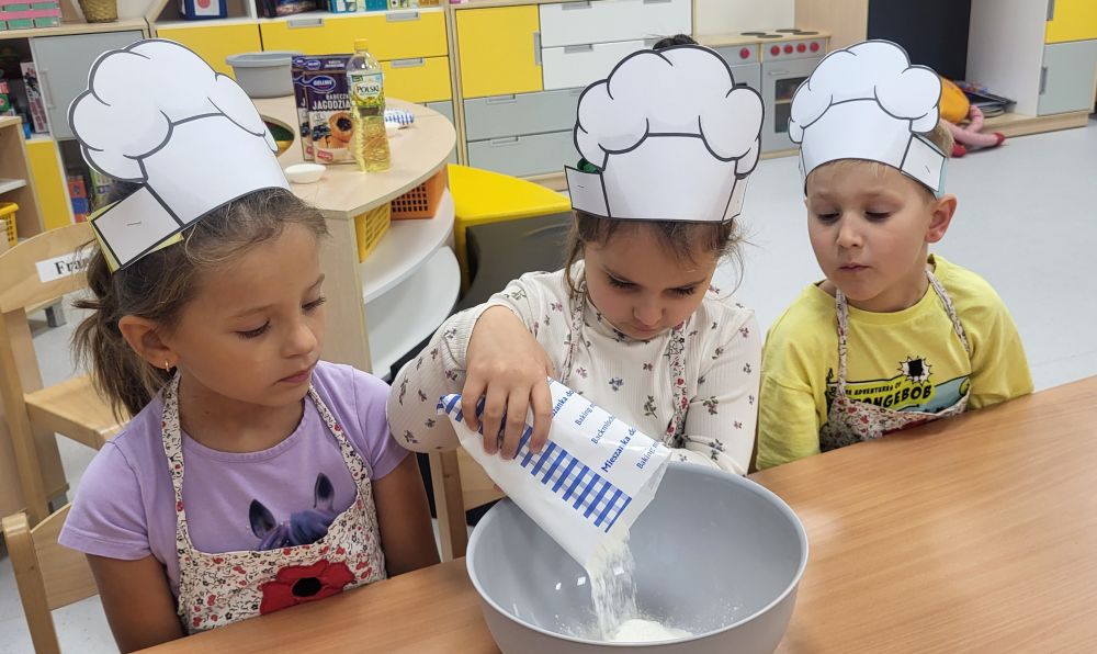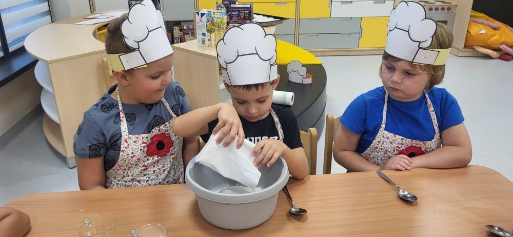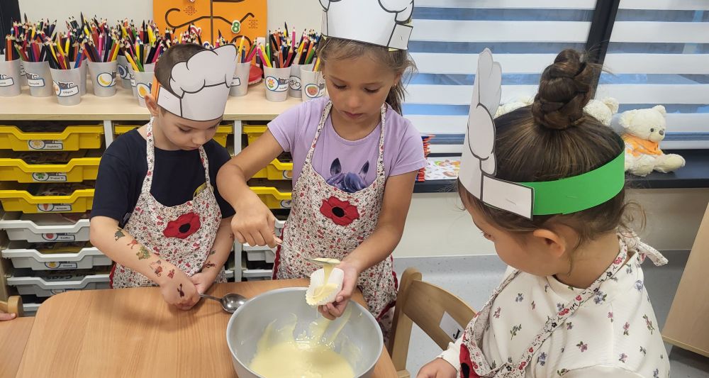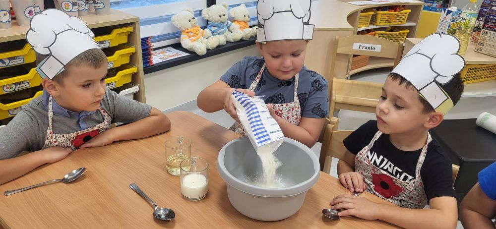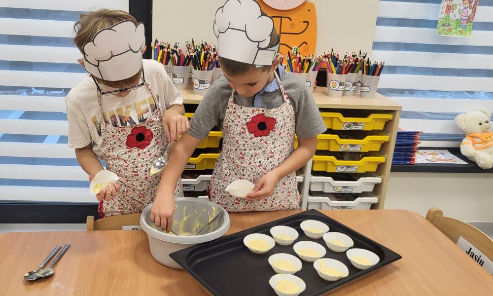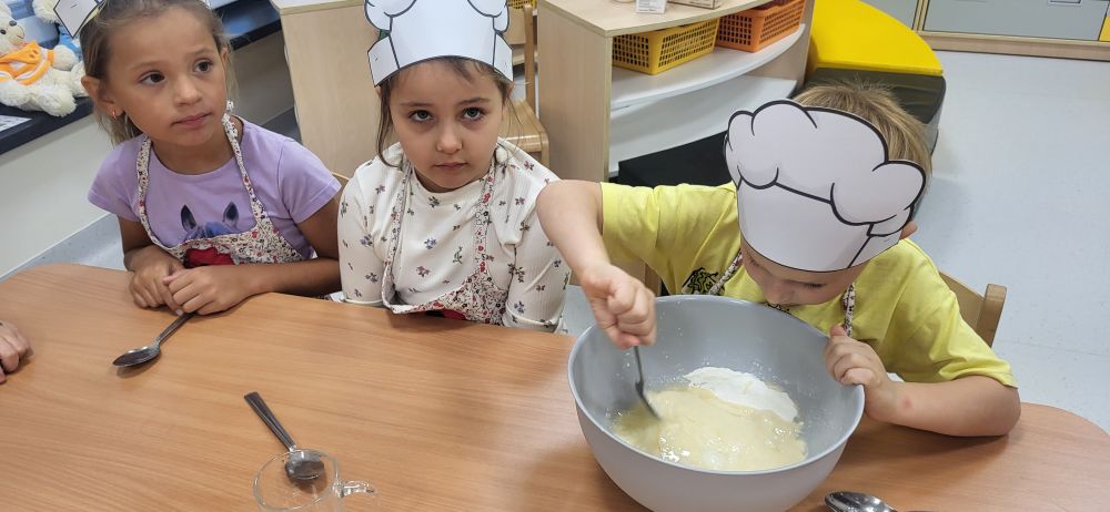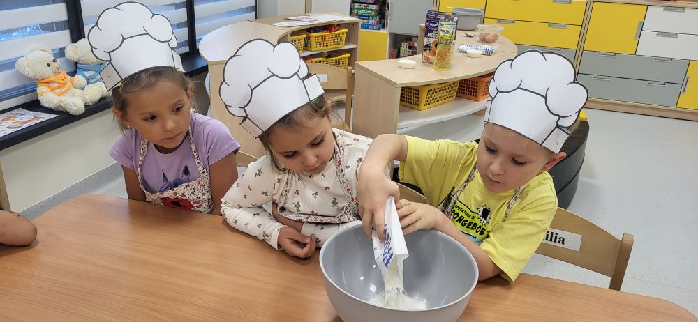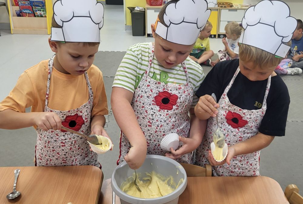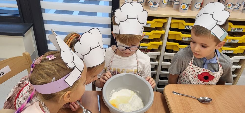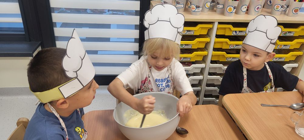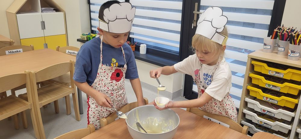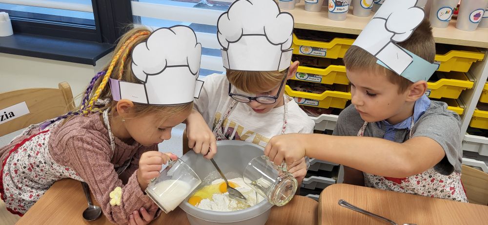 Podczas zajęć kulinarnych dzieci piekły babeczki. Z wielkim zaangażowaniem wykonywały kolejne polecenia, mieszały składniki, odliczały odpowiednie porcje składników, a po upieczeniu dekorowały swoje babeczki. Był to dla wszystkich doskonały i apetyczny deser.
