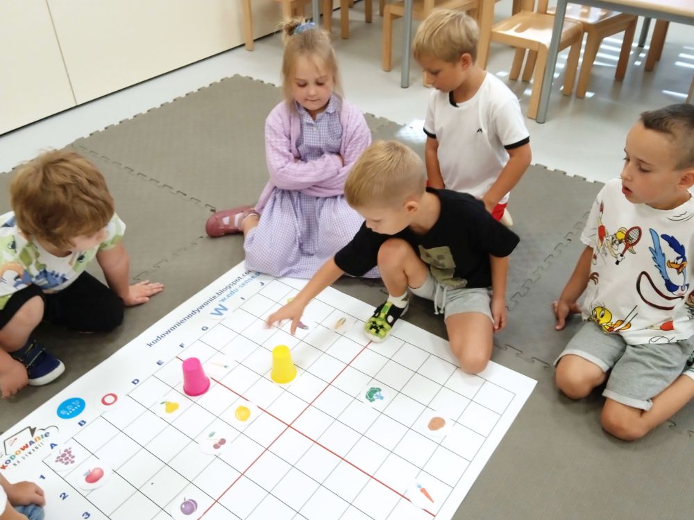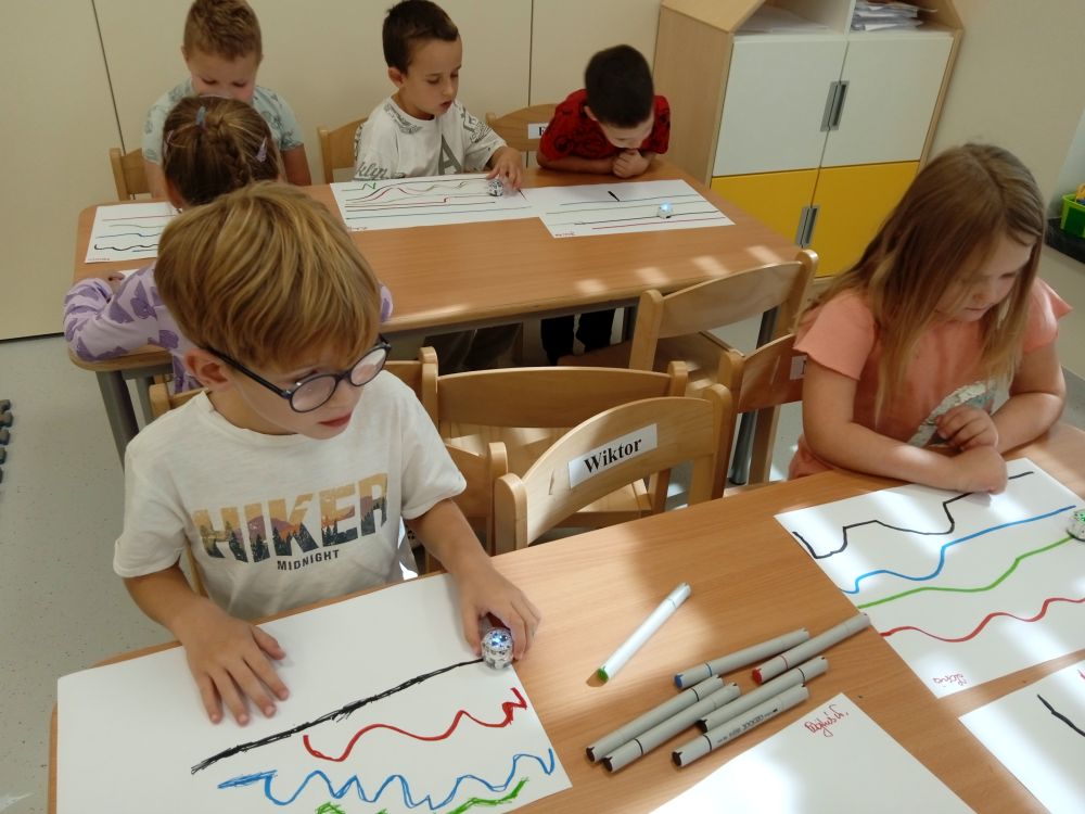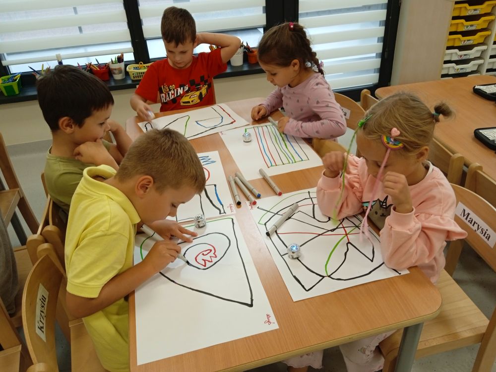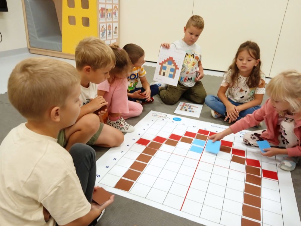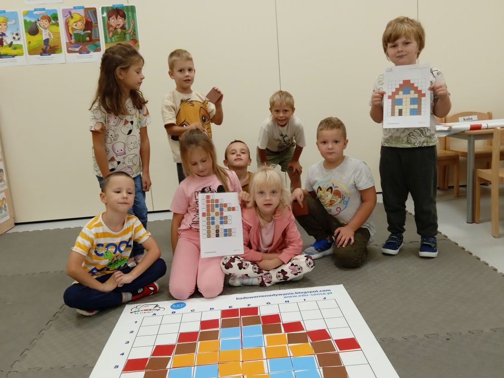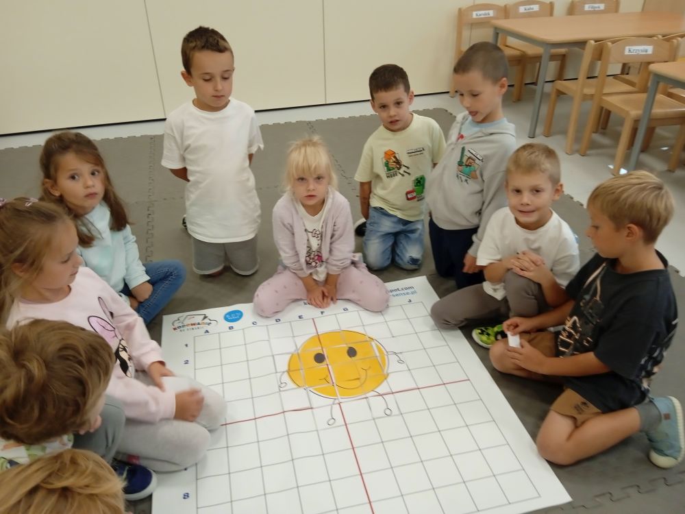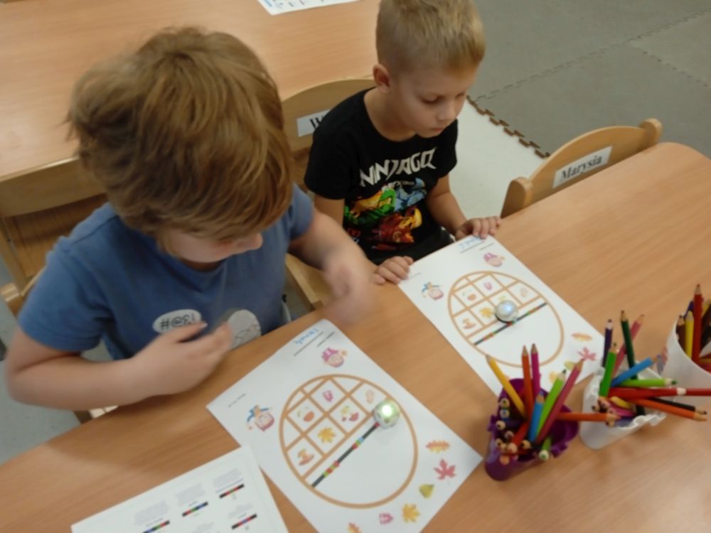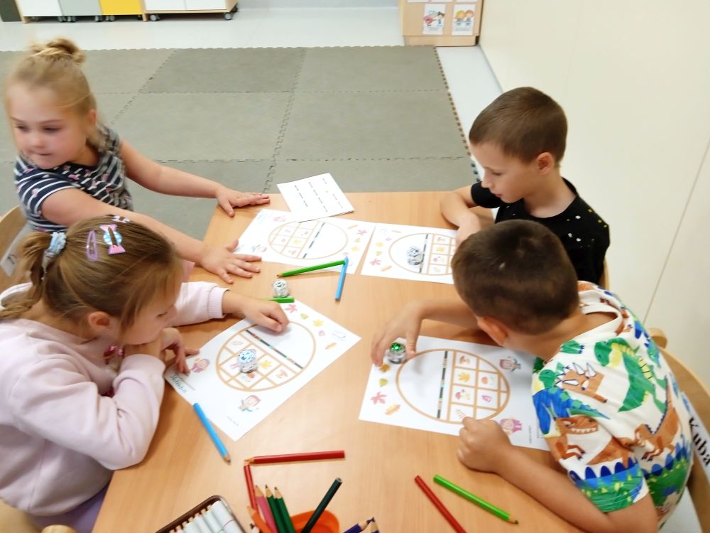 W miesiącu wrześniu dzieci z gr. Kotki realizowały trzy tematy -Witamy w przedszkolu, Ja, ty, my - tworzymy zakodowany grupowy kodeks, Dary jesieni. Poprzez zabawy offline i online zapoznały się z matą do kodowania- posługiwały się pojęciami: w prawo, w lewo, do góry, w dół , odszukiwały na macie pole określone za pomocą dwóch współrzędnych, miały możliwość tworzenia logicznych instrukcji dotyczących codziennych czynności, układały kody z wykorzystaniem symboli. Poznały robota Ozobot Bit oraz zasady jego sterowania - za pomocą kolorowych kodów programowały robota, tak aby poruszał się po wyznaczonej trasie.