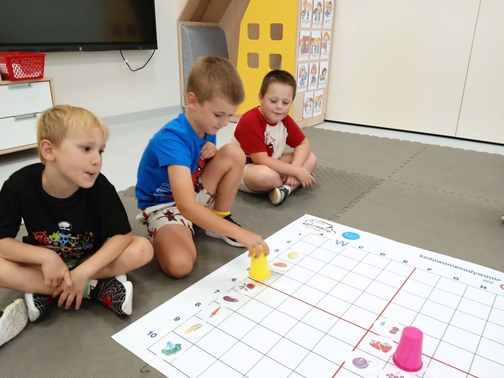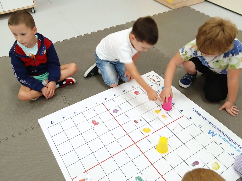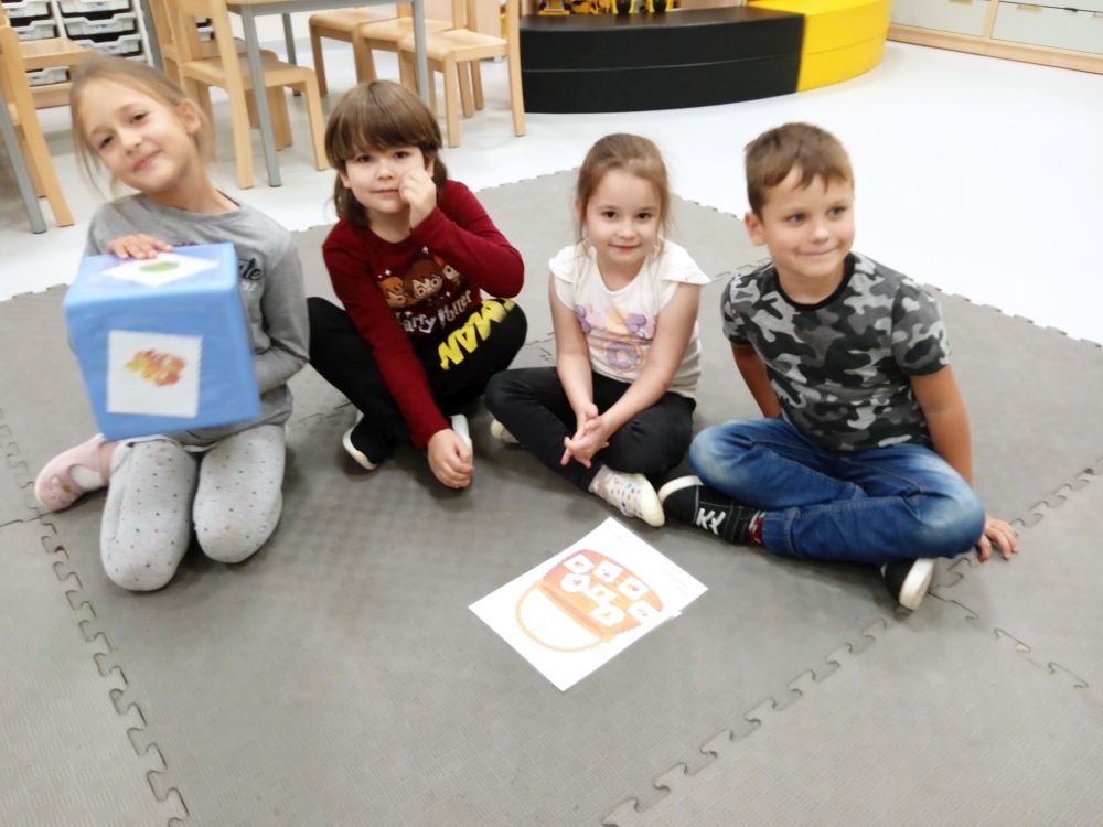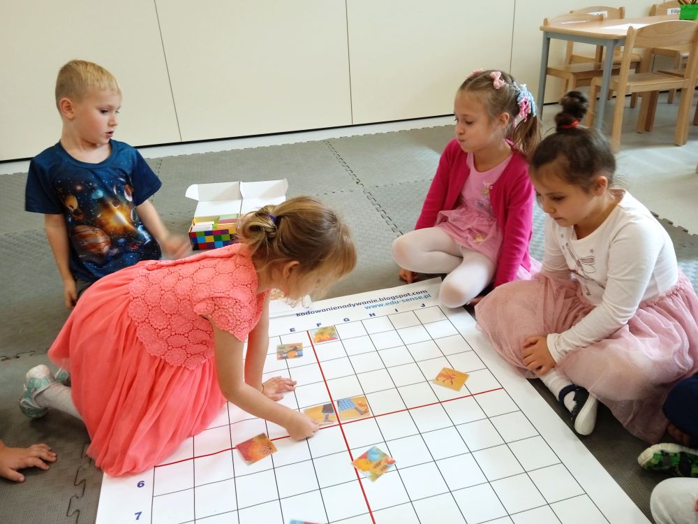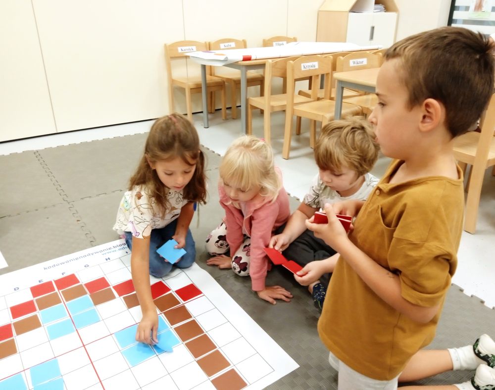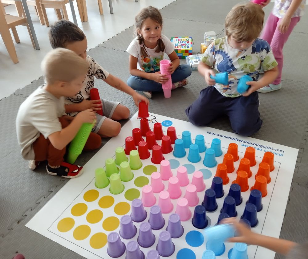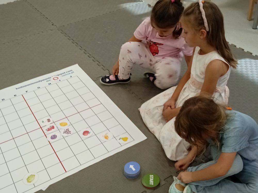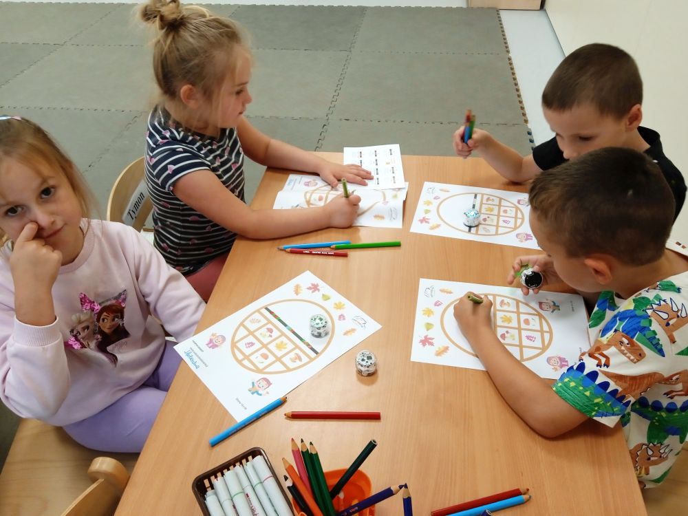 W miesiącu wrześniu dzieci z gr. Kotki realizowały trzy tematy -Witamy w przedszkolu, Ja, ty, my - tworzymy zakodowany grupowy kodeks, Dary jesieni. Poprzez zabawy offline i online zapoznały się z matą do kodowania- posługiwały się pojęciami: w prawo, w lewo, do góry, w dół , odszukiwały na macie pole określone za pomocą dwóch współrzędnych, miały możliwość tworzenia logicznych instrukcji dotyczących codziennych czynności, układały kody z wykorzystaniem symboli. Poznały robota Ozobot Bit oraz zasady jego sterowania - za pomocą kolorowych kodów programowały robota, tak aby poruszał się po wyznaczonej trasie.
