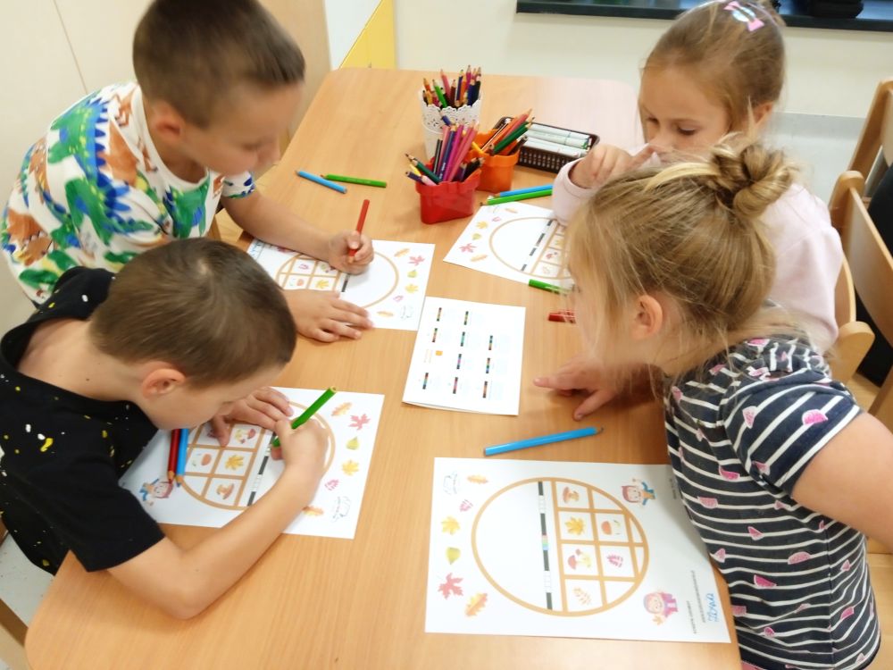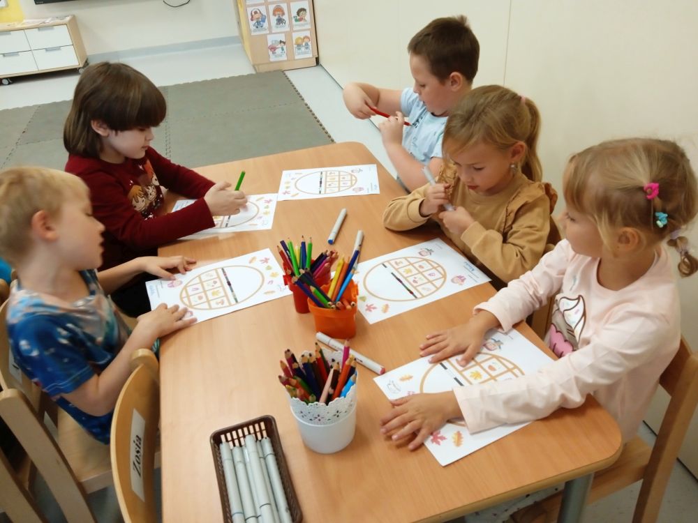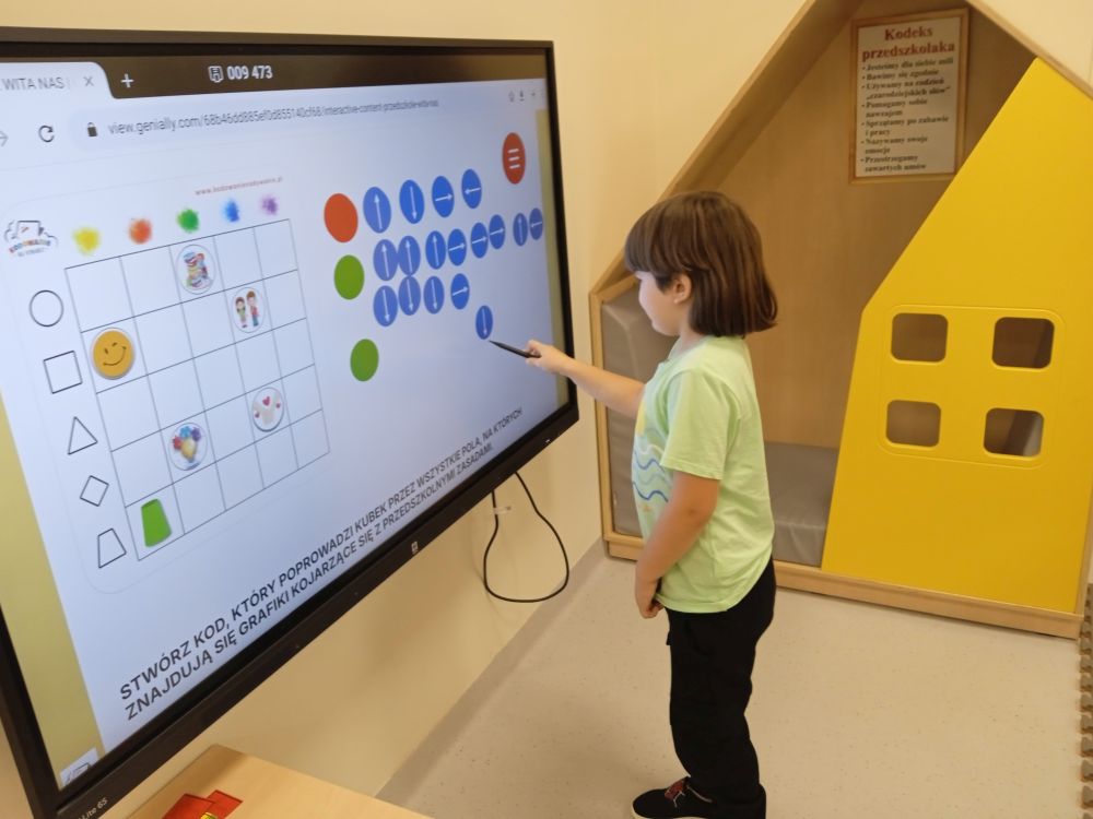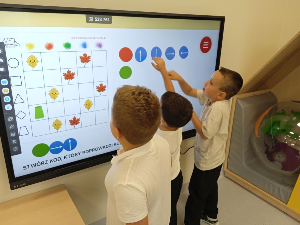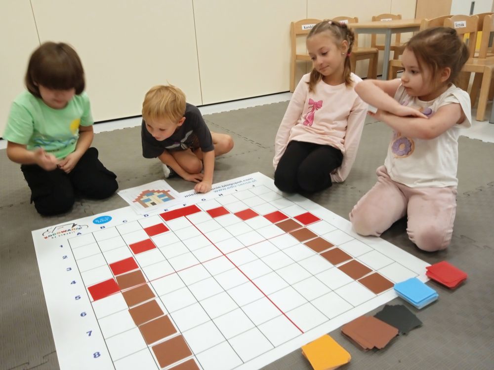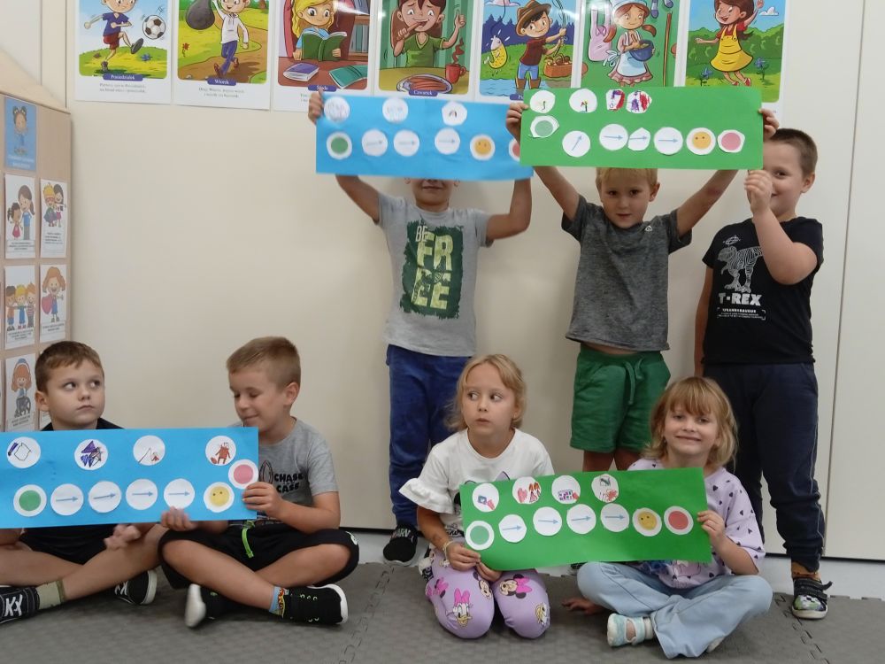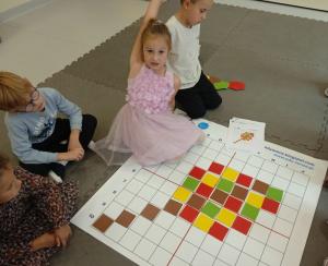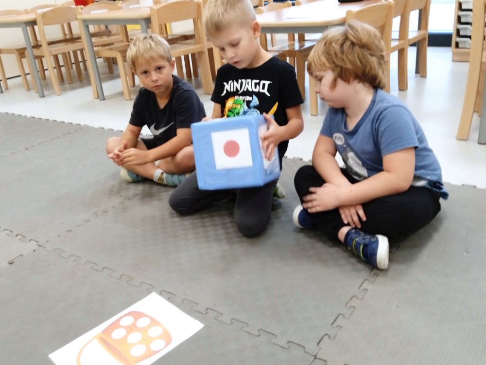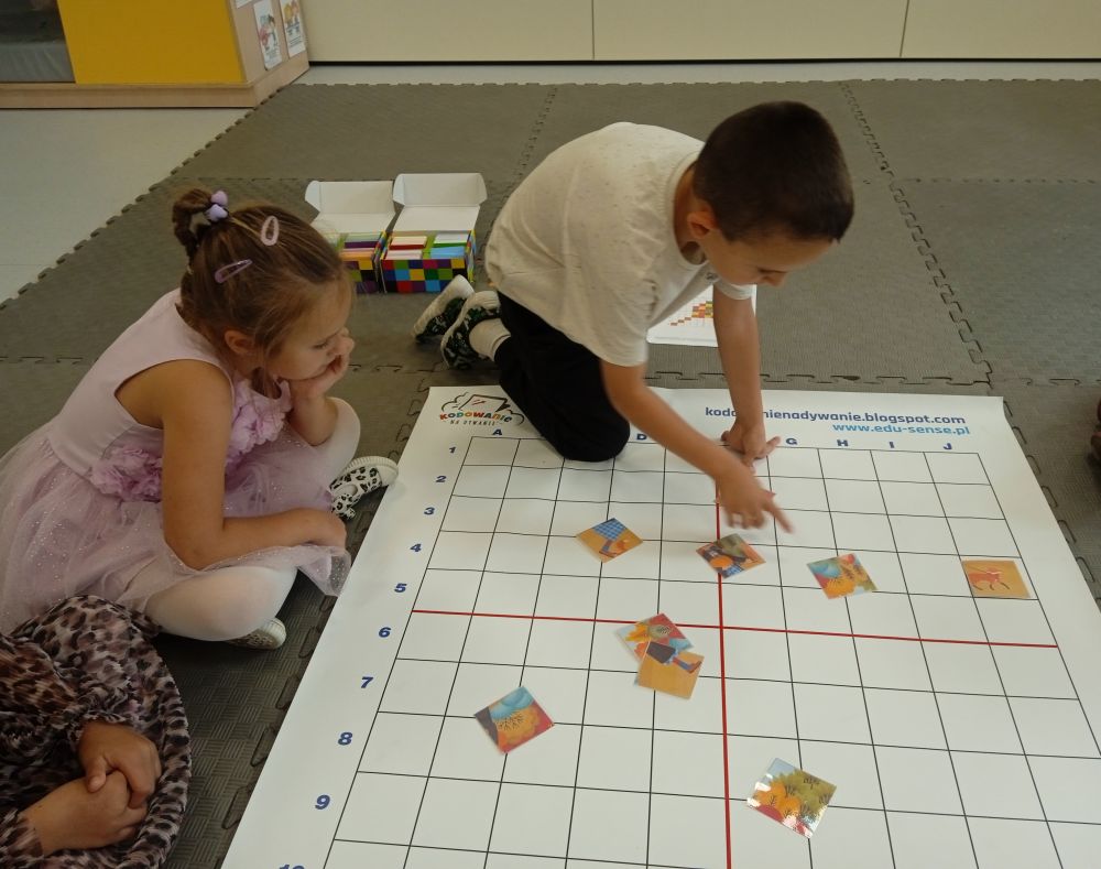 W miesiącu wrześniu dzieci z gr. Kotki realizowały trzy tematy -Witamy w przedszkolu, Ja, ty, my - tworzymy zakodowany grupowy kodeks, Dary jesieni. Poprzez zabawy offline i online zapoznały się z matą do kodowania- posługiwały się pojęciami: w prawo, w lewo, do góry, w dół , odszukiwały na macie pole określone za pomocą dwóch współrzędnych, miały możliwość tworzenia logicznych instrukcji dotyczących codziennych czynności, układały kody z wykorzystaniem symboli. Poznały robota Ozobot Bit oraz zasady jego sterowania - za pomocą kolorowych kodów programowały robota, tak aby poruszał się po wyznaczonej trasie.