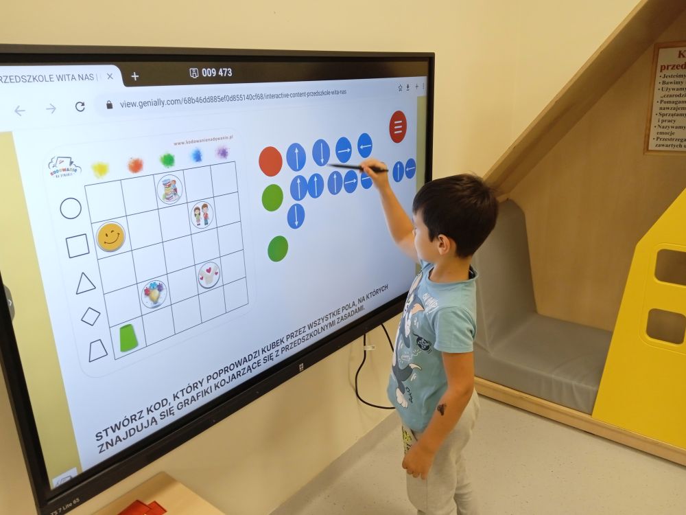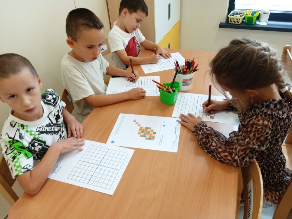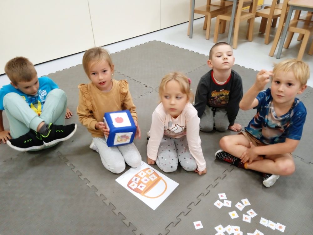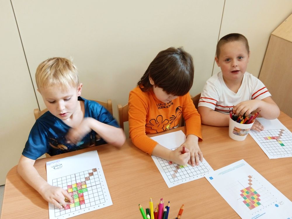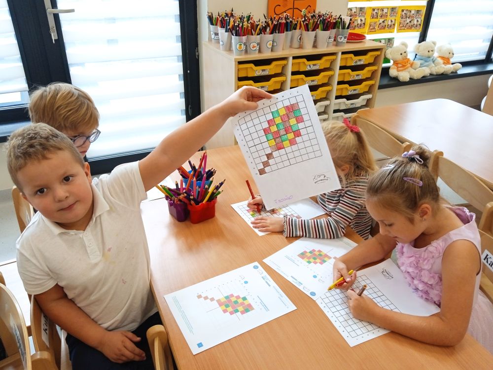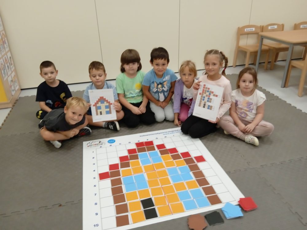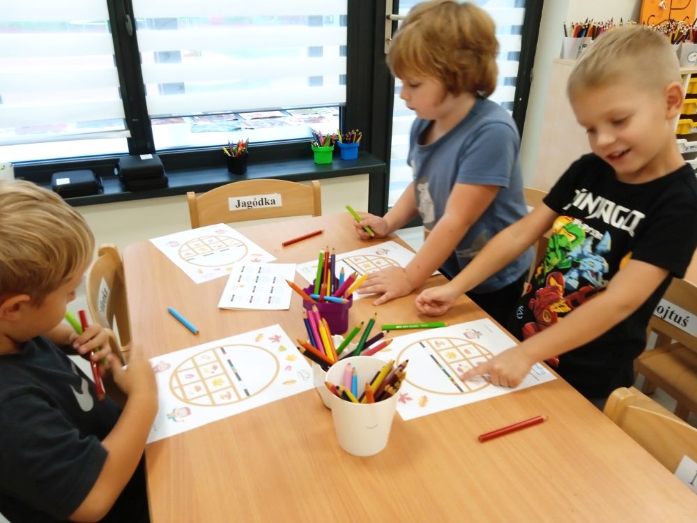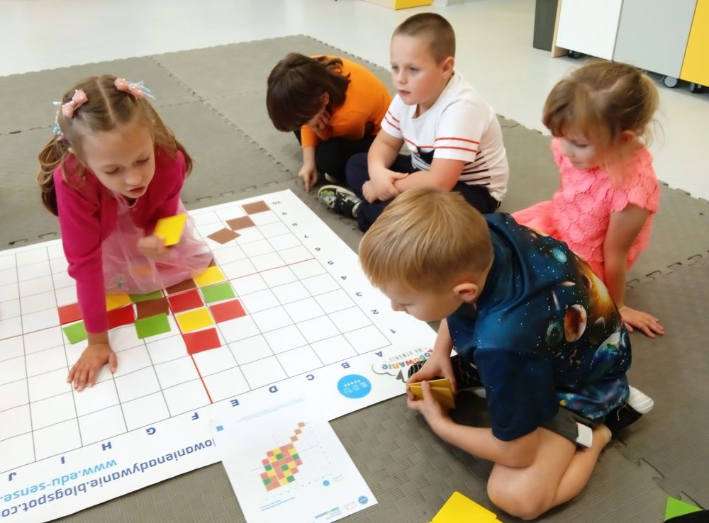 W miesiącu wrześniu dzieci z gr. Kotki realizowały trzy tematy -Witamy w przedszkolu, Ja, ty, my - tworzymy zakodowany grupowy kodeks, Dary jesieni. Poprzez zabawy offline i online zapoznały się z matą do kodowania- posługiwały się pojęciami: w prawo, w lewo, do góry, w dół , odszukiwały na macie pole określone za pomocą dwóch współrzędnych, miały możliwość tworzenia logicznych instrukcji dotyczących codziennych czynności, układały kody z wykorzystaniem symboli. Poznały robota Ozobot Bit oraz zasady jego sterowania - za pomocą kolorowych kodów programowały robota, tak aby poruszał się po wyznaczonej trasie.