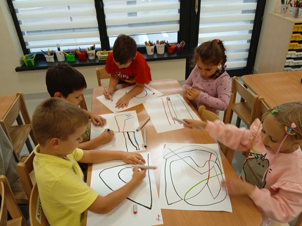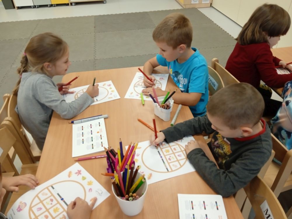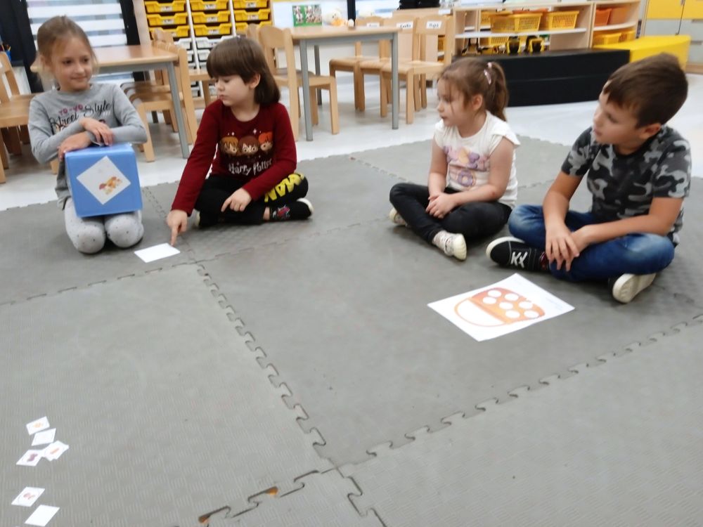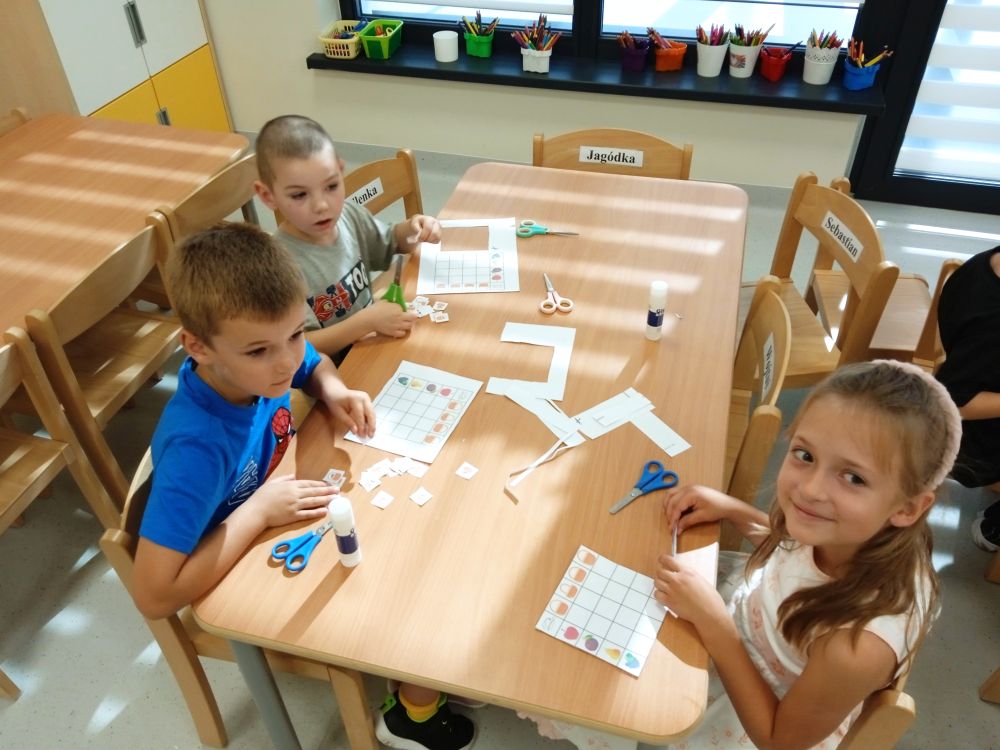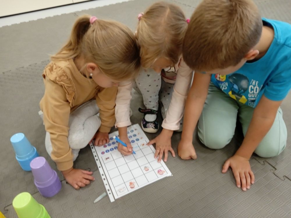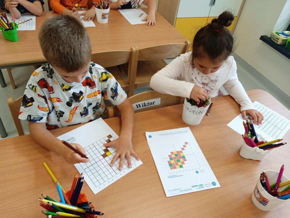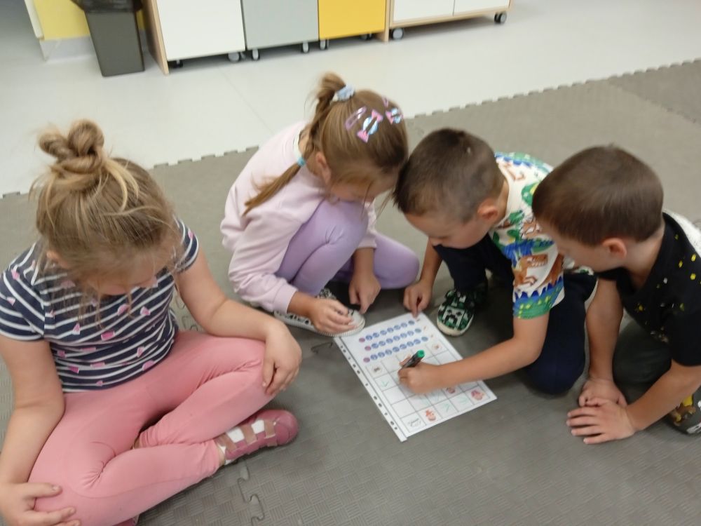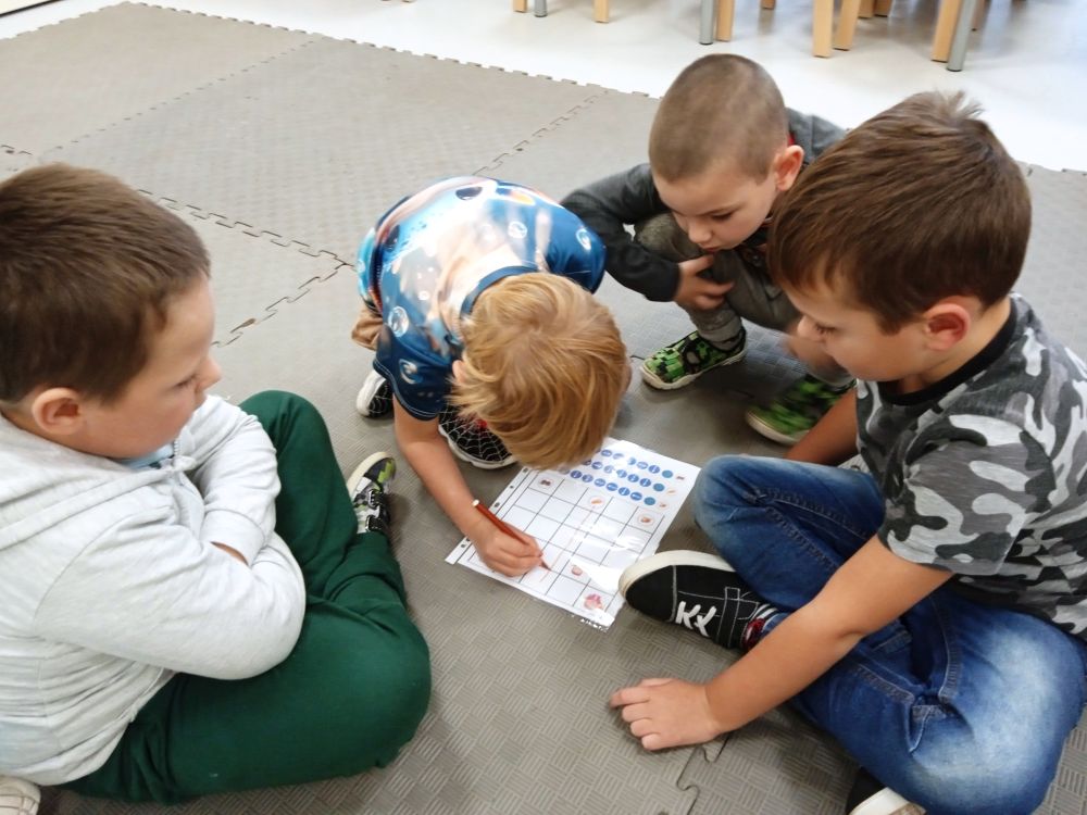W miesiącu wrześniu dzieci z gr. Kotki realizowały trzy tematy -Witamy w przedszkolu, Ja, ty, my - tworzymy zakodowany grupowy kodeks, Dary jesieni. Poprzez zabawy offline i online zapoznały się z matą do kodowania- posługiwały się pojęciami: w prawo, w lewo, do góry, w dół , odszukiwały na macie pole określone za pomocą dwóch współrzędnych, miały możliwość tworzenia logicznych instrukcji dotyczących codziennych czynności, układały kody z wykorzystaniem symboli. Poznały robota Ozobot Bit oraz zasady jego sterowania - za pomocą kolorowych kodów programowały robota, tak aby poruszał się po wyznaczonej trasie.