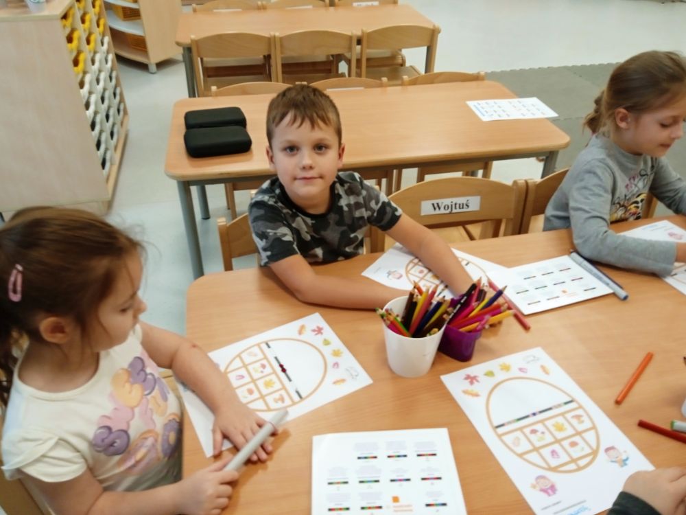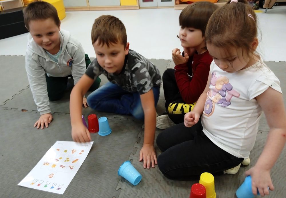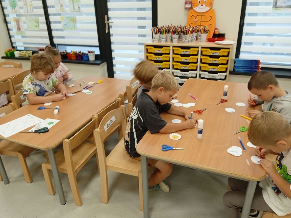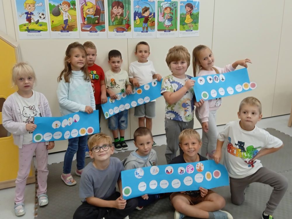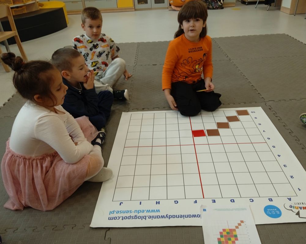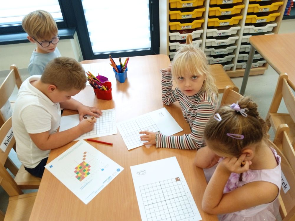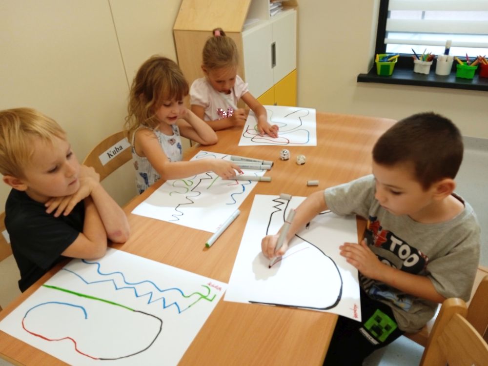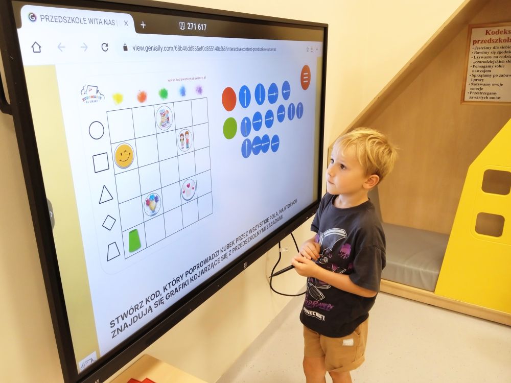 W miesiącu wrześniu dzieci z gr. Kotki realizowały trzy tematy -Witamy w przedszkolu, Ja, ty, my - tworzymy zakodowany grupowy kodeks, Dary jesieni. Poprzez zabawy offline i online zapoznały się z matą do kodowania- posługiwały się pojęciami: w prawo, w lewo, do góry, w dół , odszukiwały na macie pole określone za pomocą dwóch współrzędnych, miały możliwość tworzenia logicznych instrukcji dotyczących codziennych czynności, układały kody z wykorzystaniem symboli. Poznały robota Ozobot Bit oraz zasady jego sterowania - za pomocą kolorowych kodów programowały robota, tak aby poruszał się po wyznaczonej trasie.