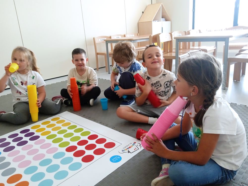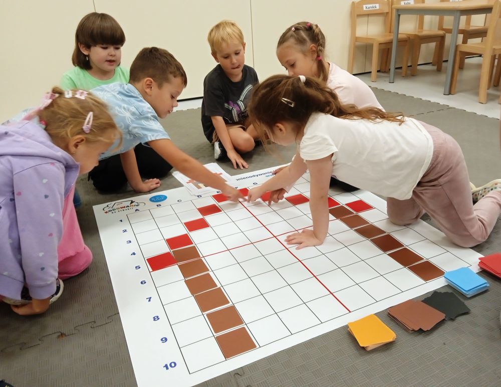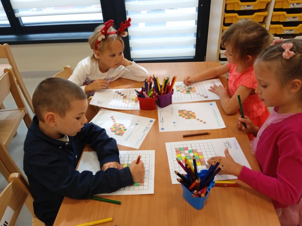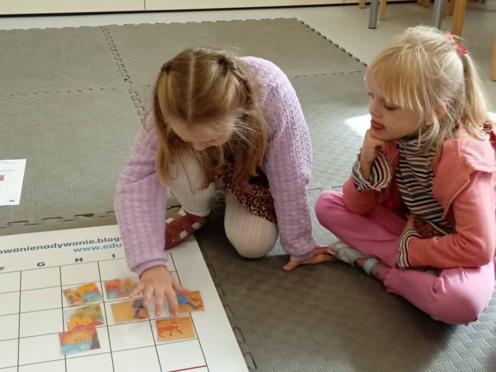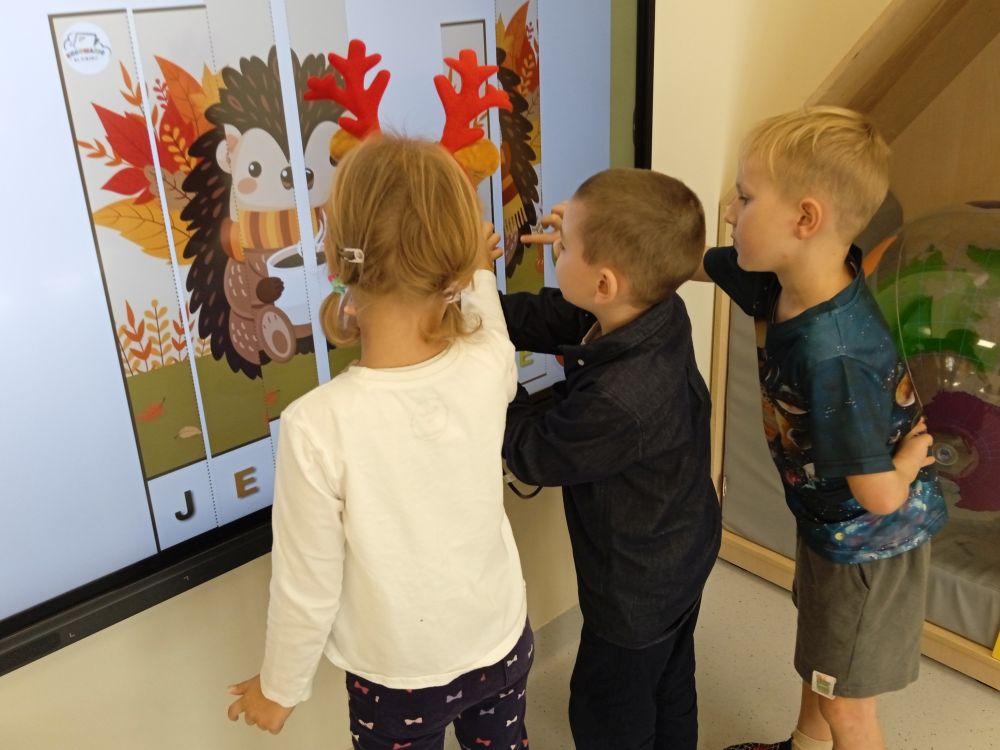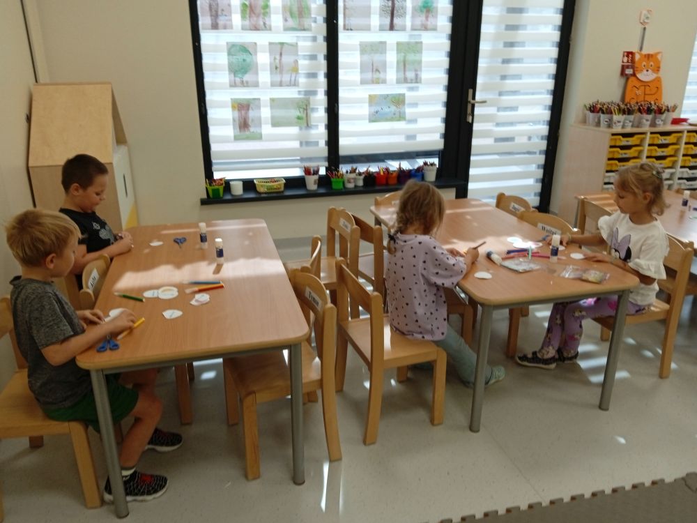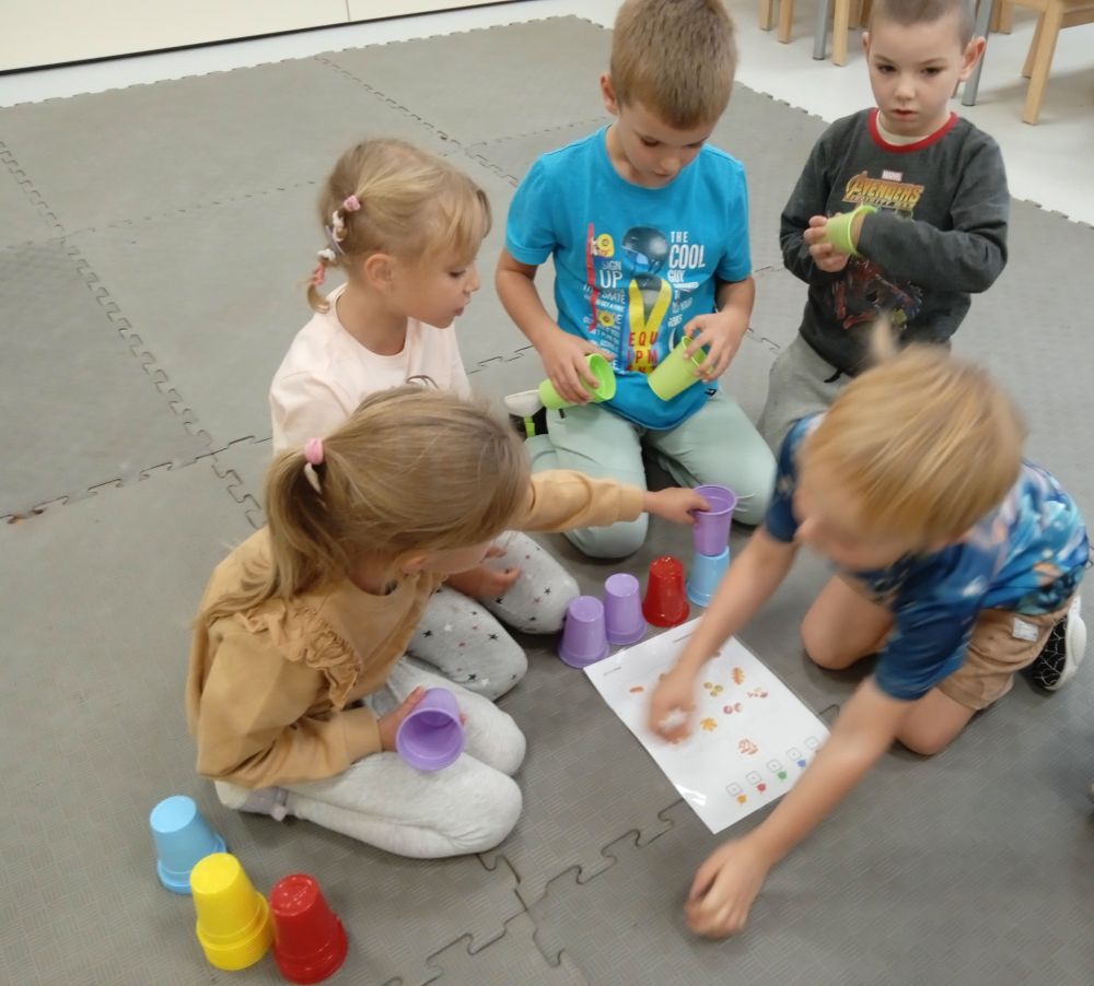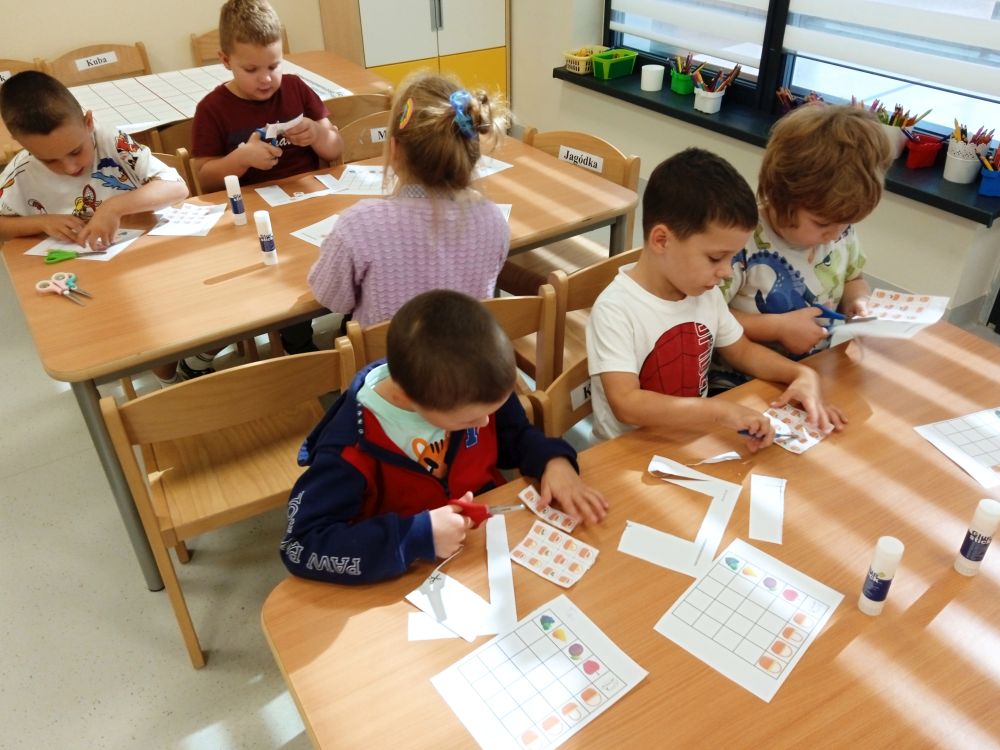 W miesiącu wrześniu dzieci z gr. Kotki realizowały trzy tematy -Witamy w przedszkolu, Ja, ty, my - tworzymy zakodowany grupowy kodeks, Dary jesieni. Poprzez zabawy offline i online zapoznały się z matą do kodowania- posługiwały się pojęciami: w prawo, w lewo, do góry, w dół , odszukiwały na macie pole określone za pomocą dwóch współrzędnych, miały możliwość tworzenia logicznych instrukcji dotyczących codziennych czynności, układały kody z wykorzystaniem symboli. Poznały robota Ozobot Bit oraz zasady jego sterowania - za pomocą kolorowych kodów programowały robota, tak aby poruszał się po wyznaczonej trasie.