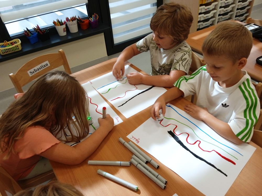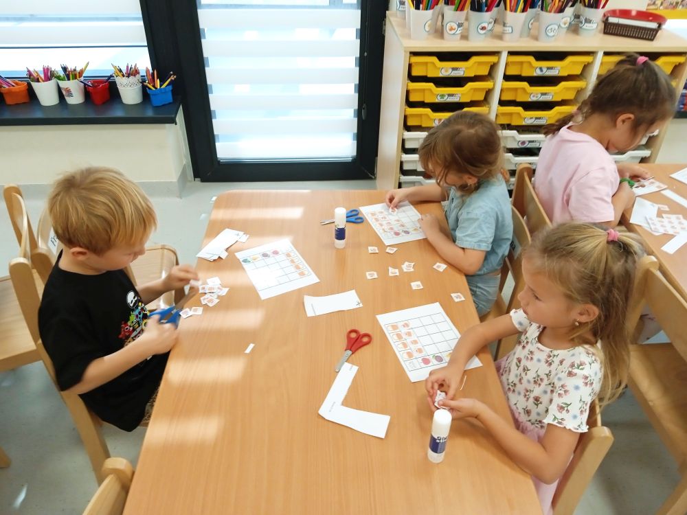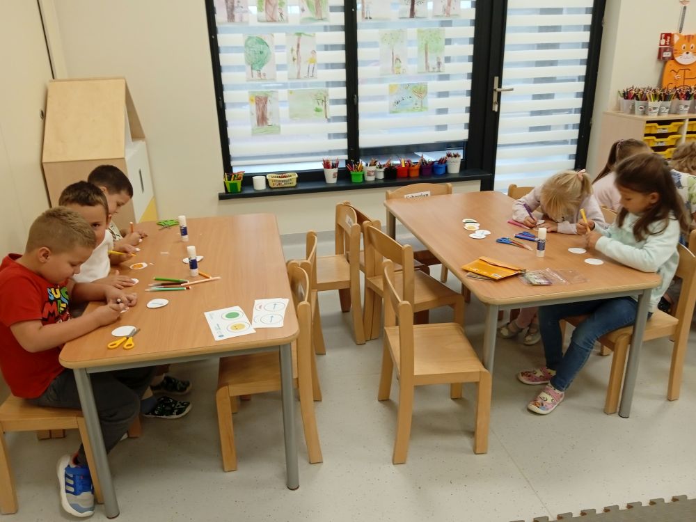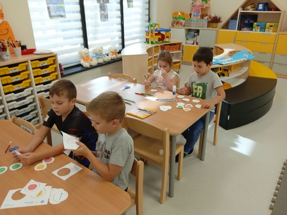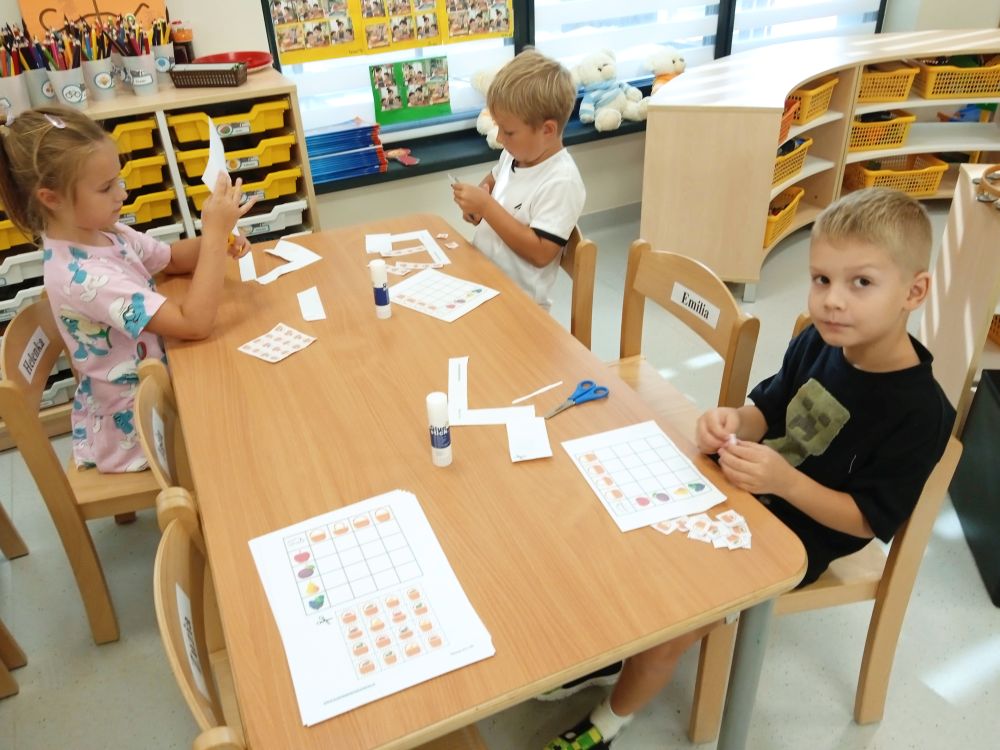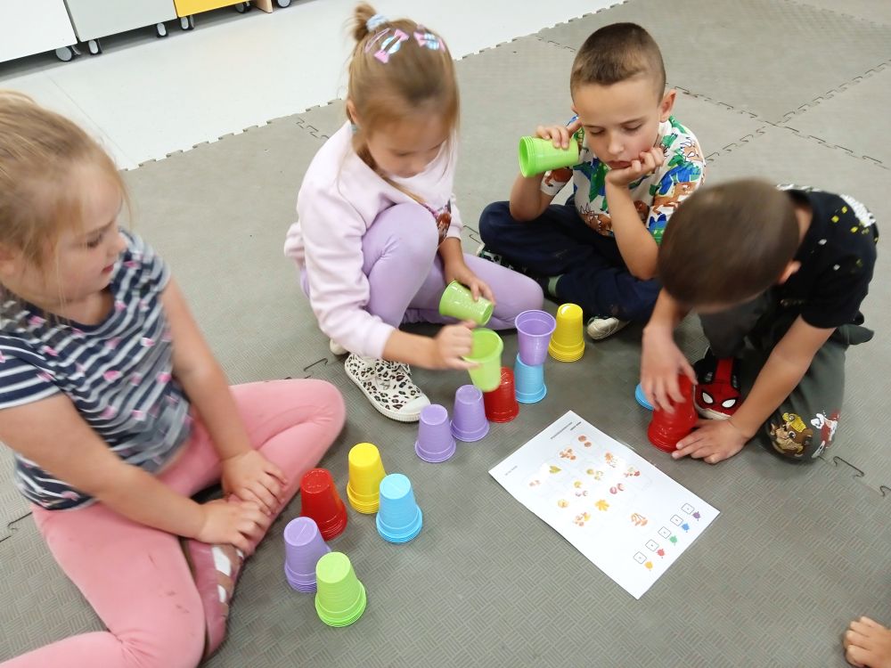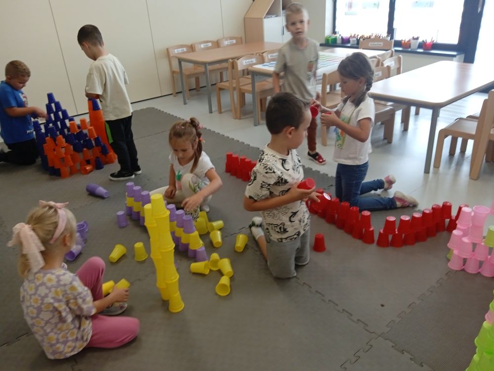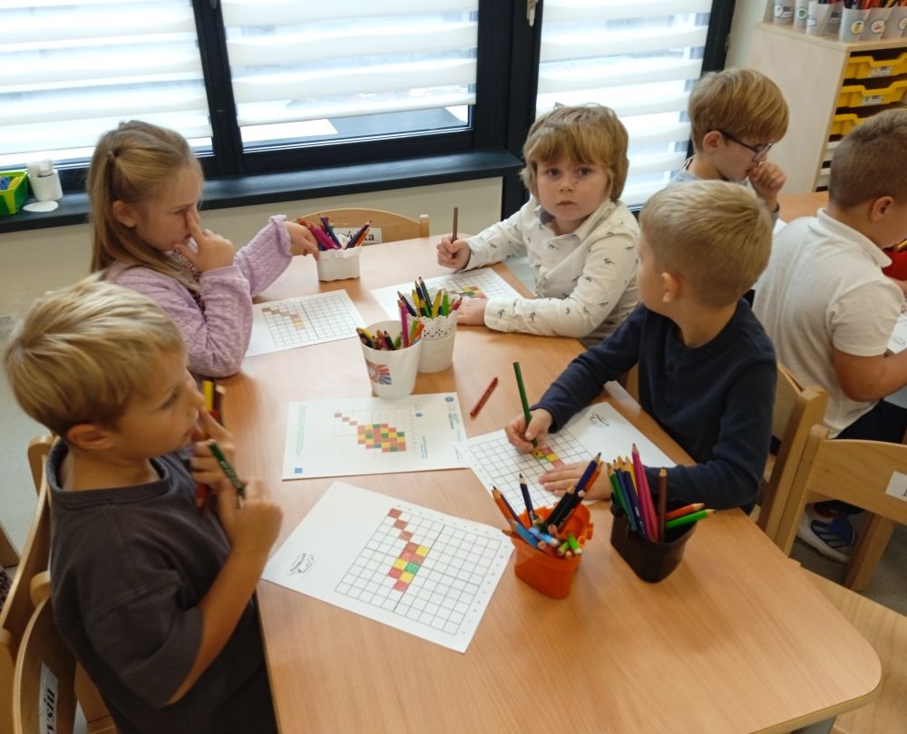 W miesiącu wrześniu dzieci z gr. Kotki realizowały trzy tematy -Witamy w przedszkolu, Ja, ty, my - tworzymy zakodowany grupowy kodeks, Dary jesieni. Poprzez zabawy offline i online zapoznały się z matą do kodowania- posługiwały się pojęciami: w prawo, w lewo, do góry, w dół , odszukiwały na macie pole określone za pomocą dwóch współrzędnych, miały możliwość tworzenia logicznych instrukcji dotyczących codziennych czynności, układały kody z wykorzystaniem symboli. Poznały robota Ozobot Bit oraz zasady jego sterowania - za pomocą kolorowych kodów programowały robota, tak aby poruszał się po wyznaczonej trasie.