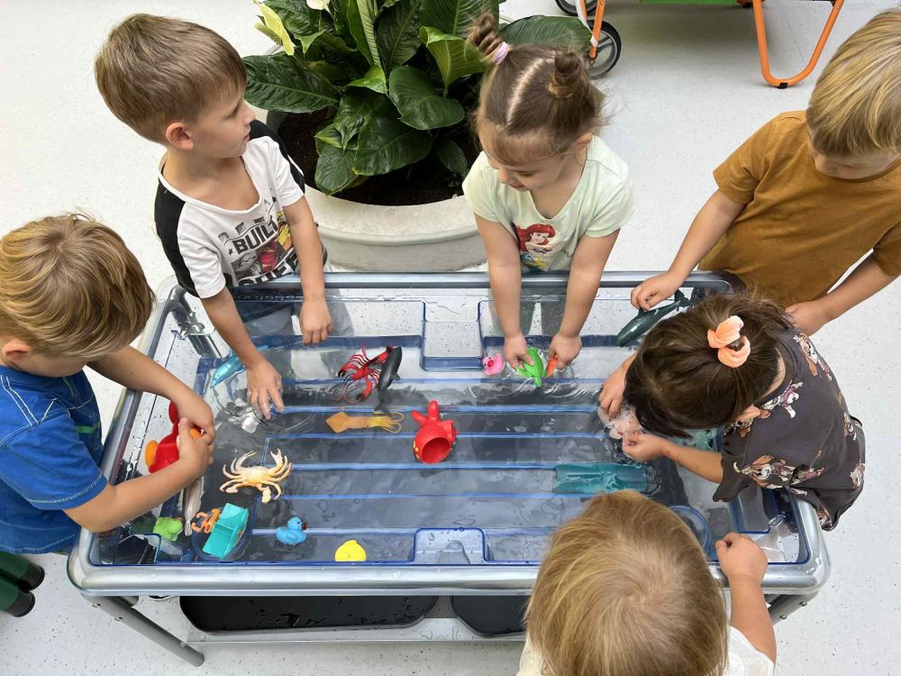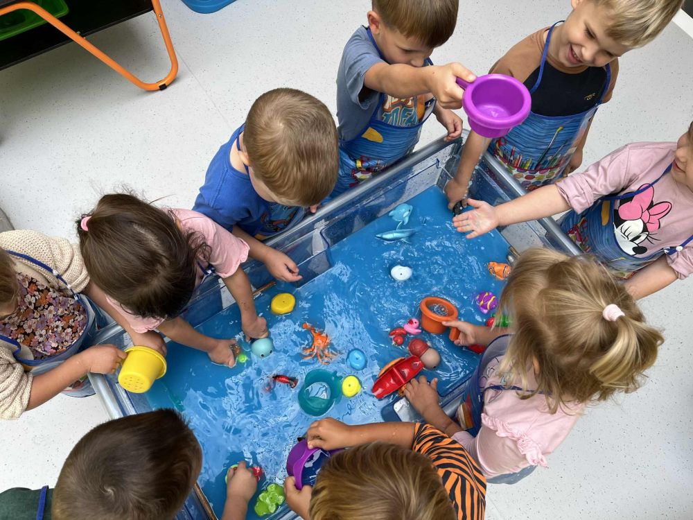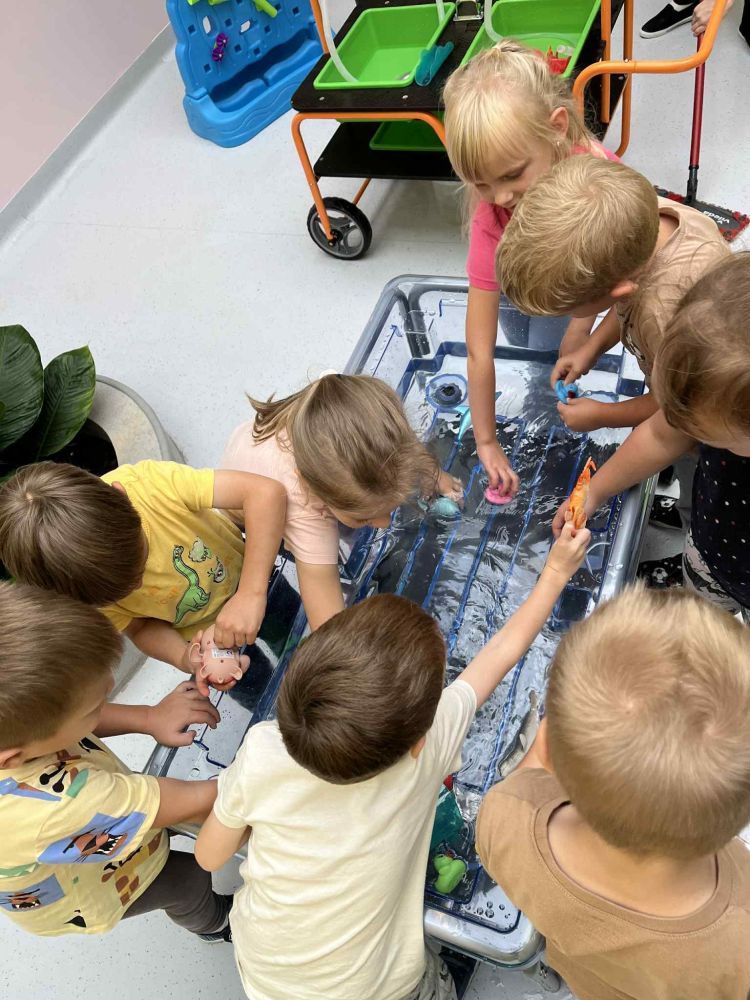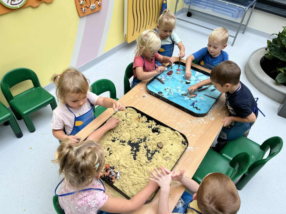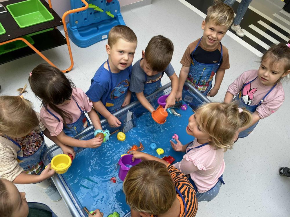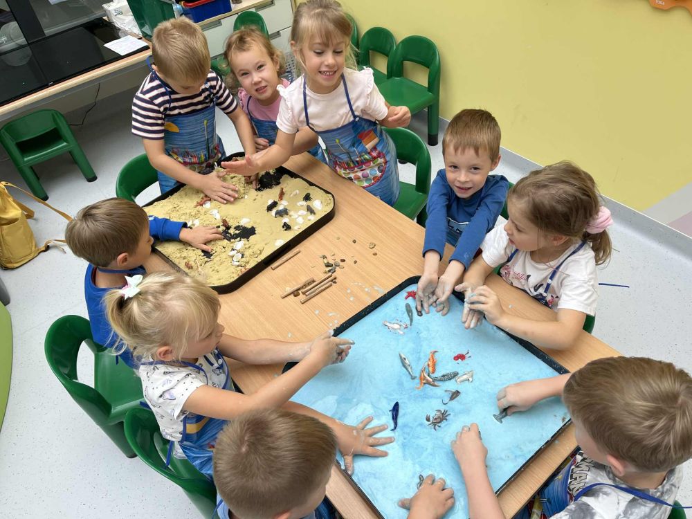 Podczas zajęć najmłodsi przenieśli się również w podwodny świat – zanurzając się w „oceanicznych głębinach”, tworzyli własne, niepowtarzalne wodne królestwa, odkrywając przy tym tajemnice, jakie kryje morze. Zabawa w wodzie i tworzenie morskich przestrzeni pobudzały ich wyobraźnię, kreatywność oraz wspierały rozwój współpracy w grupie.