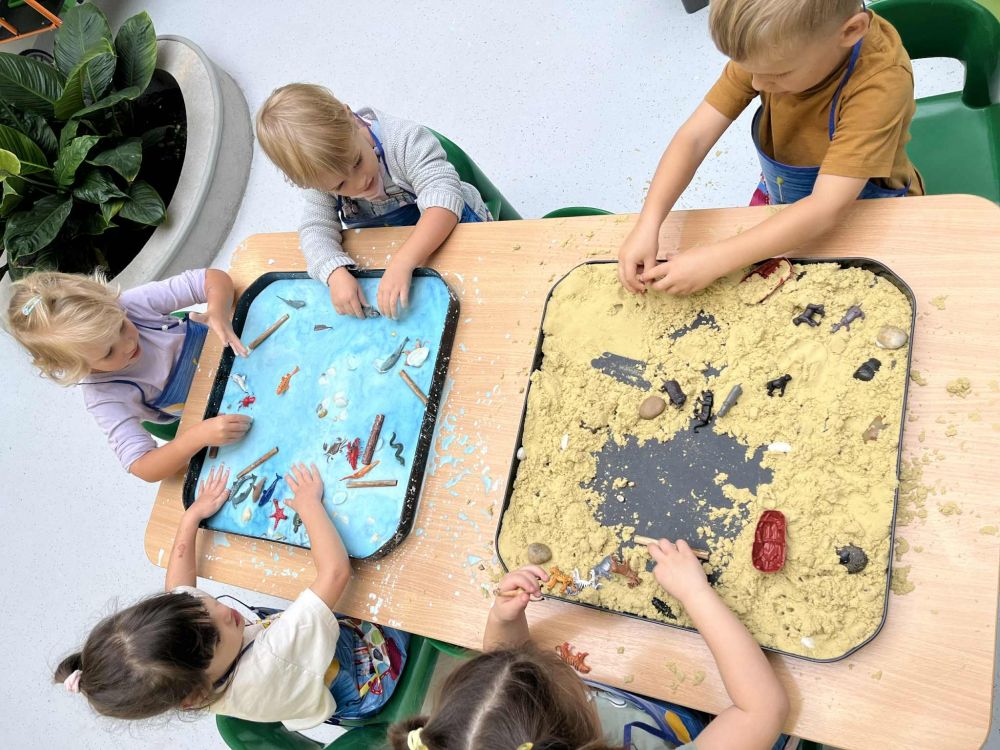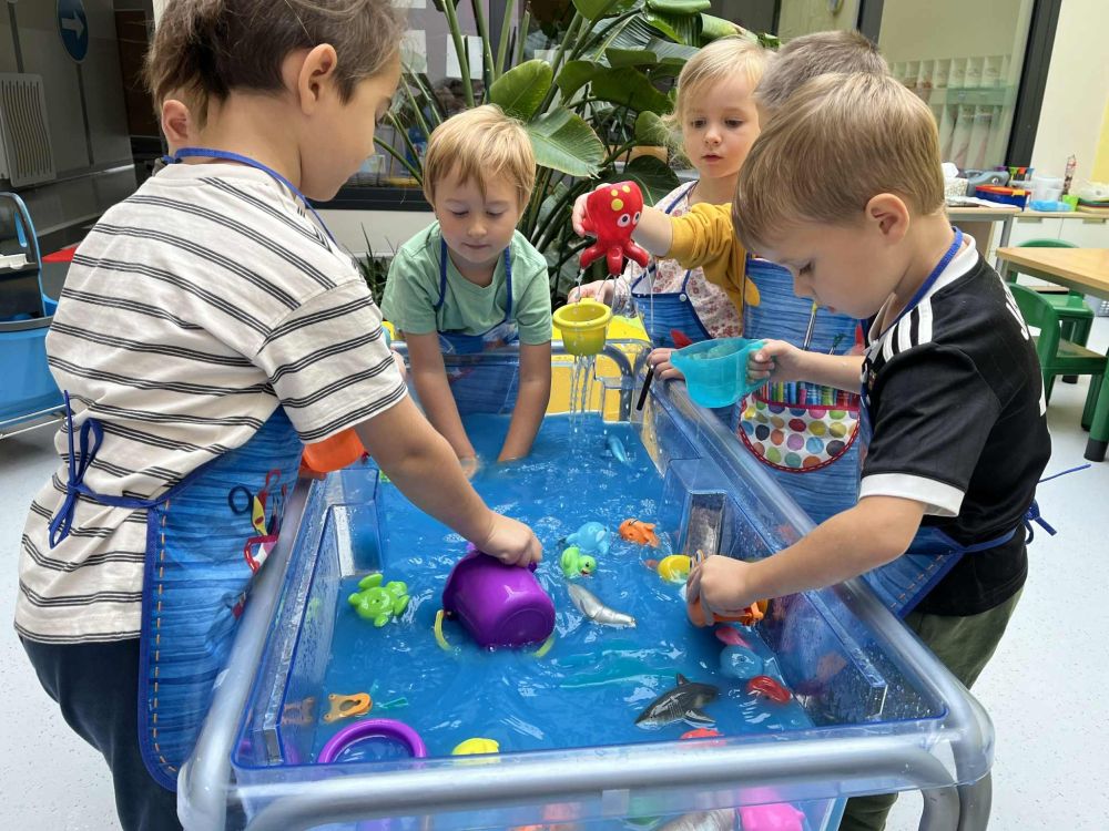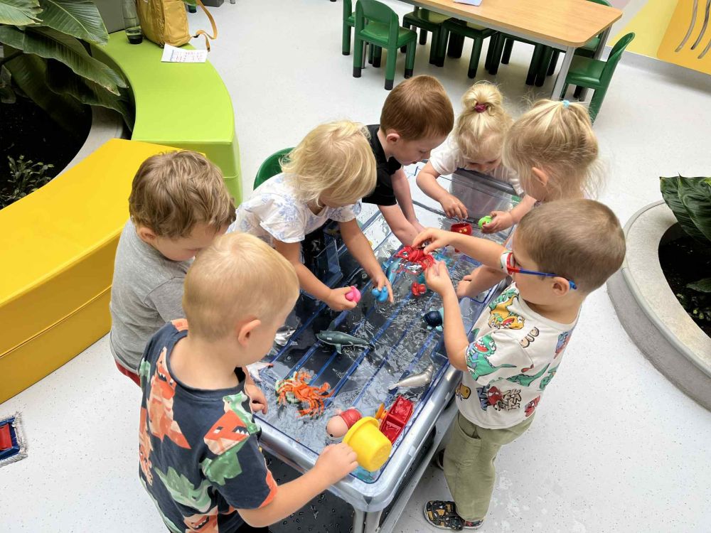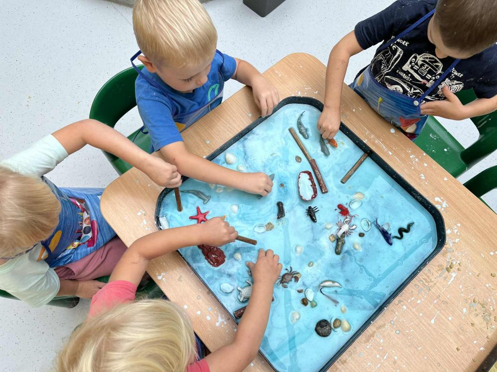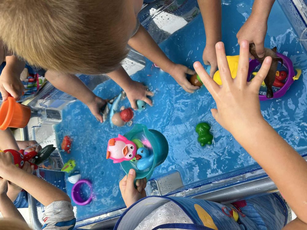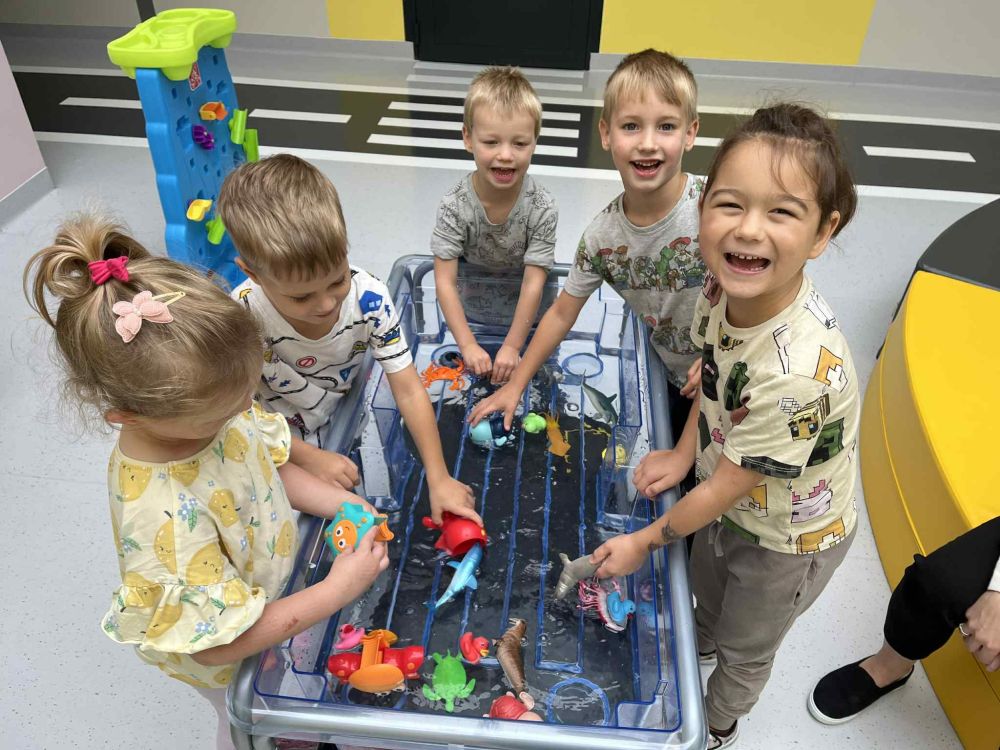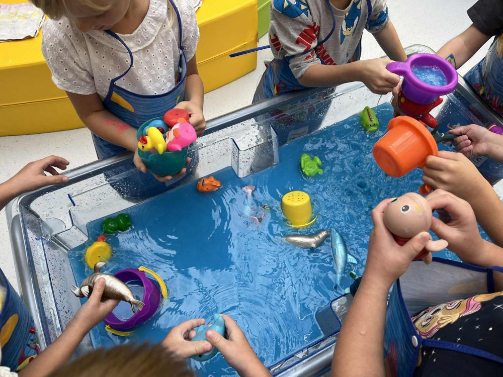 Podczas zajęć najmłodsi przenieśli się również w podwodny świat – zanurzając się w „oceanicznych głębinach”, tworzyli własne, niepowtarzalne wodne królestwa, odkrywając przy tym tajemnice, jakie kryje morze. Zabawa w wodzie i tworzenie morskich przestrzeni pobudzały ich wyobraźnię, kreatywność oraz wspierały rozwój współpracy w grupie.