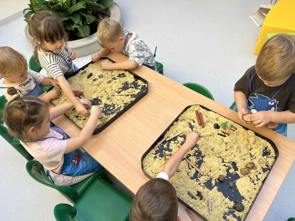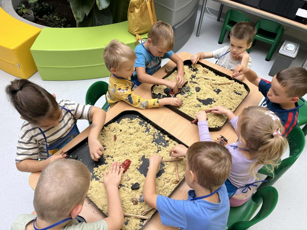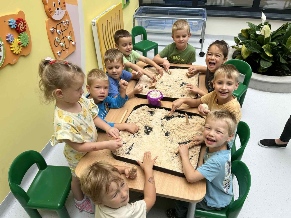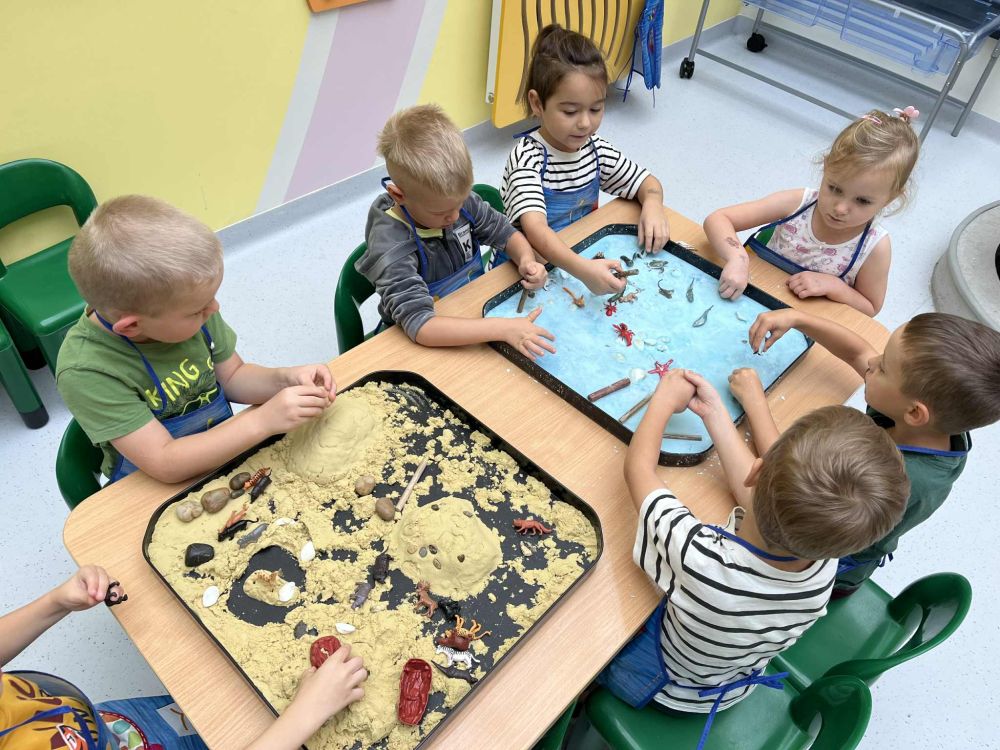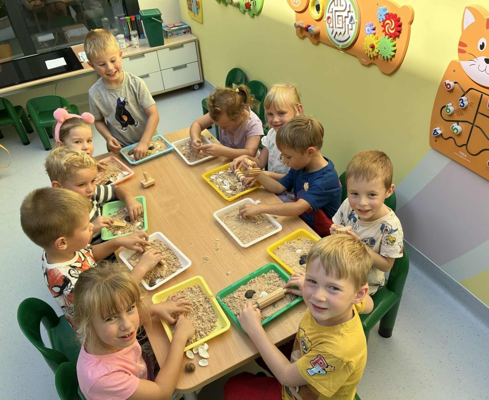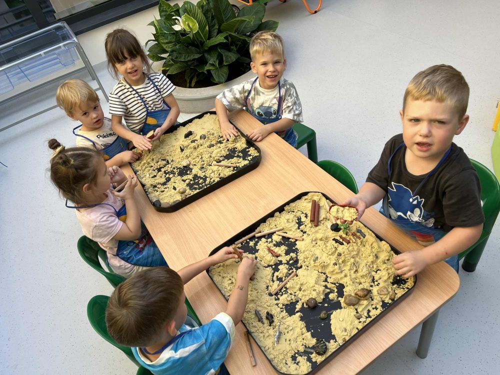 We wrześniu nasze grupy projektowe uczestniczące w zajęciach z zakresu sensoryki wyruszyły w wyjątkową podróż pełną wrażeń i odkryć. Celem spotkań było stymulowanie zmysłów, rozwijanie małej motoryki oraz budowanie kompetencji społecznych poprzez zabawę i twórcze eksperymenty. Dzieci miały okazję doświadczyć różnorodnych faktur mas sensorycznych – od delikatnego, suchego piasku, który przywoływał wspomnienia letnich dni, po mokry piasek, pozwalający na nowe, nieoczywiste odkrycia. Przedszkolaki z ogromnym zaangażowaniem poszukiwały skarbów ukrytych w piasku, co rozwijało ich ciekawość, spostrzegawczość oraz zdolności manualne.