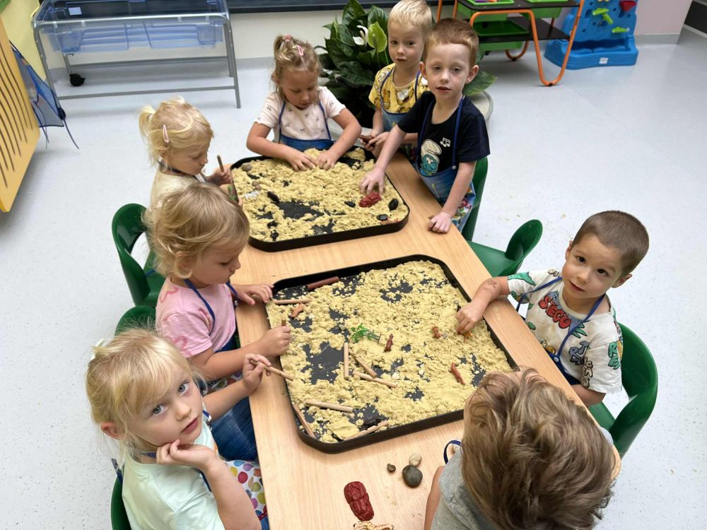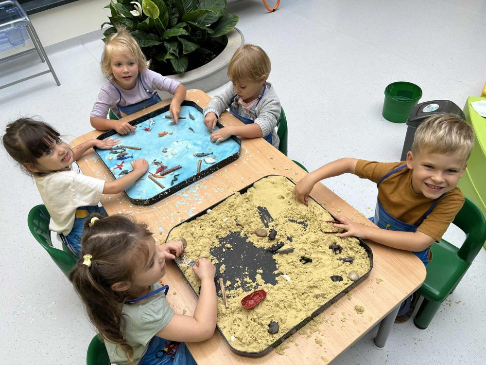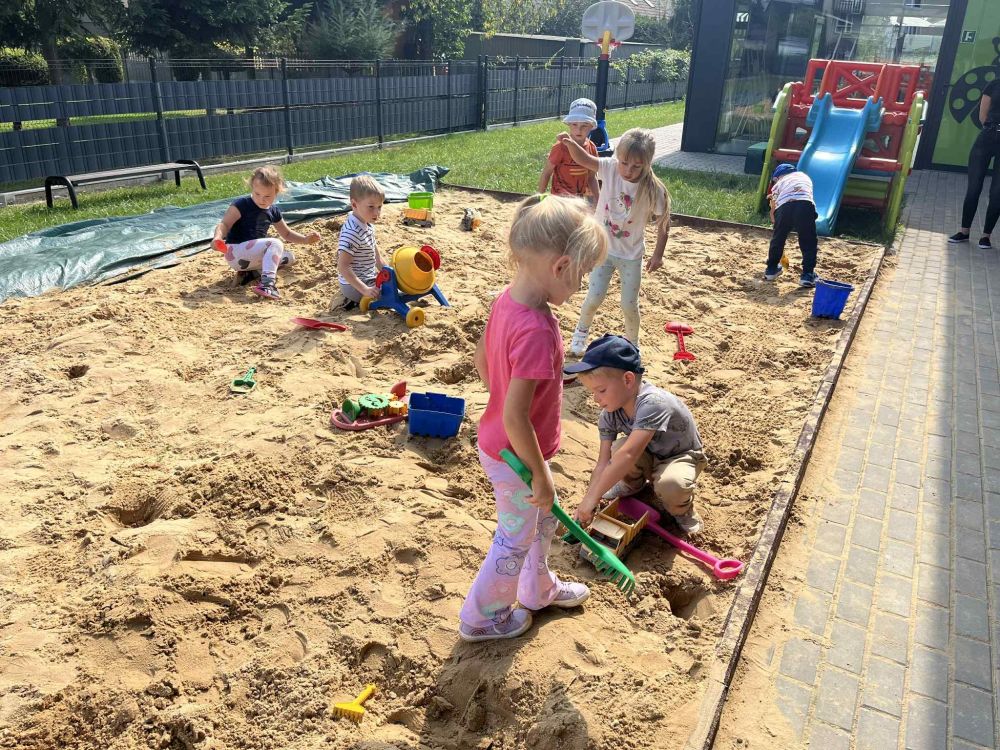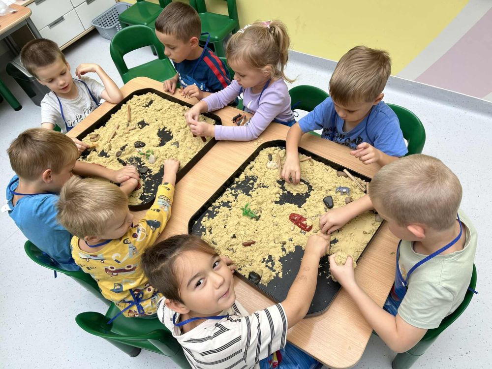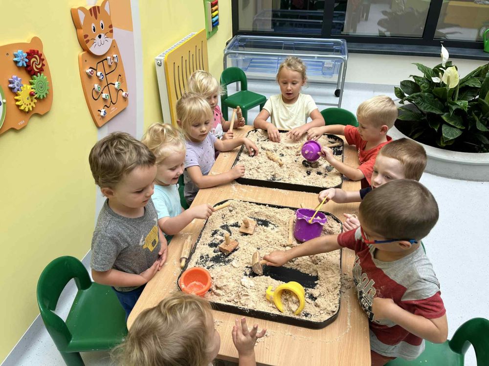 We wrześniu nasze grupy projektowe uczestniczące w zajęciach z zakresu sensoryki wyruszyły w wyjątkową podróż pełną wrażeń i odkryć. Celem spotkań było stymulowanie zmysłów, rozwijanie małej motoryki oraz budowanie kompetencji społecznych poprzez zabawę i twórcze eksperymenty. Dzieci miały okazję doświadczyć różnorodnych faktur mas sensorycznych – od delikatnego, suchego piasku, który przywoływał wspomnienia letnich dni, po mokry piasek, pozwalający na nowe, nieoczywiste odkrycia. Przedszkolaki z ogromnym zaangażowaniem poszukiwały skarbów ukrytych w piasku, co rozwijało ich ciekawość, spostrzegawczość oraz zdolności manualne.