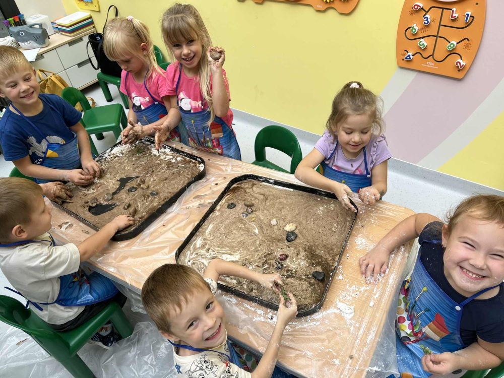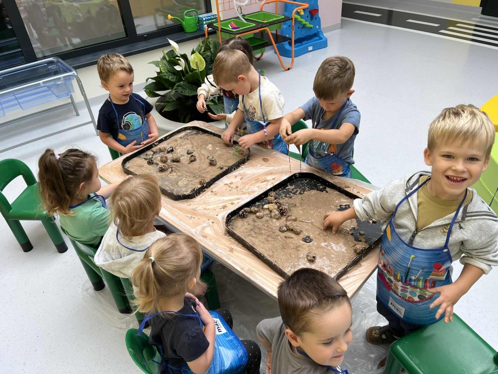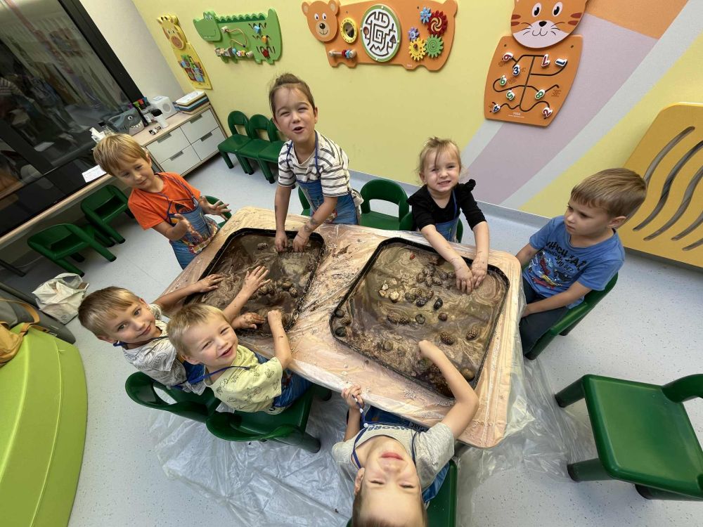 Nie zabrakło również radosnych eksperymentów z błotkiem, które okazały się źródłem ogromnej frajdy! Dzieci z entuzjazmem badały jego strukturę, doświadczając przy tym wielu bodźców dotykowych i ruchowych.