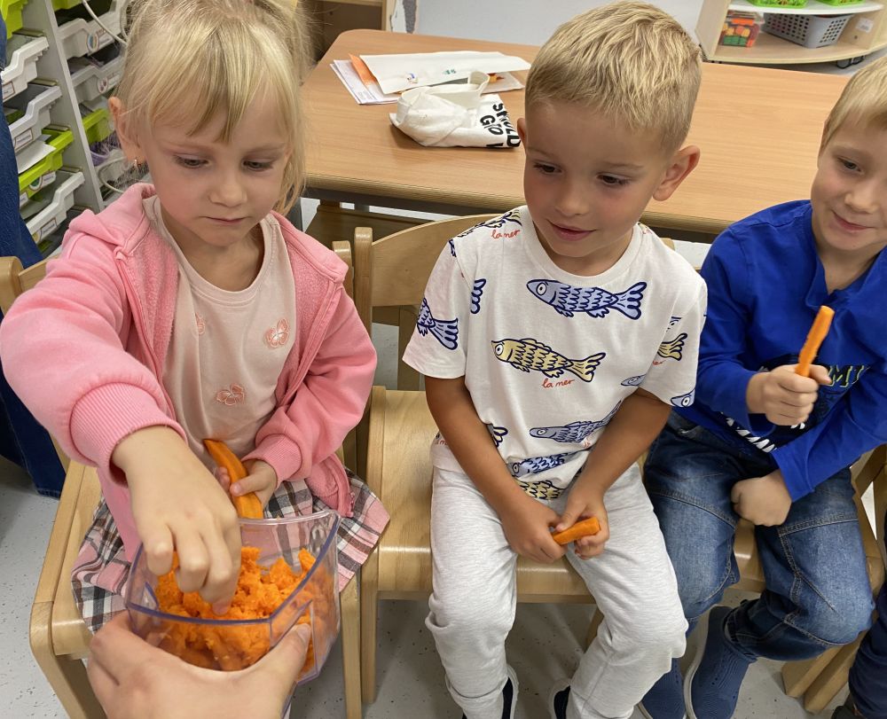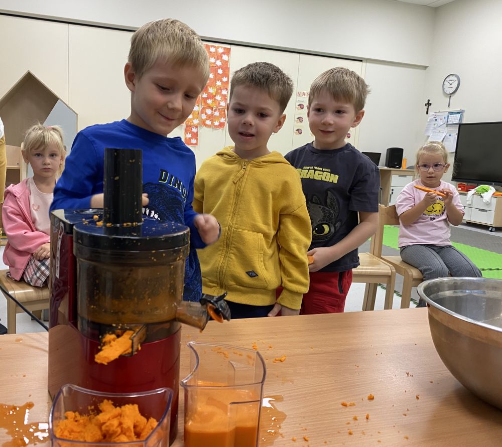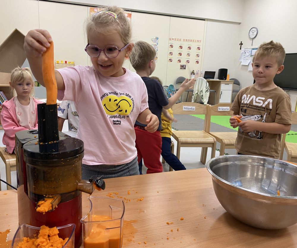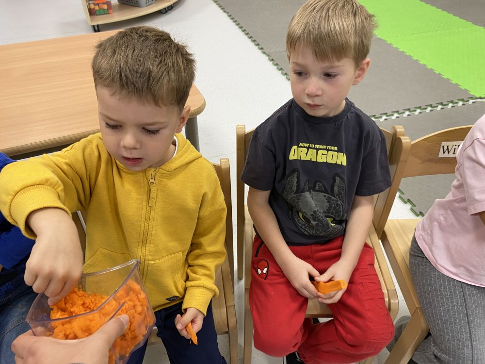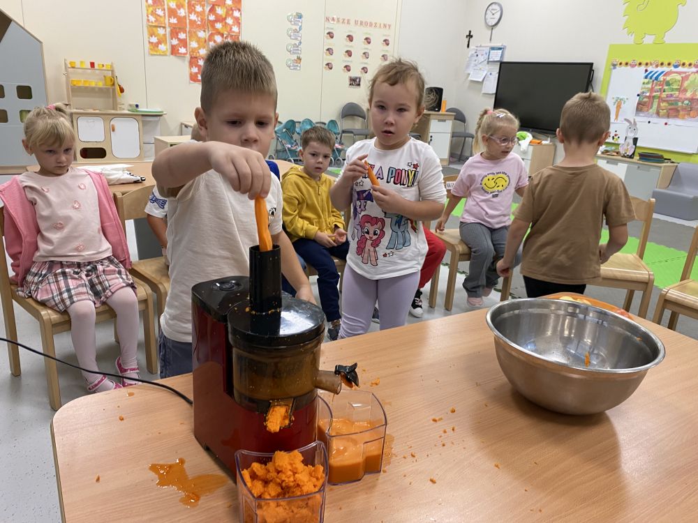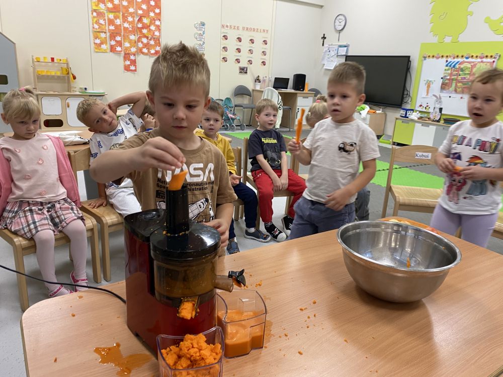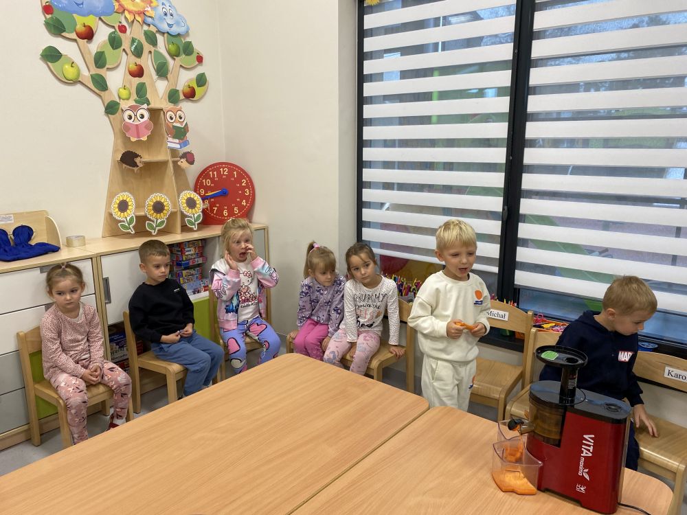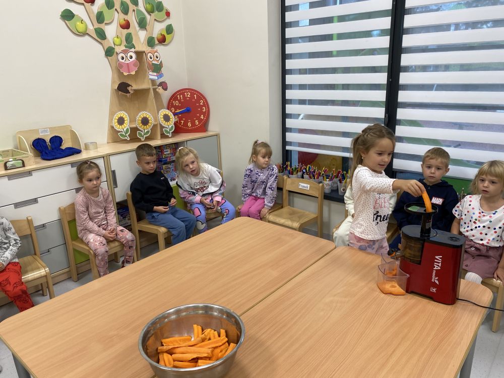 W ramach projektu „Witaminki” dzieci poznały kolejne warzywo – marchewkę. Dowiedziały się, jak wygląda, jak smakuje i gdzie rośnie poznane warzywo. Rozmawiały o tym, co można przygotować z marchewki, a na zakończenie zajęć samodzielnie wykonały pyszny, zdrowy sok marchwiowy.