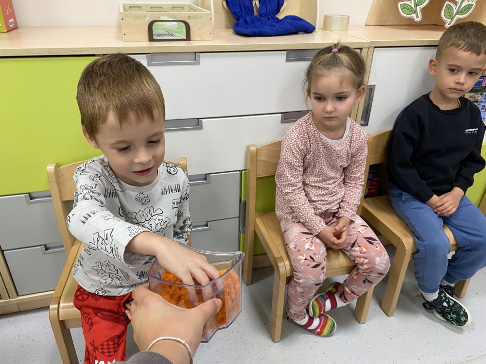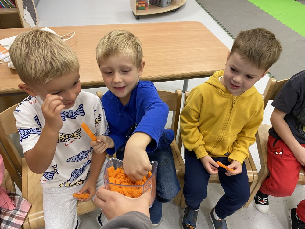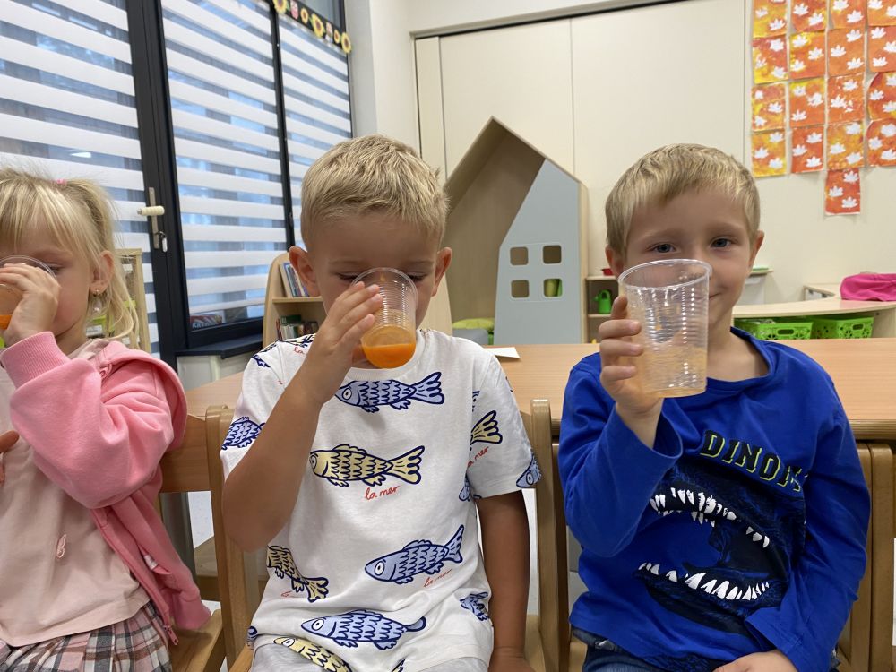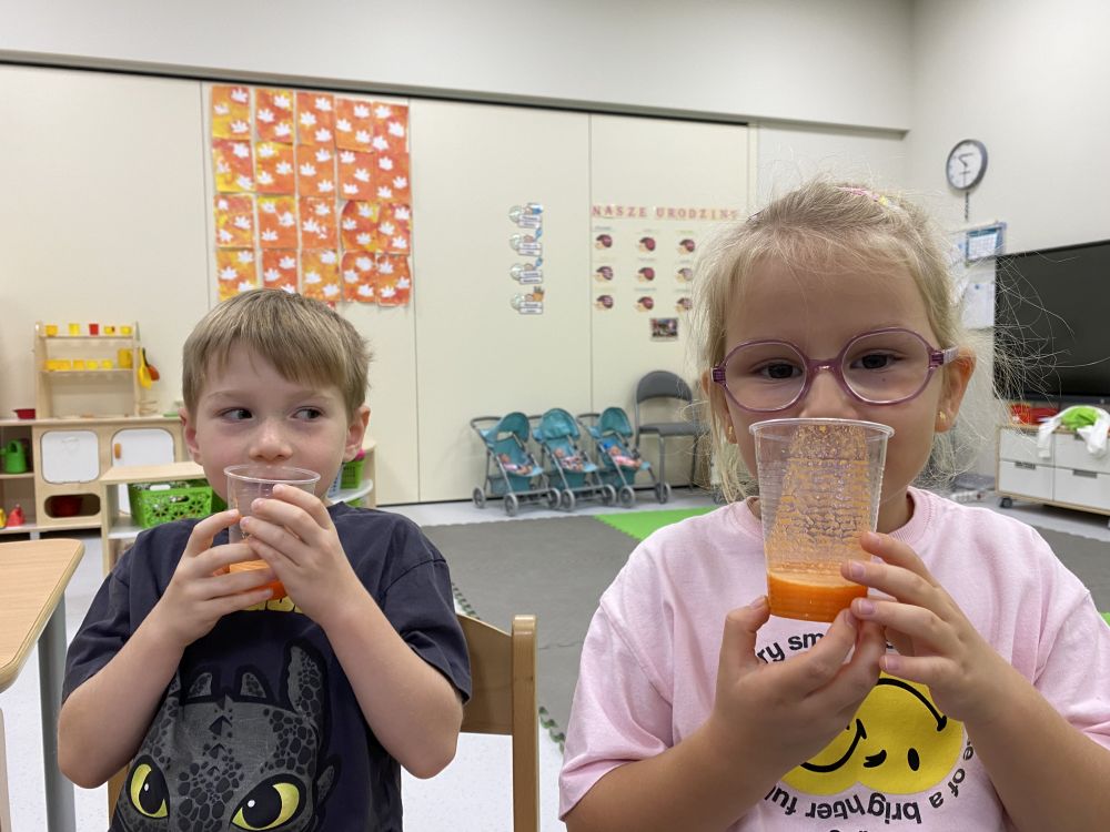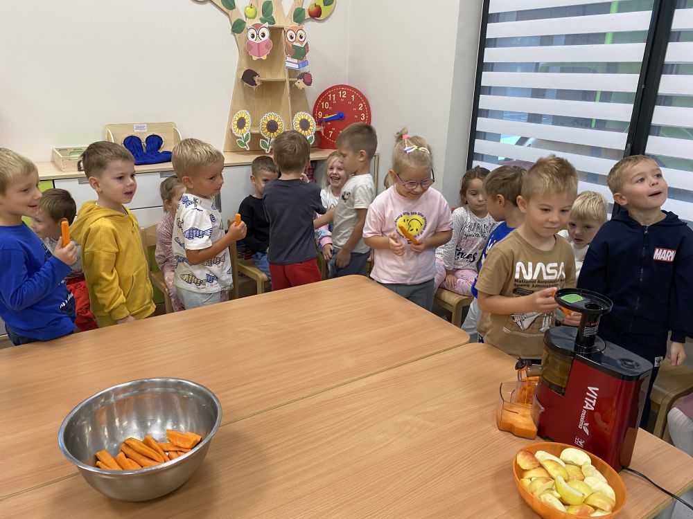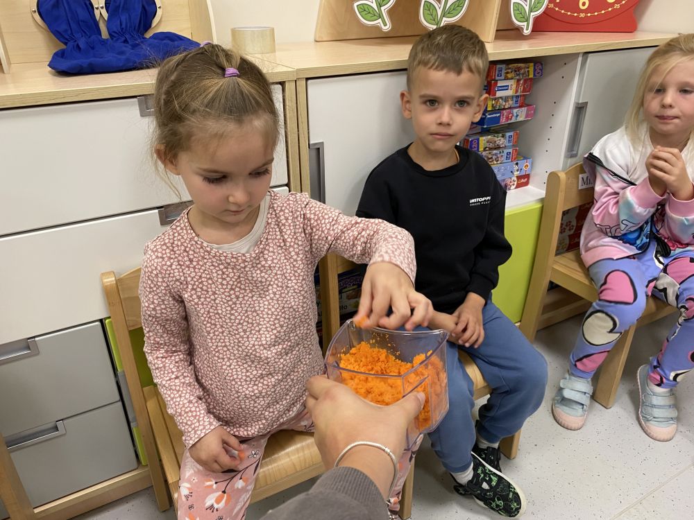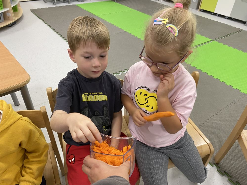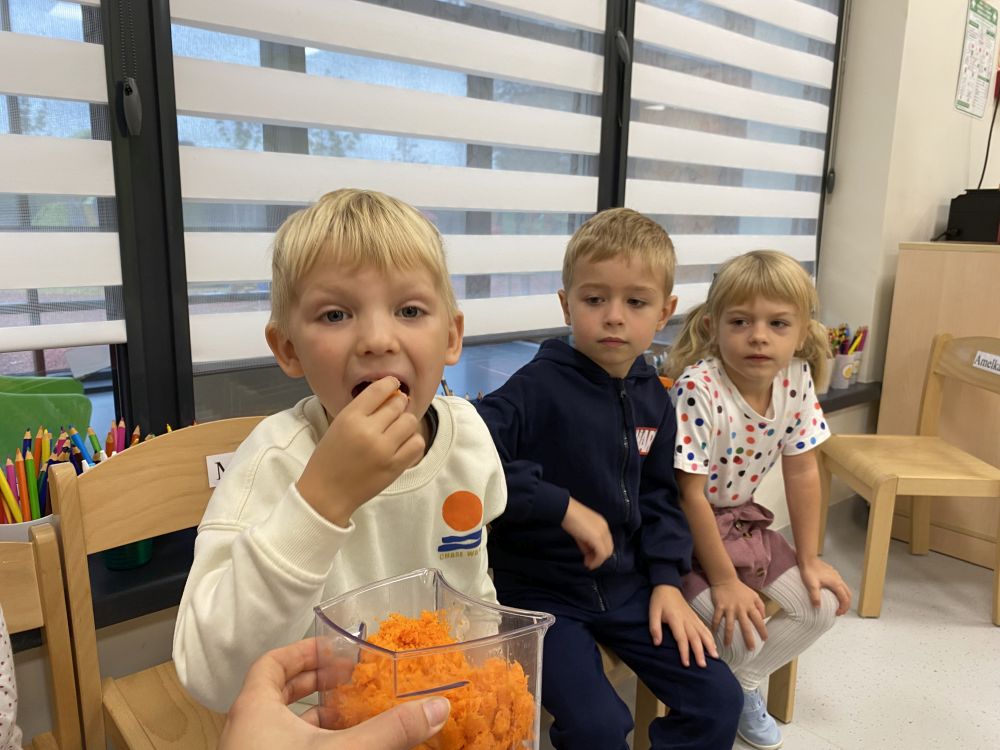 W ramach projektu „Witaminki” dzieci poznały kolejne warzywo – marchewkę. Dowiedziały się, jak wygląda, jak smakuje i gdzie rośnie poznane warzywo. Rozmawiały o tym, co można przygotować z marchewki, a na zakończenie zajęć samodzielnie wykonały pyszny, zdrowy sok marchwiowy.