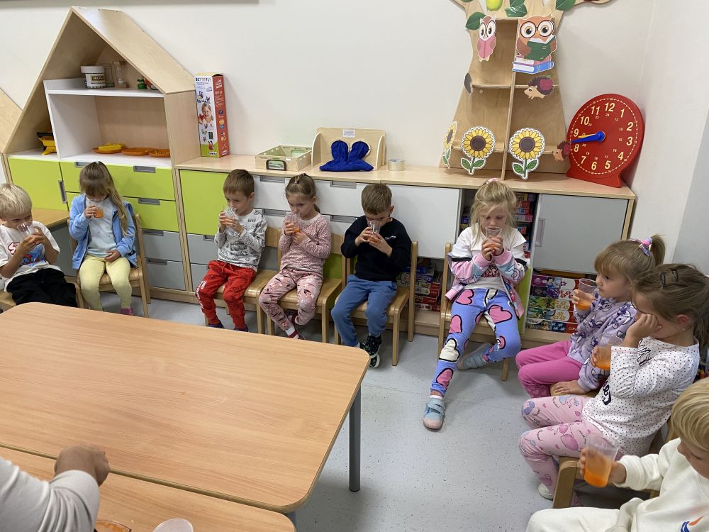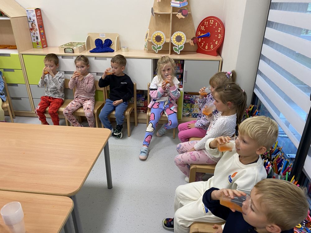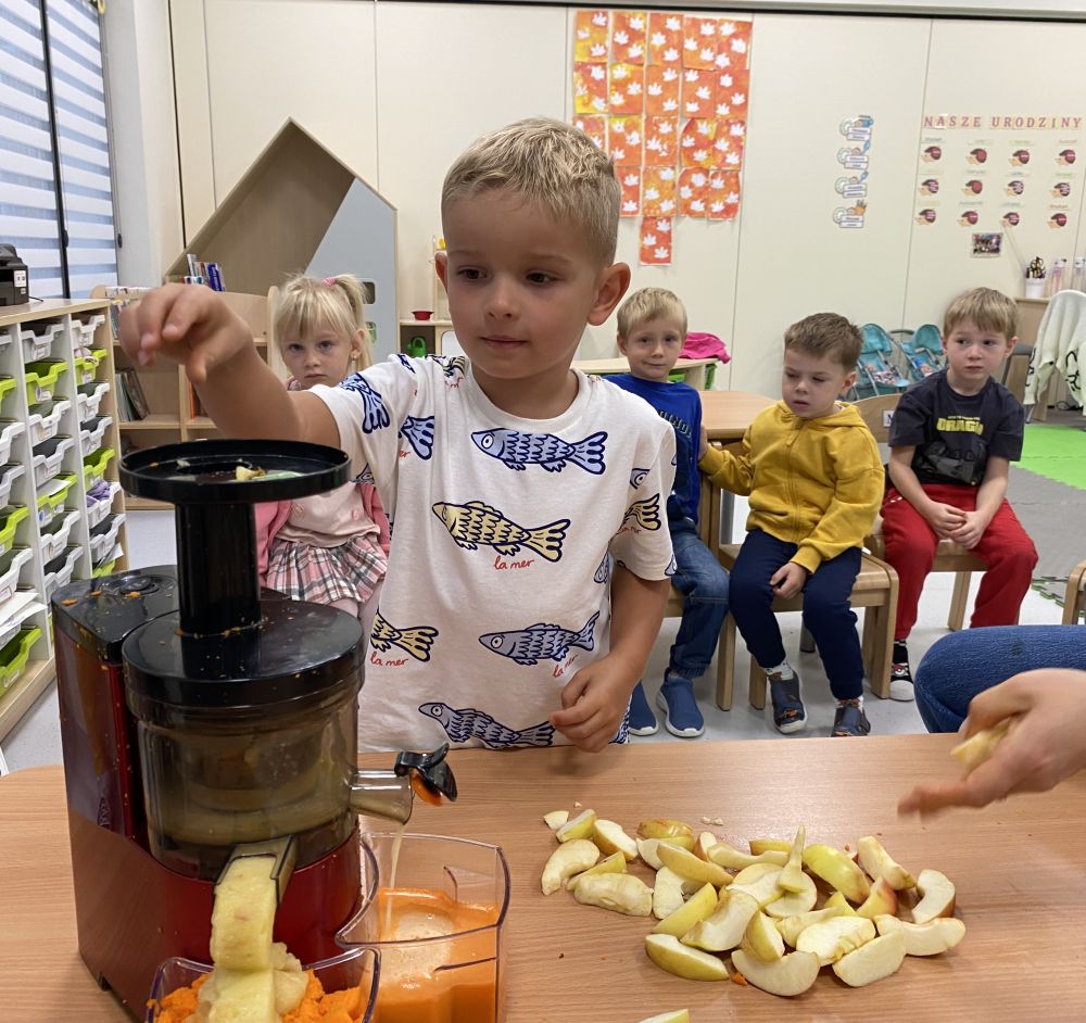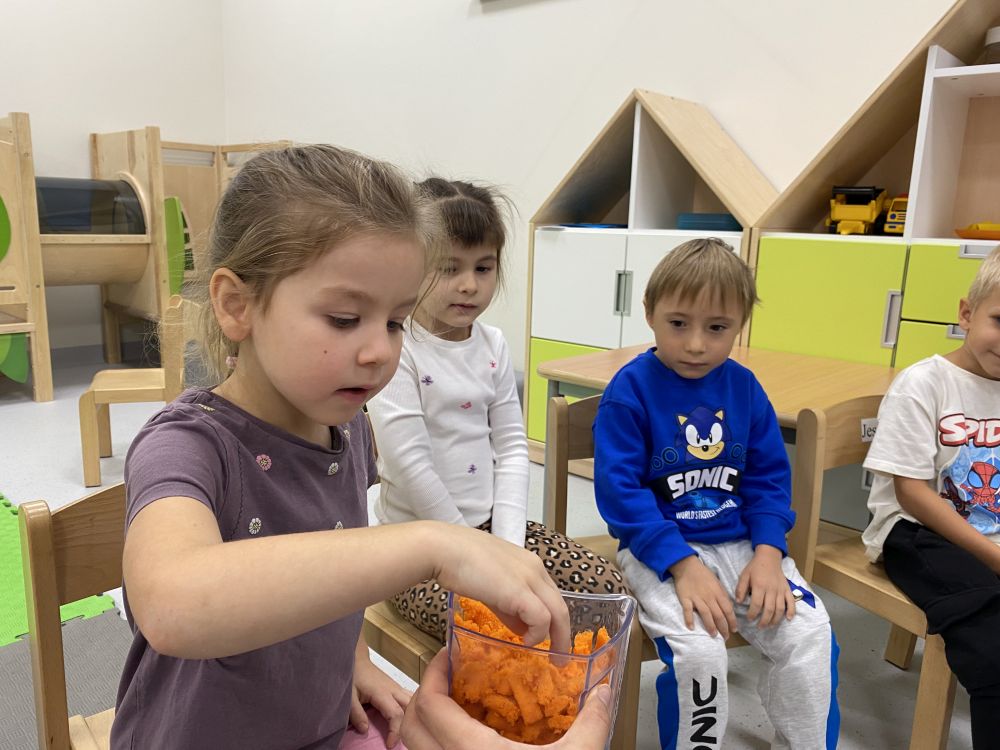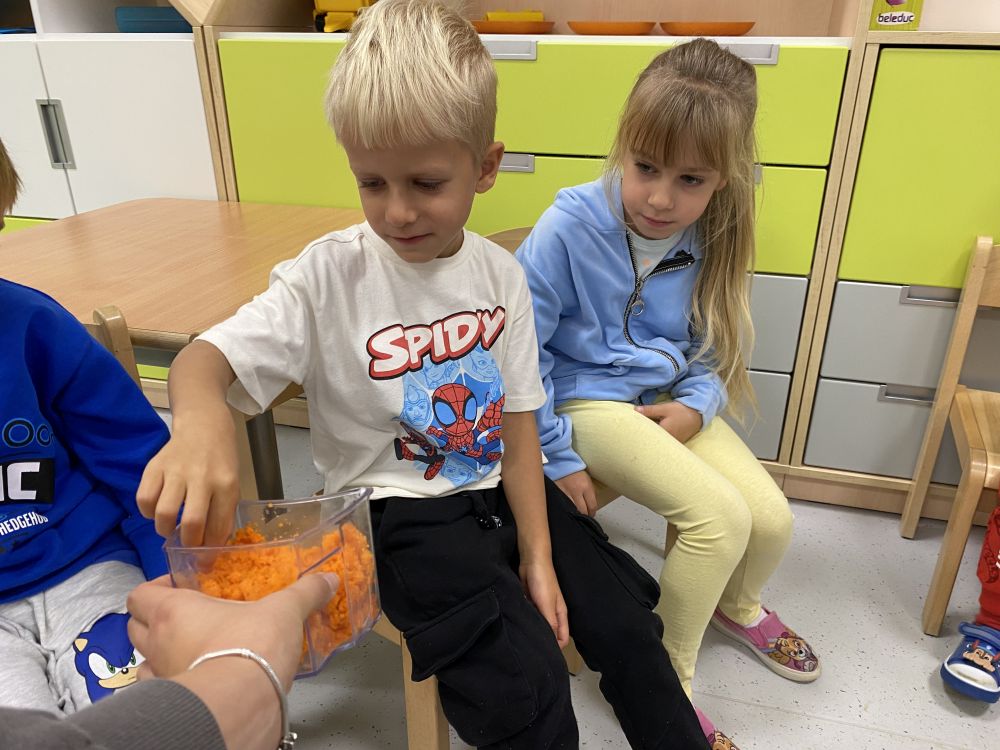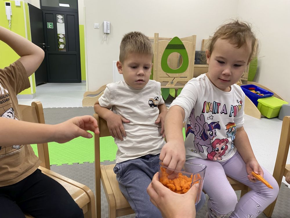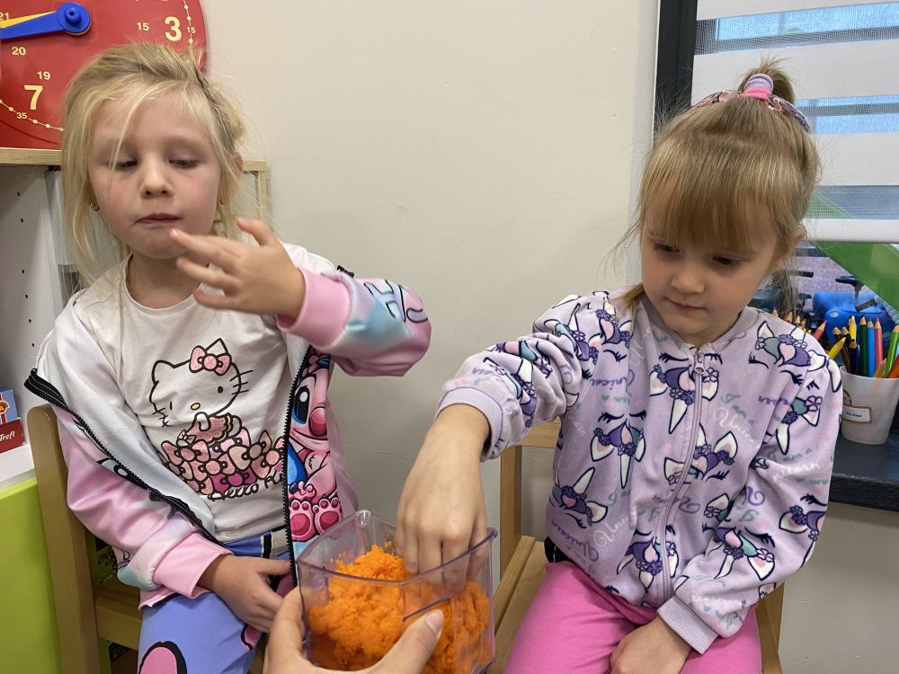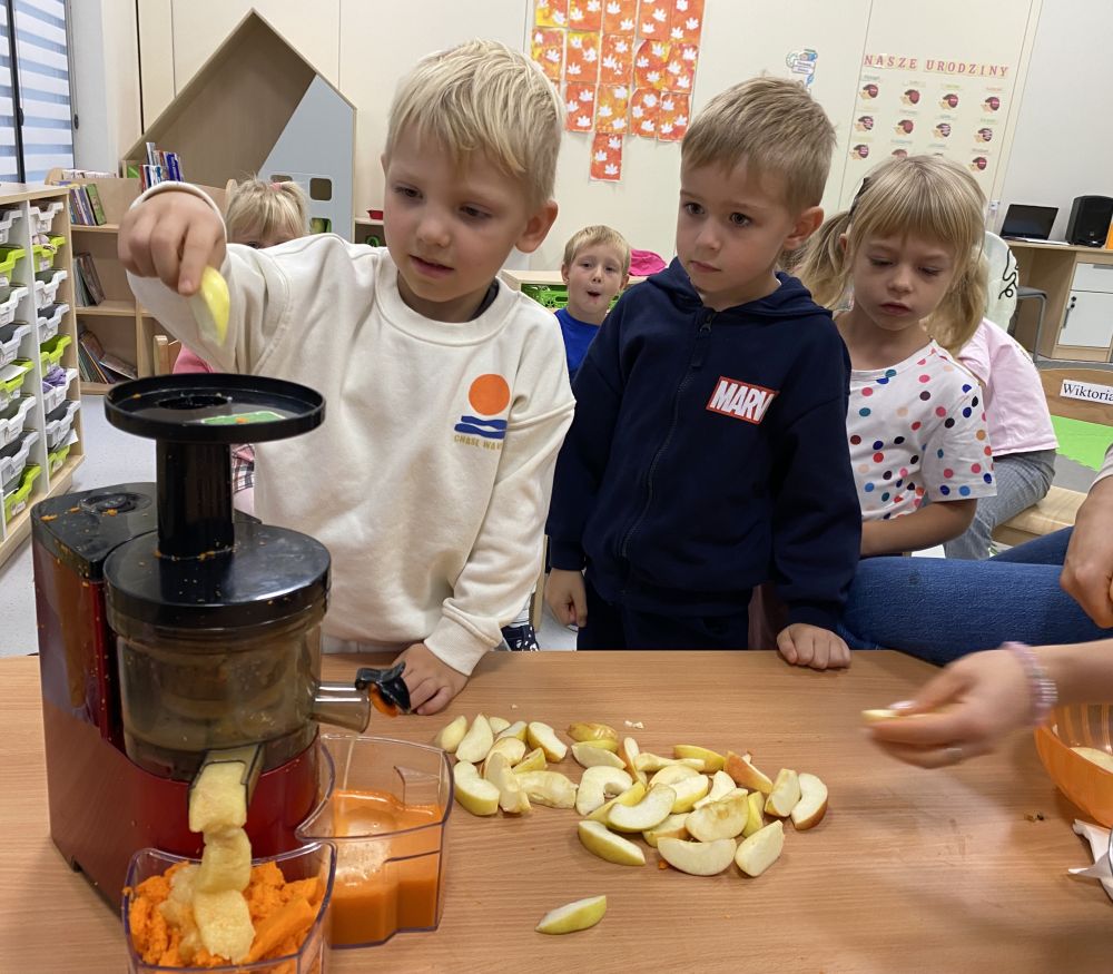 W ramach projektu „Witaminki” dzieci poznały kolejne warzywo – marchewkę. Dowiedziały się, jak wygląda, jak smakuje i gdzie rośnie poznane warzywo. Rozmawiały o tym, co można przygotować z marchewki, a na zakończenie zajęć samodzielnie wykonały pyszny, zdrowy sok marchwiowy.