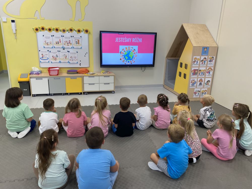 Podczas warsztatów realizowanych w ramach projektu dzieci rozmawiały o tym, że wszyscy jesteśmy różni. Dzięki prezentacji poznały różnice, które nas dotyczą, uczestniczyły w zabawie ruchowej oraz stworzyły własne prace plastyczne nawiązujące do tematu zajęć.