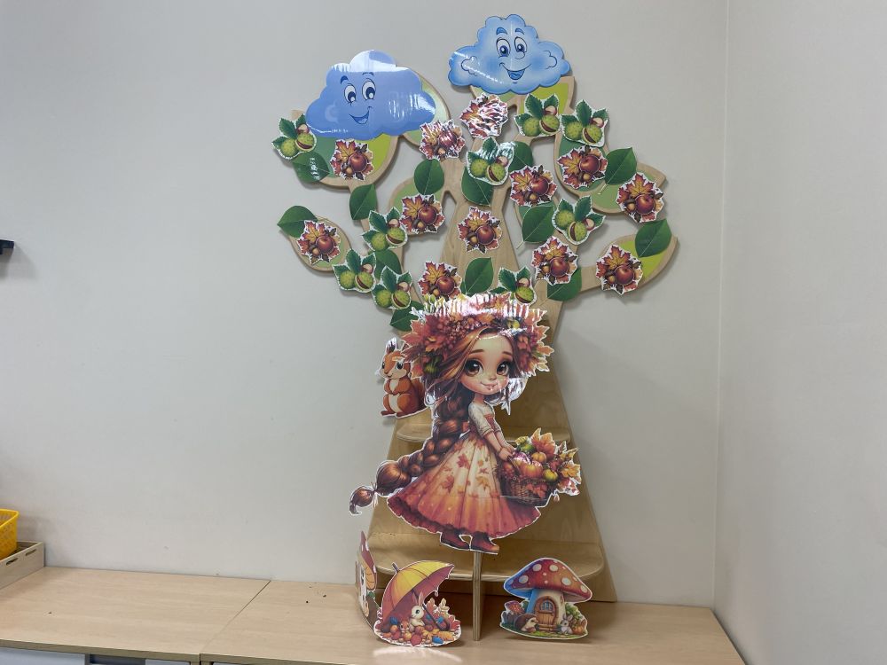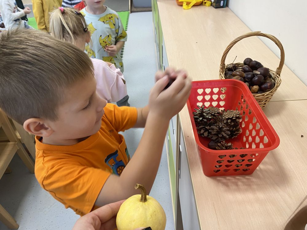 Jeżyki stworzyły swój kącik jesienny. Dzieci przyniosły wiele darów jesieni – dynie, kasztany, żołędzie, liście i orzechy. Prezentowały w kole przyniesione dary, doskonale się przy tym bawiąc.
