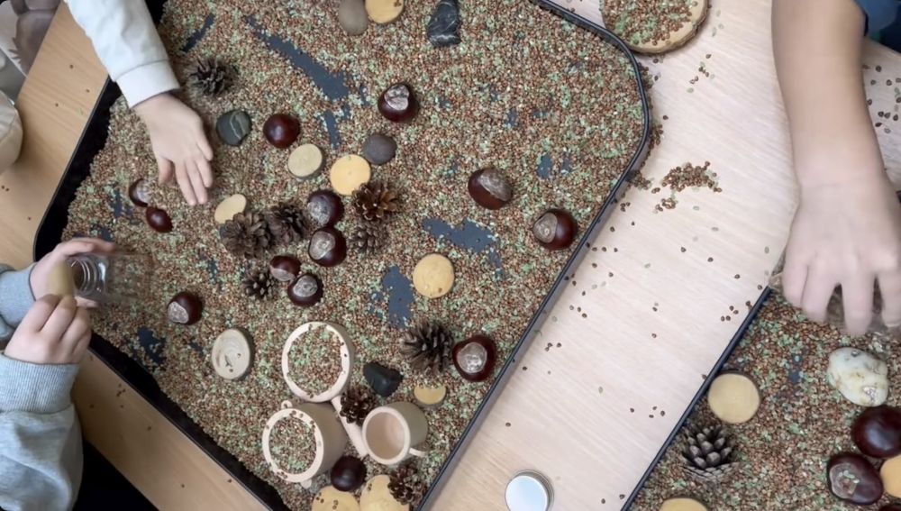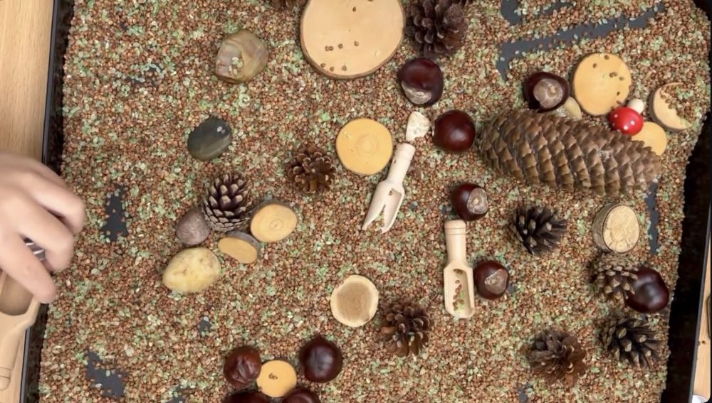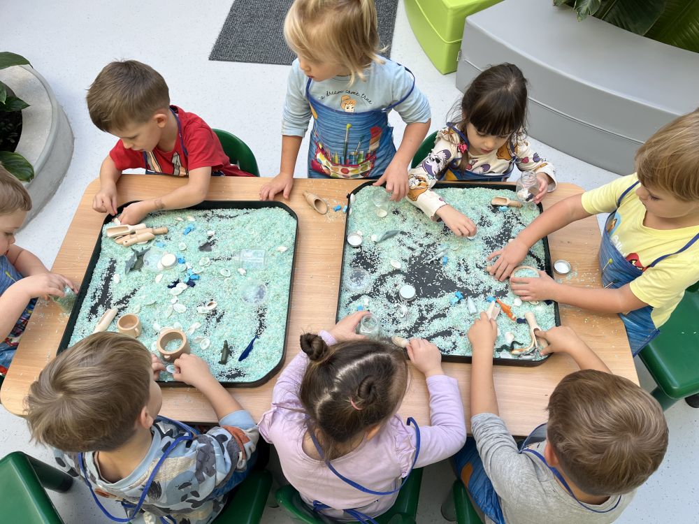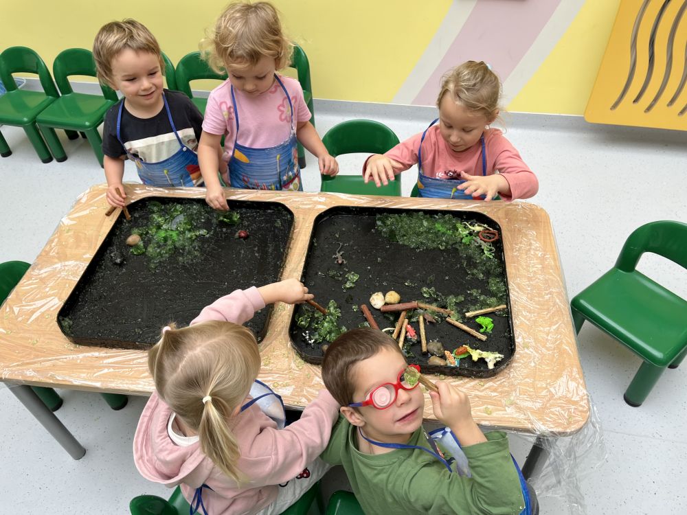 Kolejnym doświadczeniem było spotkanie z zimnem – dzieci odkrywały „zlodowacone skarby”, które mogły samodzielnie roztapiać i poznawać, co kryje się w środku. Potem przenieśliśmy się do leśnego świata – zapach lasu i jego naturalne skarby pozwoliły maluchom poczuć magię przyrody.