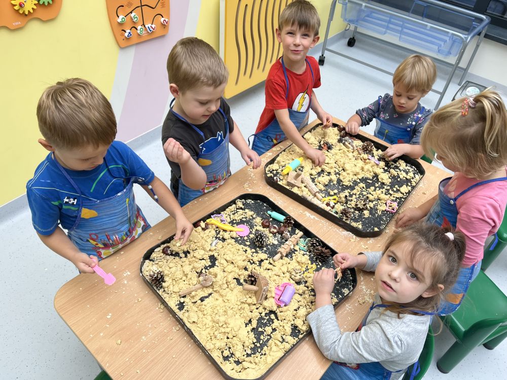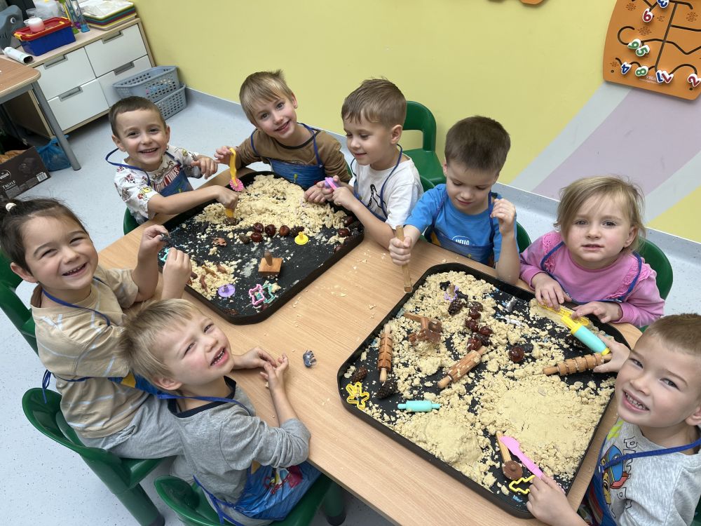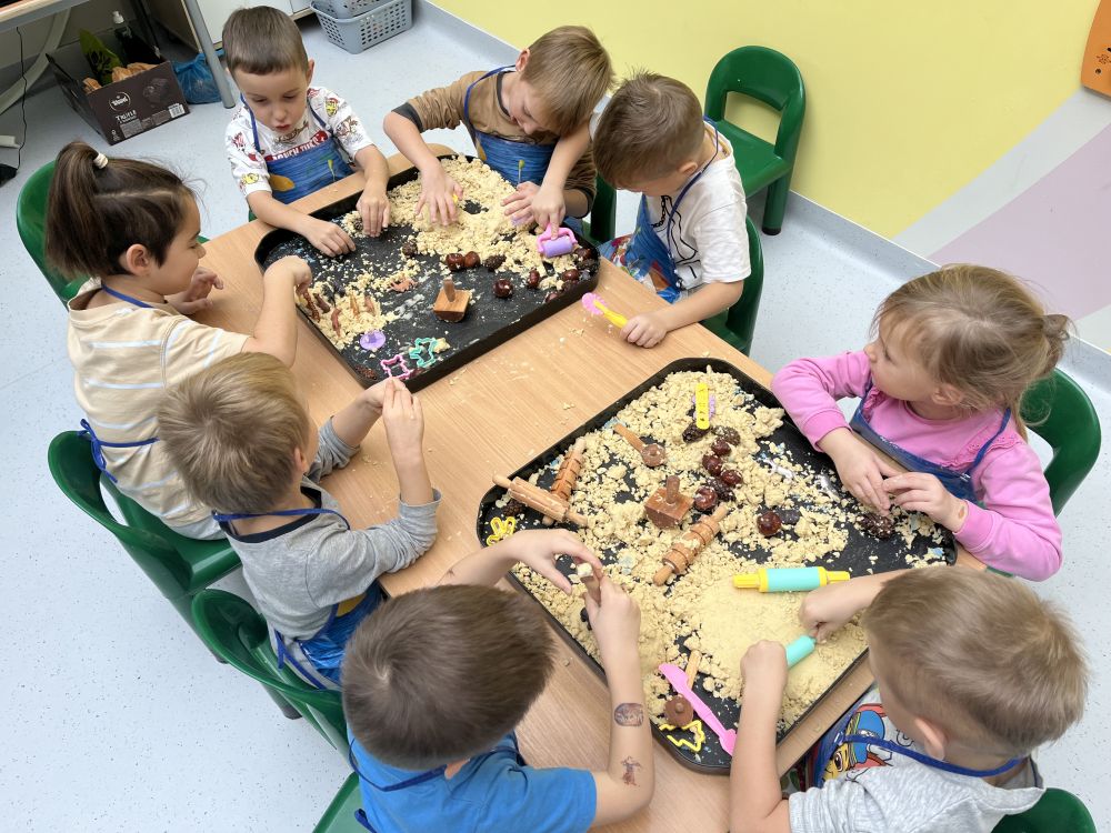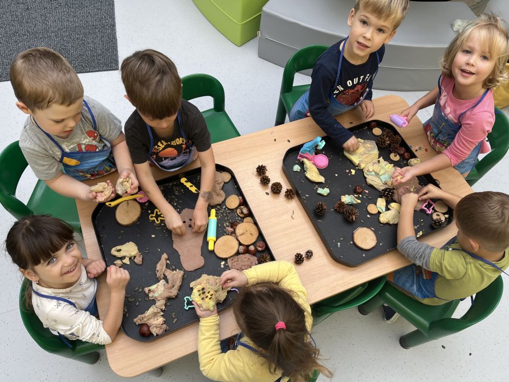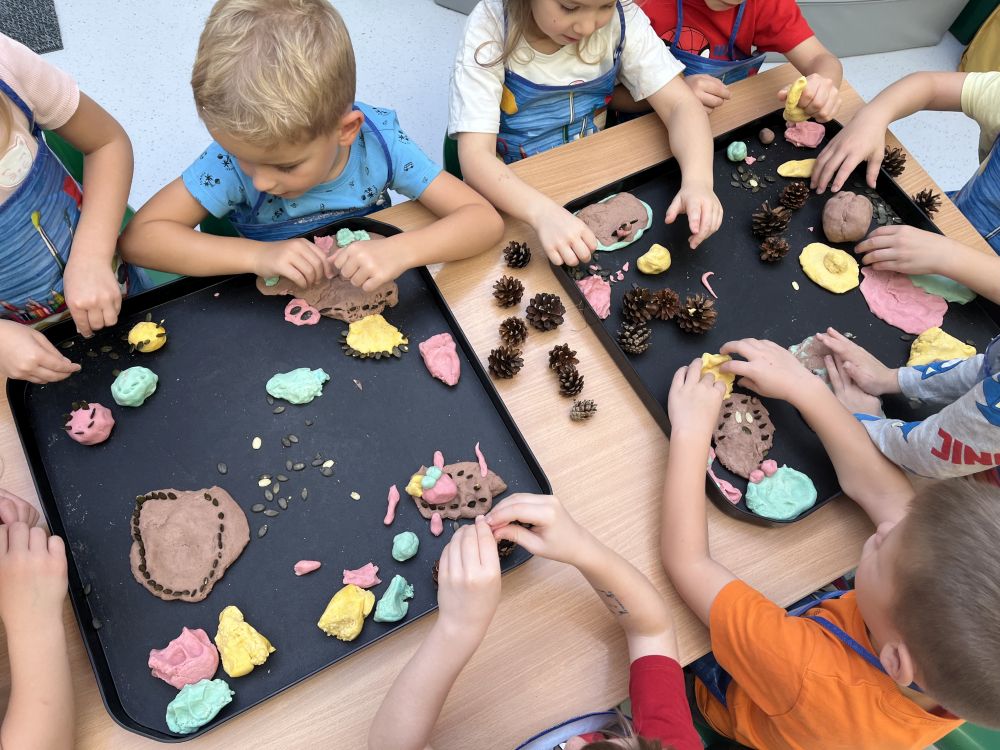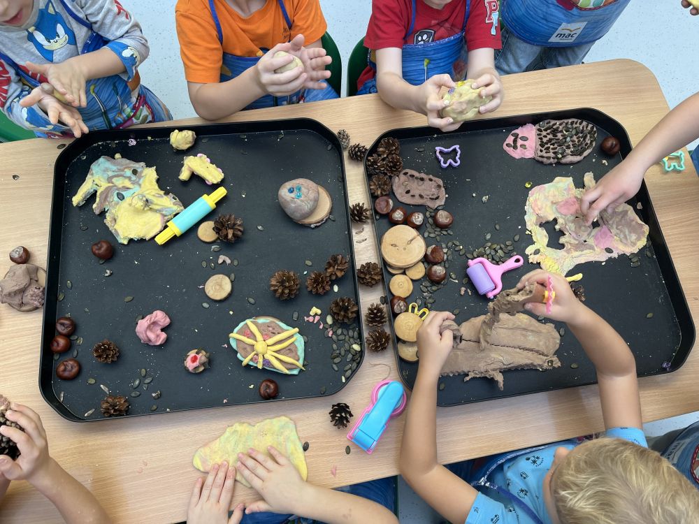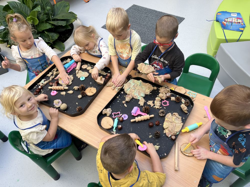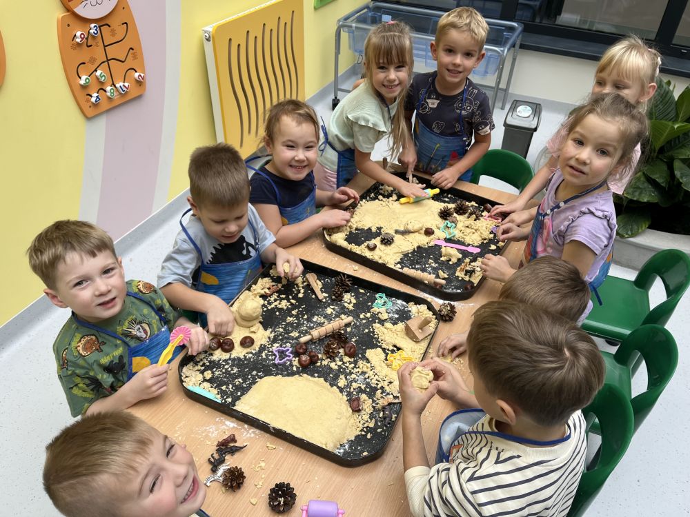 Dzieci odkrywały też „skarby ukryte w piasku”, rozwijając spostrzegawczość i cierpliwość. Nie zabrakło kreatywności – przedszkolaki same stworzyły ciastolinowe jeże oraz różnorodne jesienne pejzaże, wykazując się pomysłowością i zręcznością.