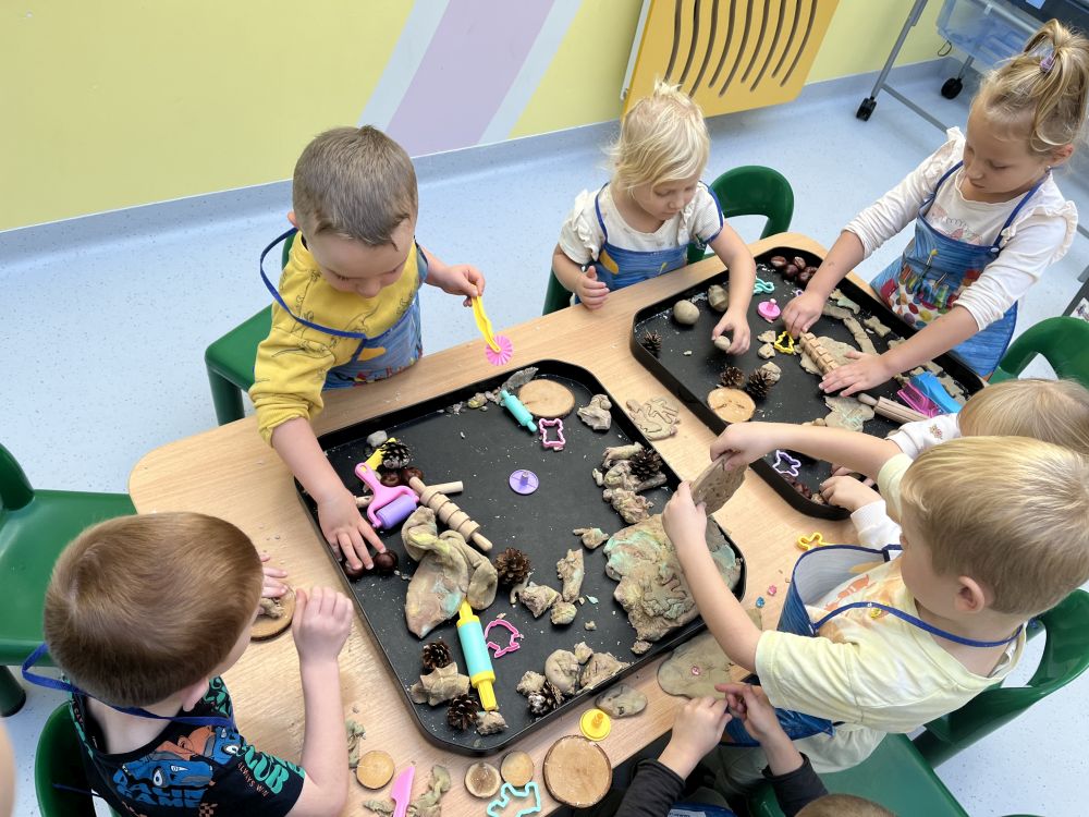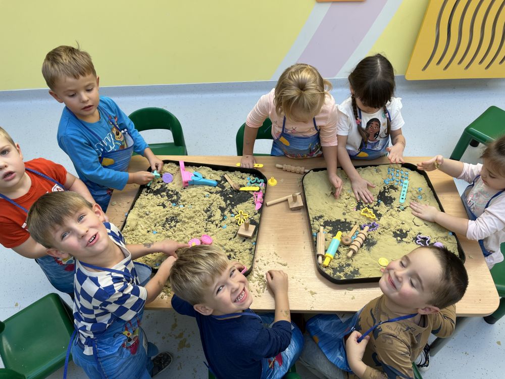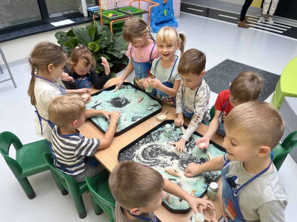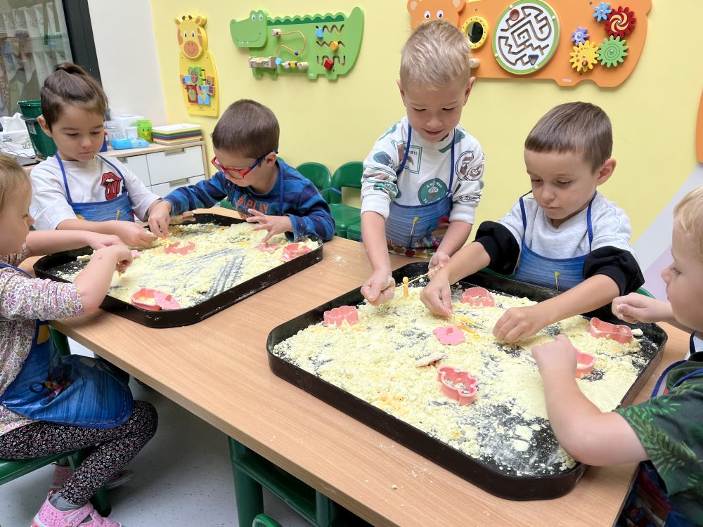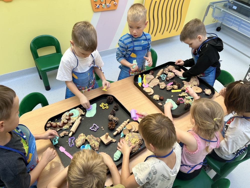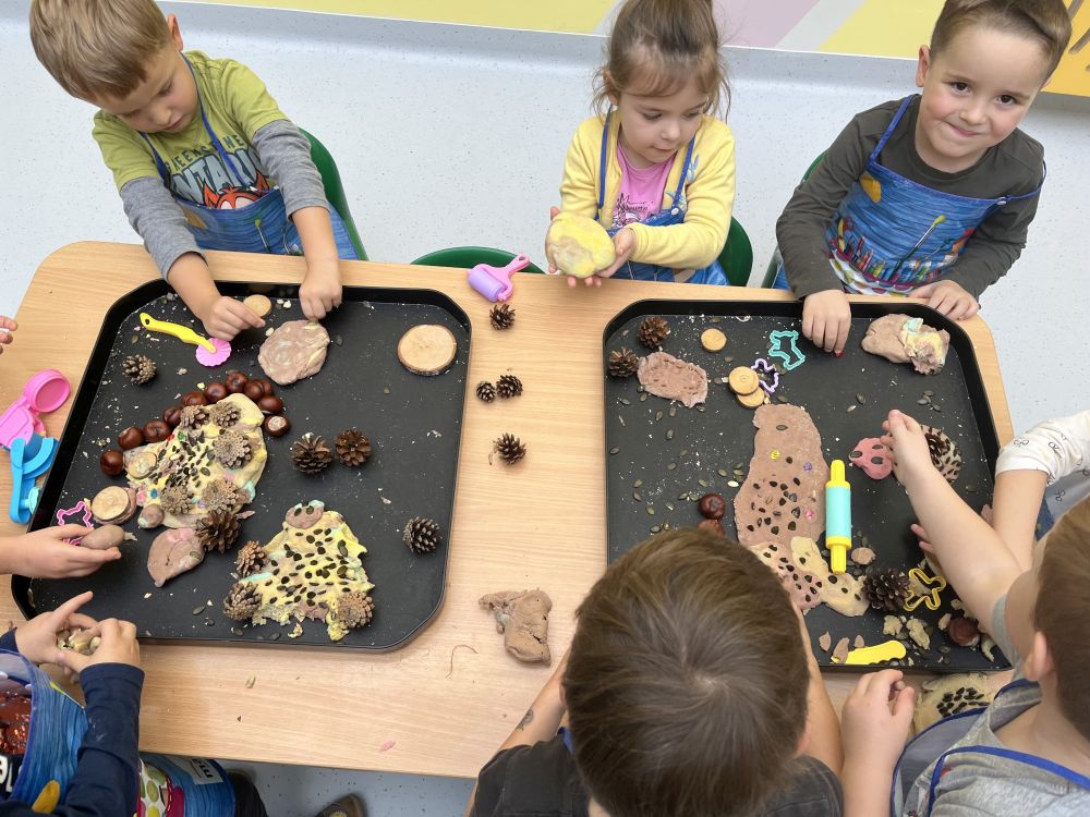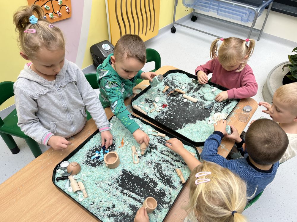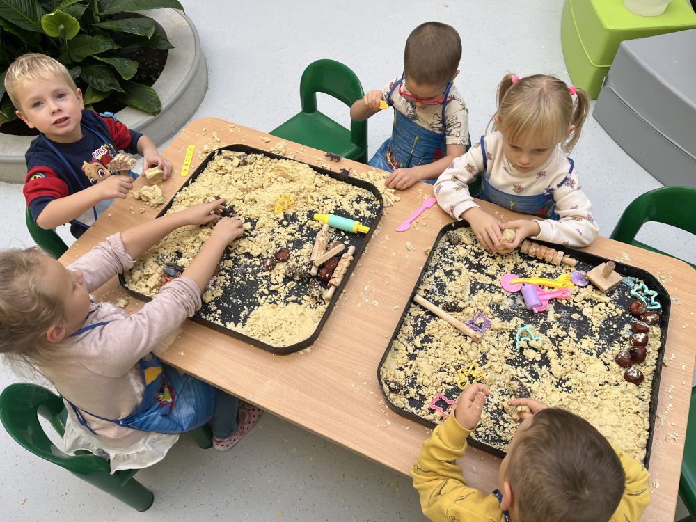 Dzieci odkrywały też „skarby ukryte w piasku”, rozwijając spostrzegawczość i cierpliwość. Nie zabrakło kreatywności – przedszkolaki same stworzyły ciastolinowe jeże oraz różnorodne jesienne pejzaże, wykazując się pomysłowością i zręcznością.