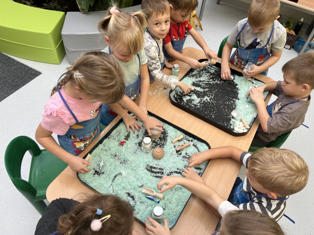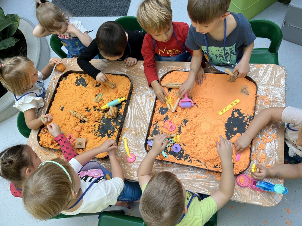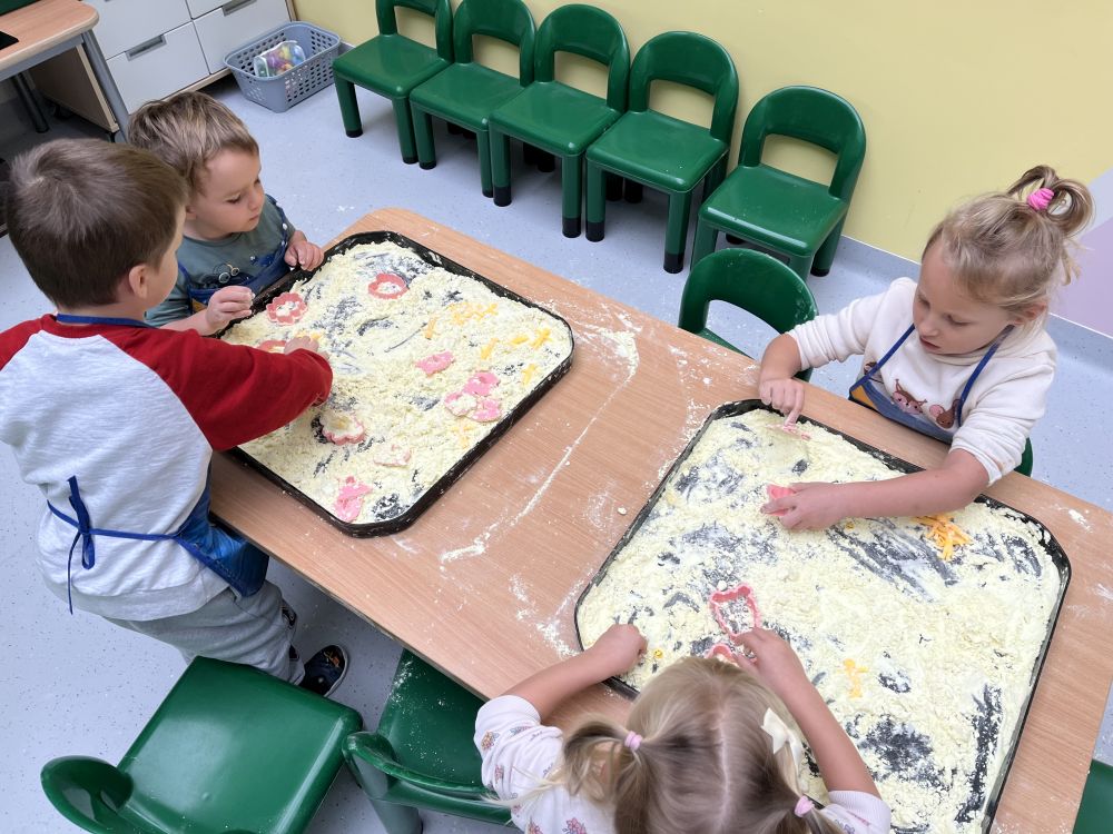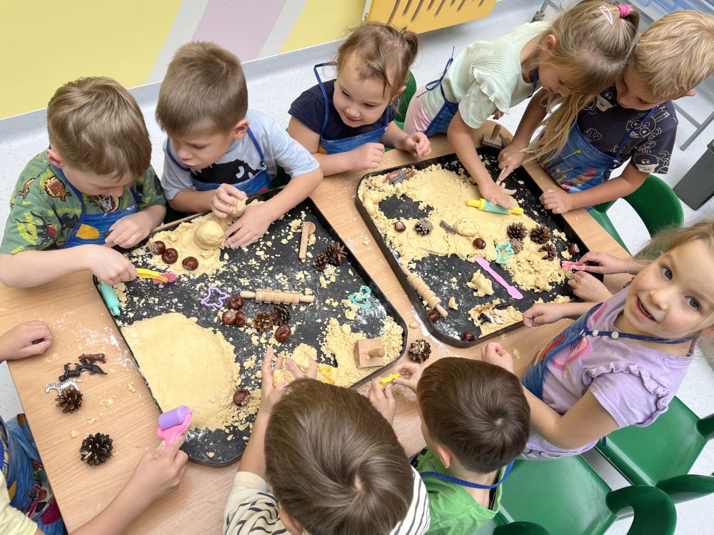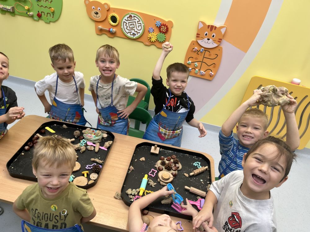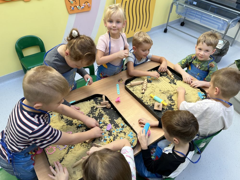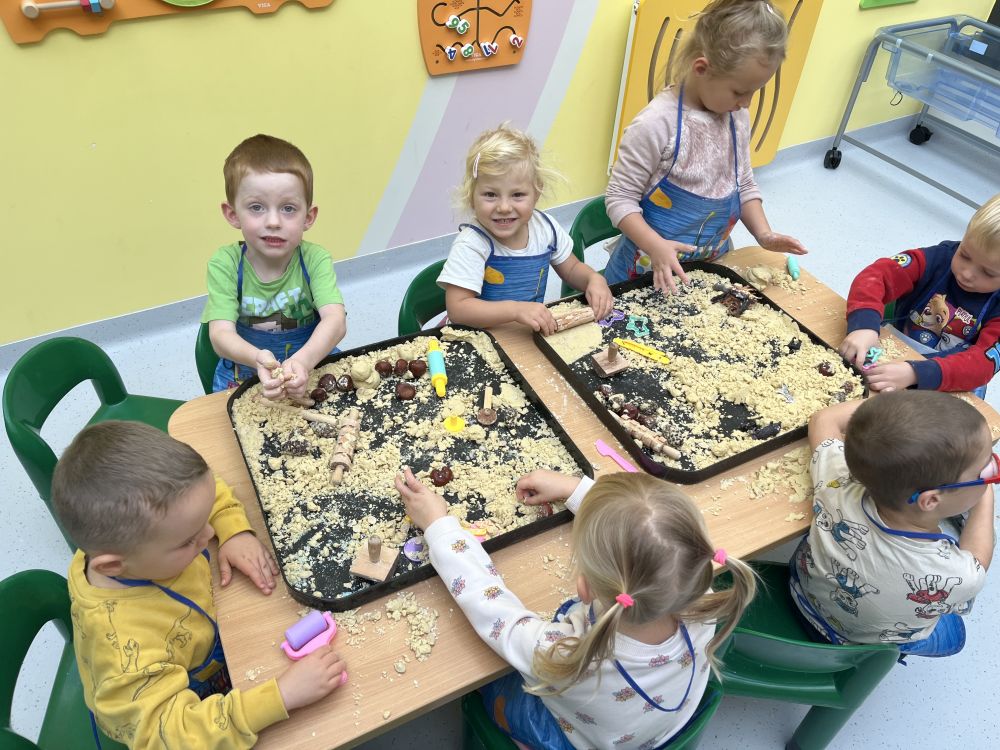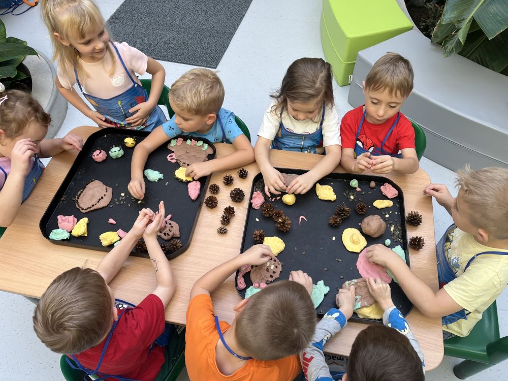 Dzieci odkrywały też „skarby ukryte w piasku”, rozwijając spostrzegawczość i cierpliwość. Nie zabrakło kreatywności – przedszkolaki same stworzyły ciastolinowe jeże oraz różnorodne jesienne pejzaże, wykazując się pomysłowością i zręcznością.