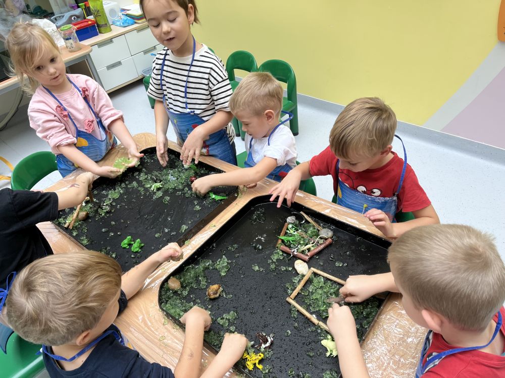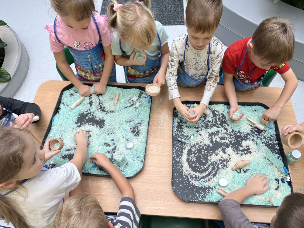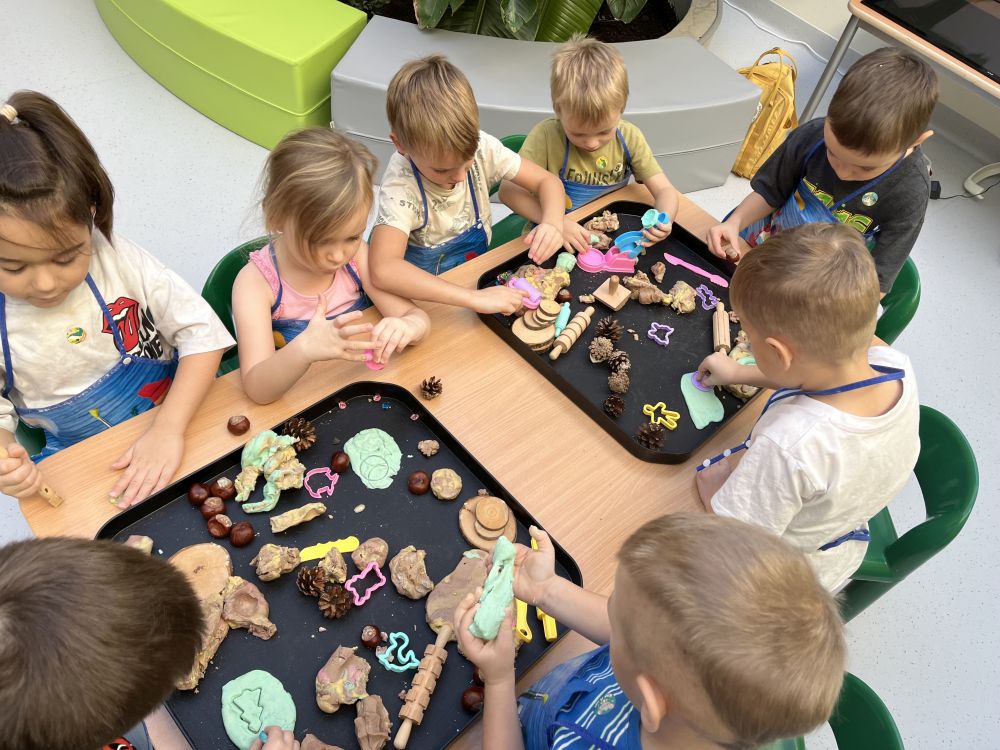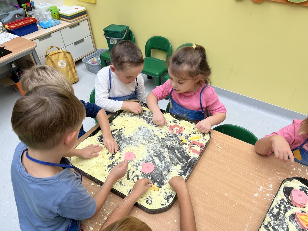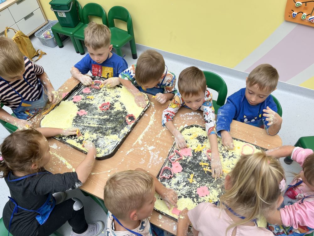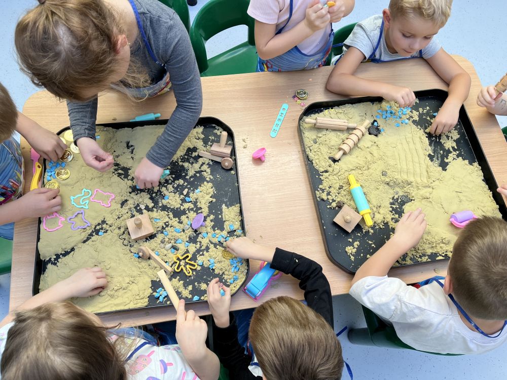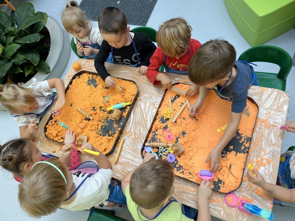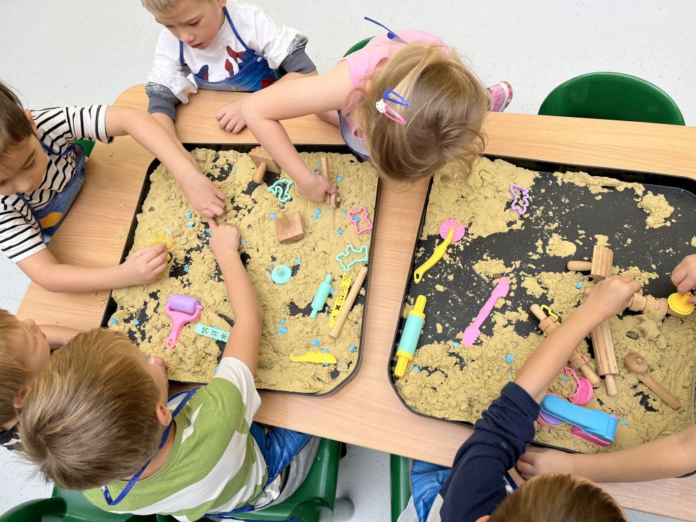 Dzieci odkrywały też „skarby ukryte w piasku”, rozwijając spostrzegawczość i cierpliwość. Nie zabrakło kreatywności – przedszkolaki same stworzyły ciastolinowe jeże oraz różnorodne jesienne pejzaże, wykazując się pomysłowością i zręcznością.