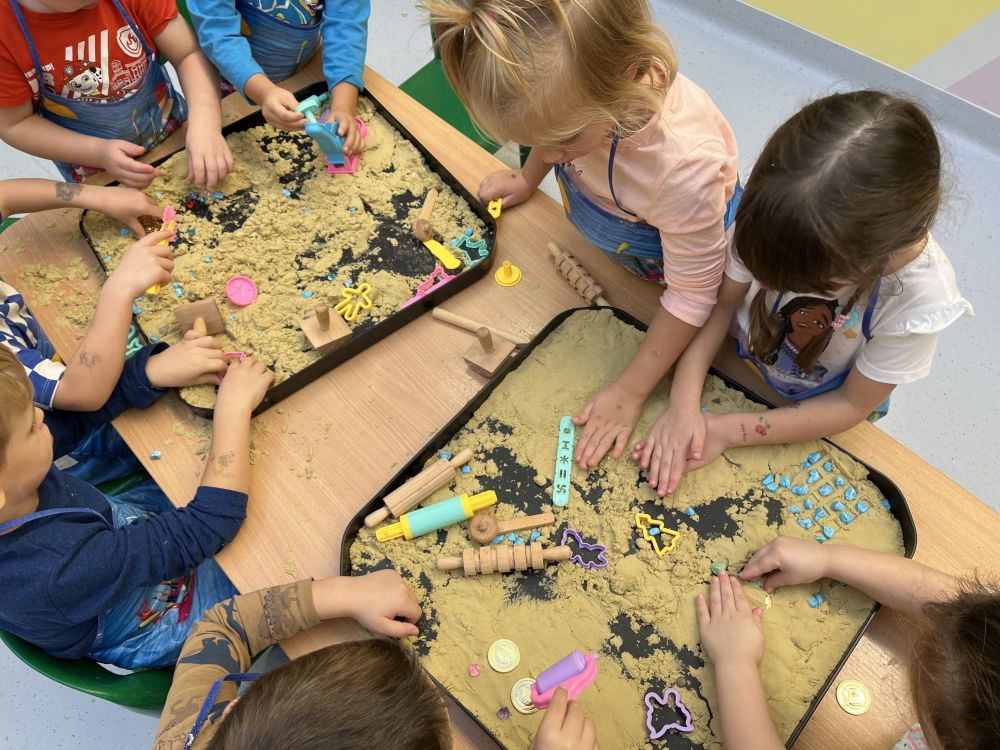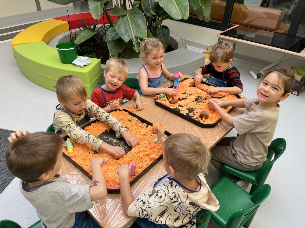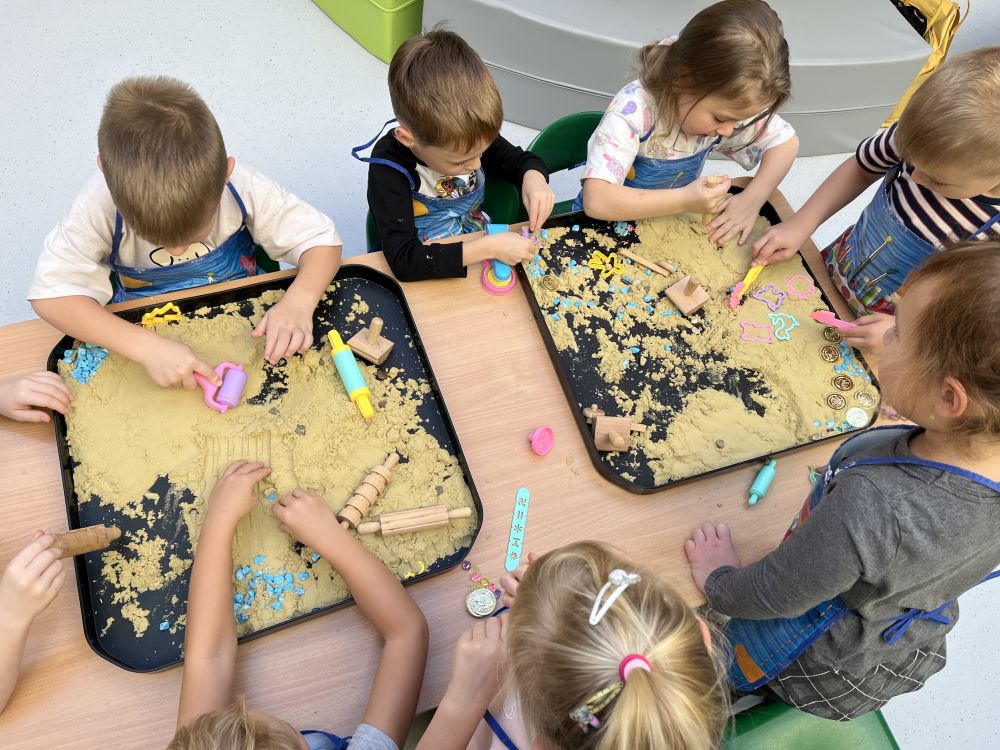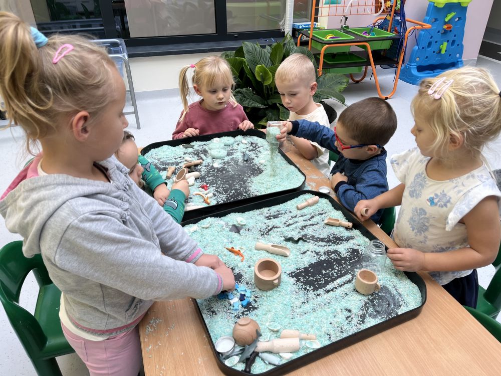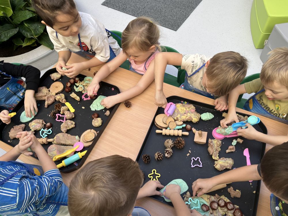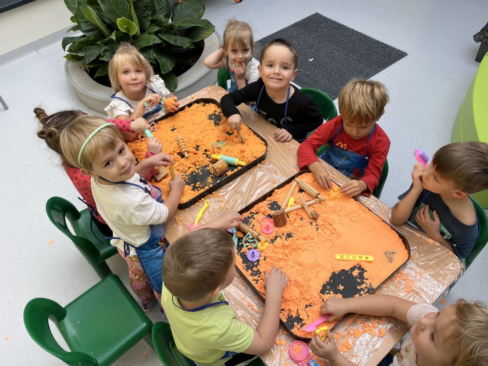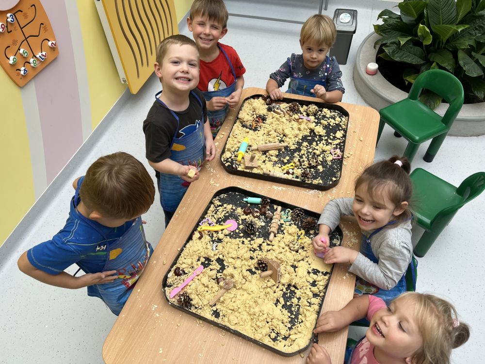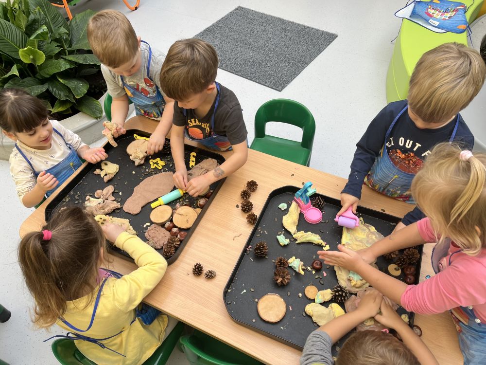 Dzieci odkrywały też „skarby ukryte w piasku”, rozwijając spostrzegawczość i cierpliwość. Nie zabrakło kreatywności – przedszkolaki same stworzyły ciastolinowe jeże oraz różnorodne jesienne pejzaże, wykazując się pomysłowością i zręcznością.
