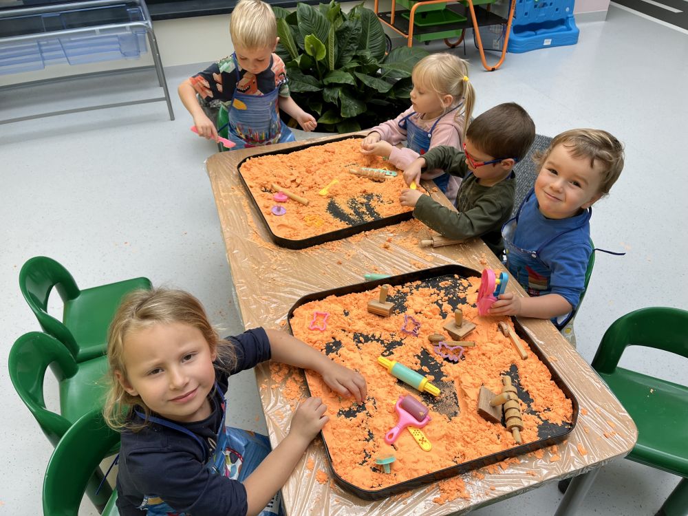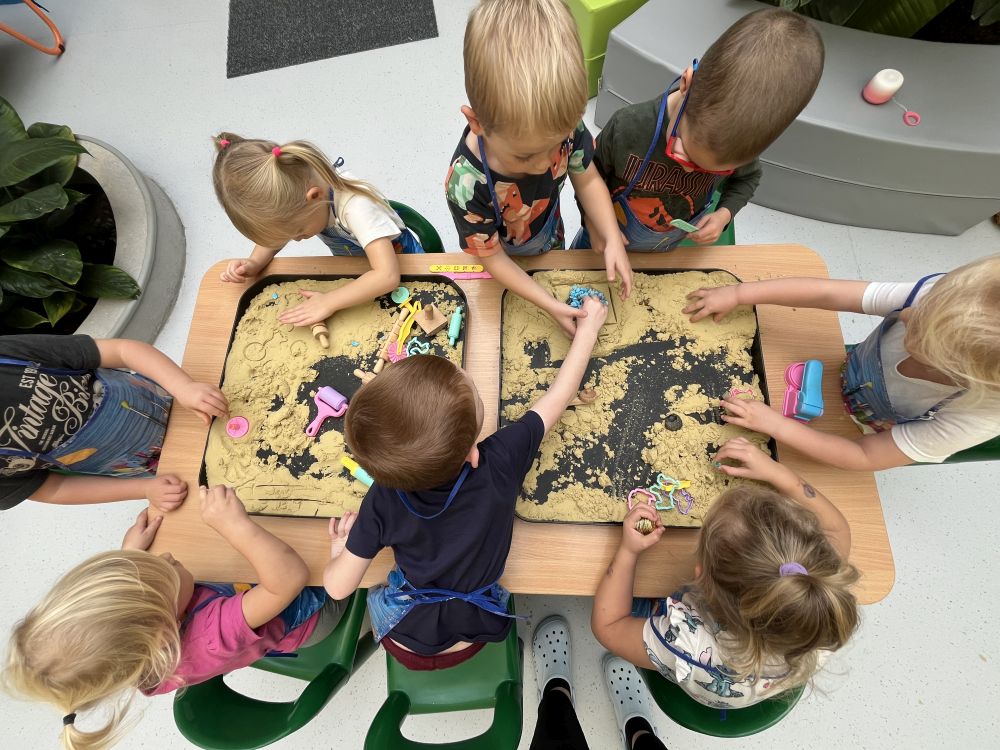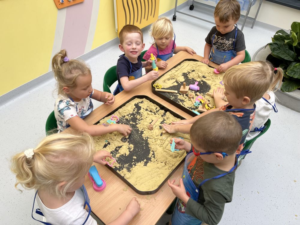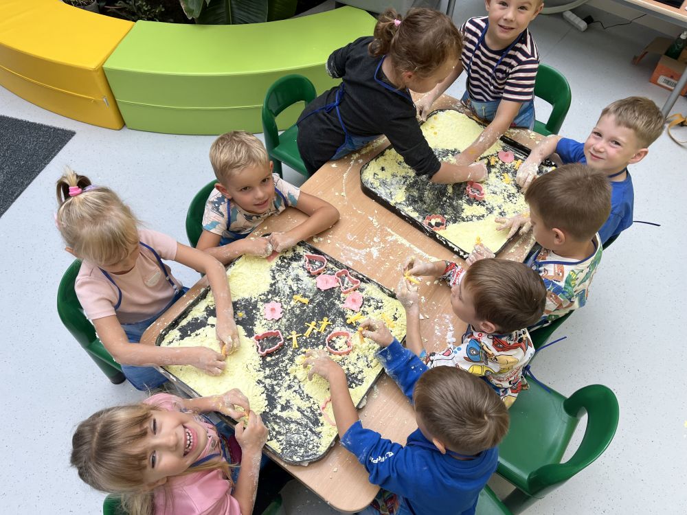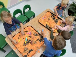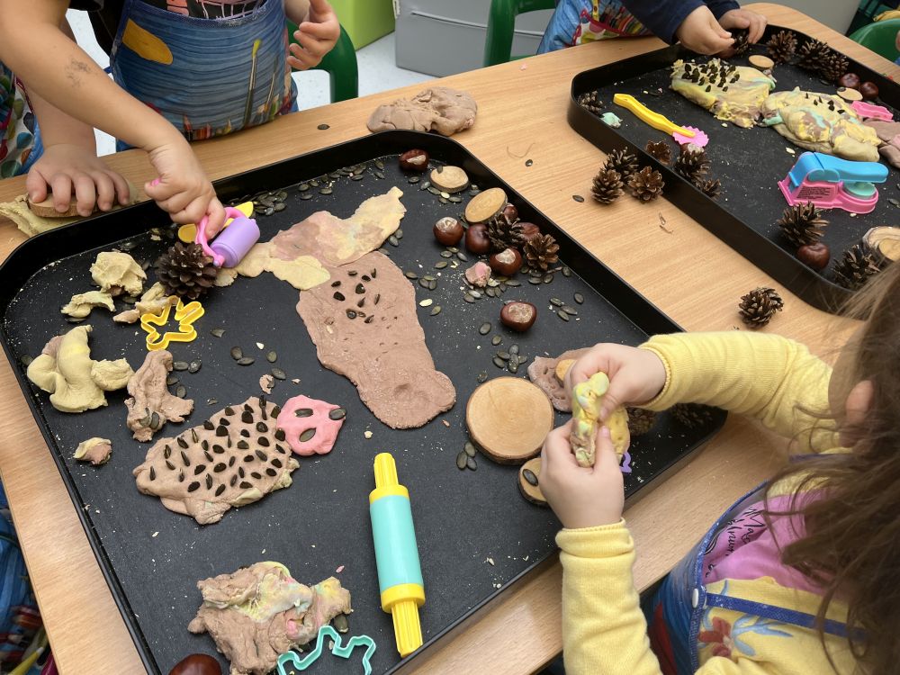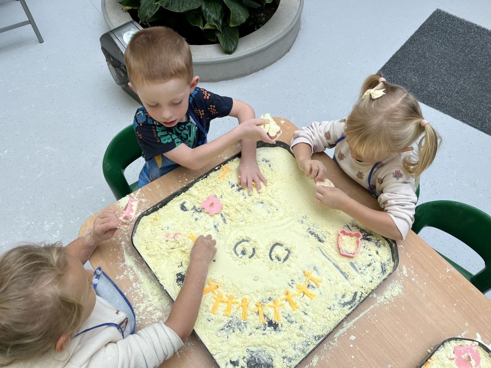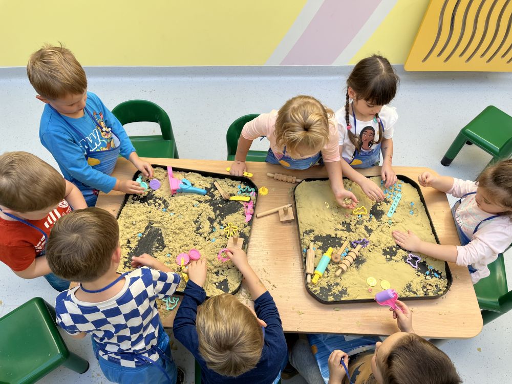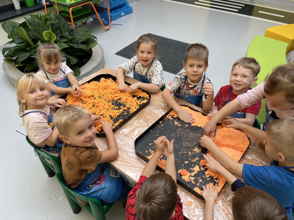 Dzieci odkrywały też „skarby ukryte w piasku”, rozwijając spostrzegawczość i cierpliwość. Nie zabrakło kreatywności – przedszkolaki same stworzyły ciastolinowe jeże oraz różnorodne jesienne pejzaże, wykazując się pomysłowością i zręcznością.