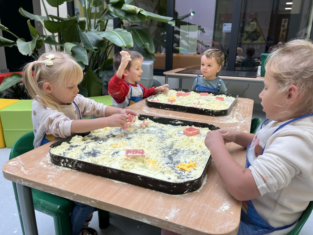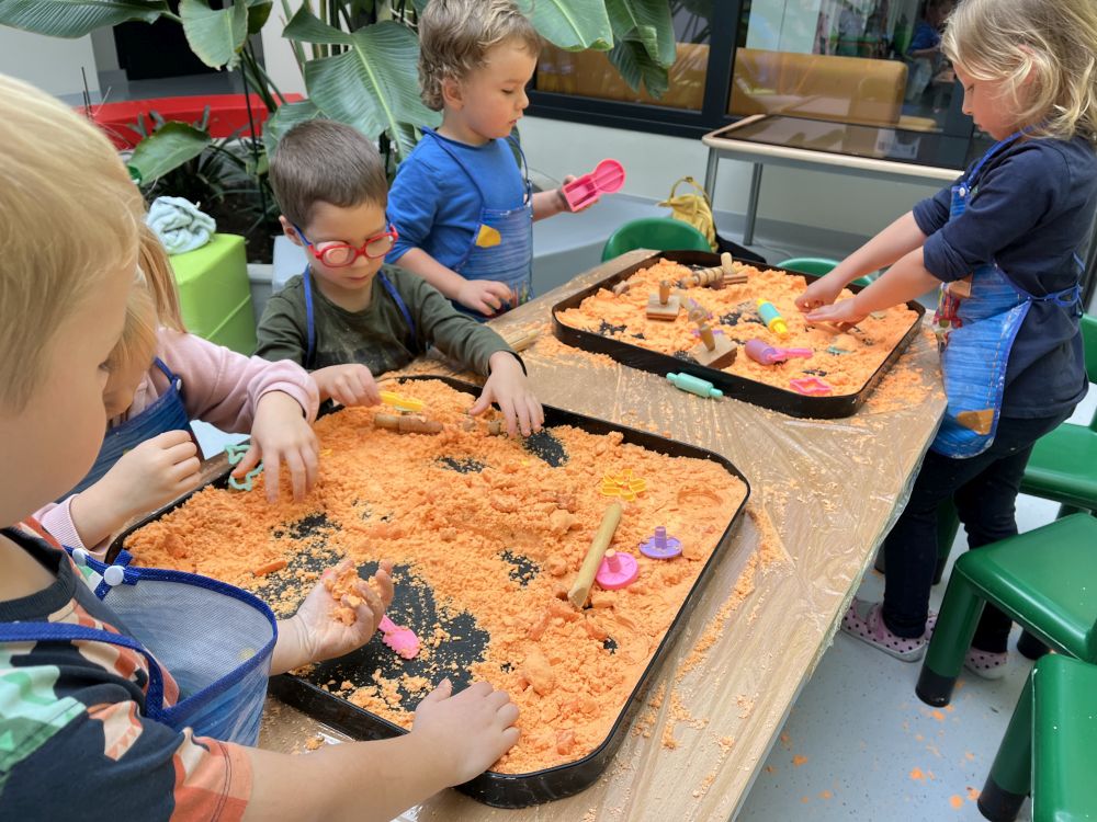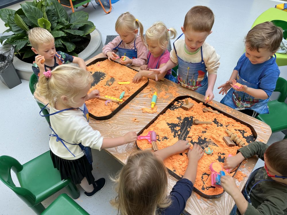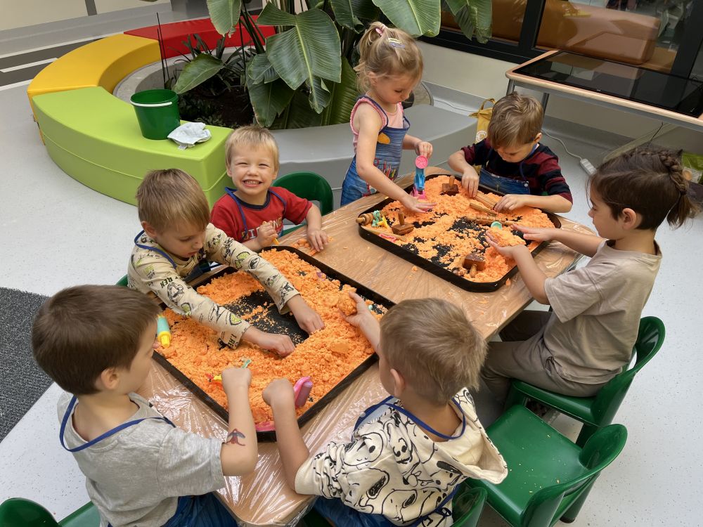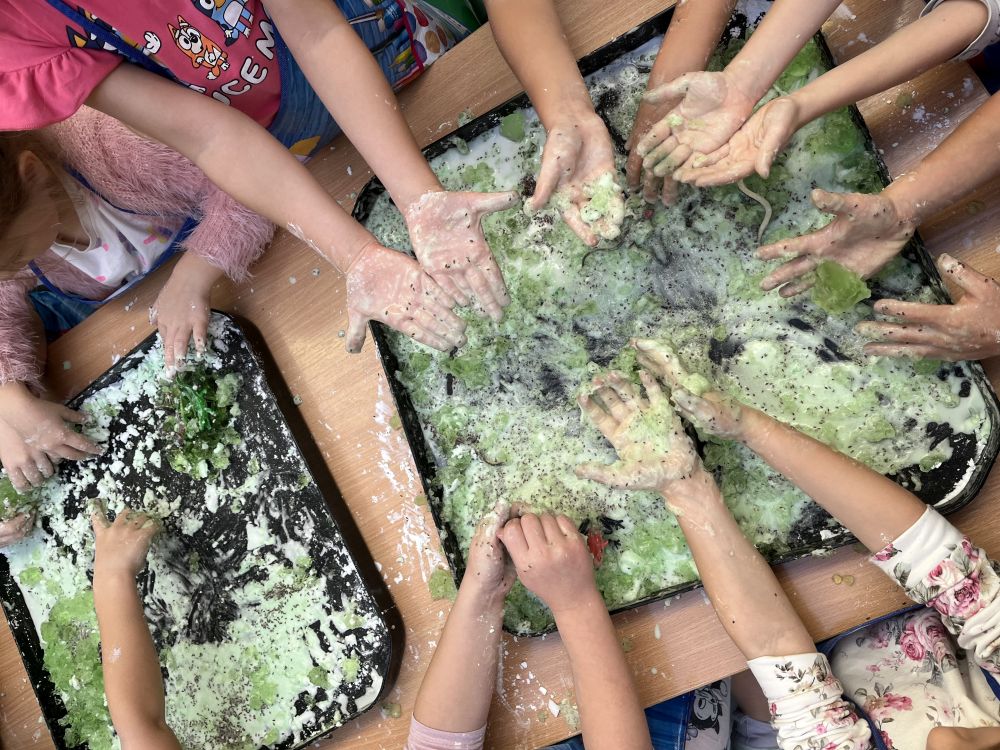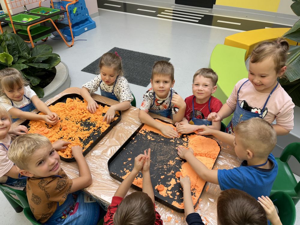 Nie zabrakło też galaretkowej krainy, pełnej śliskich, miękkich i kolorowych struktur, które zachęcały do zanurzania dłoni i eksperymentowania. Dużym hitem okazała się również Marchewkolina – dzieci dotykały marchewki w zupełnie nowej, niecodziennej postaci, tworząc własny marchewkowy świat.