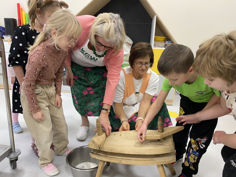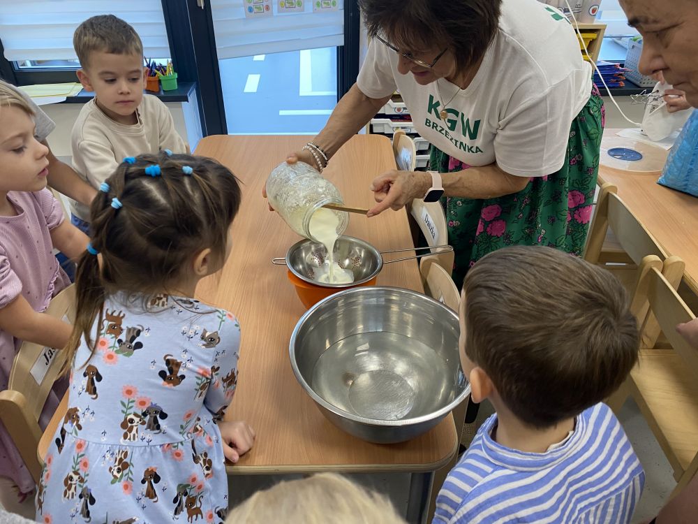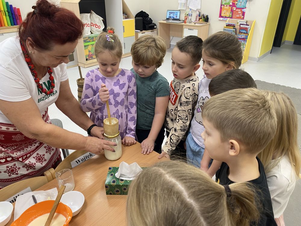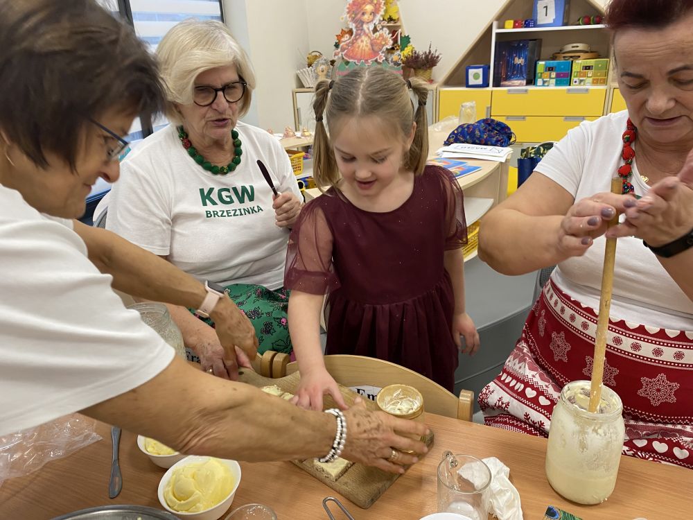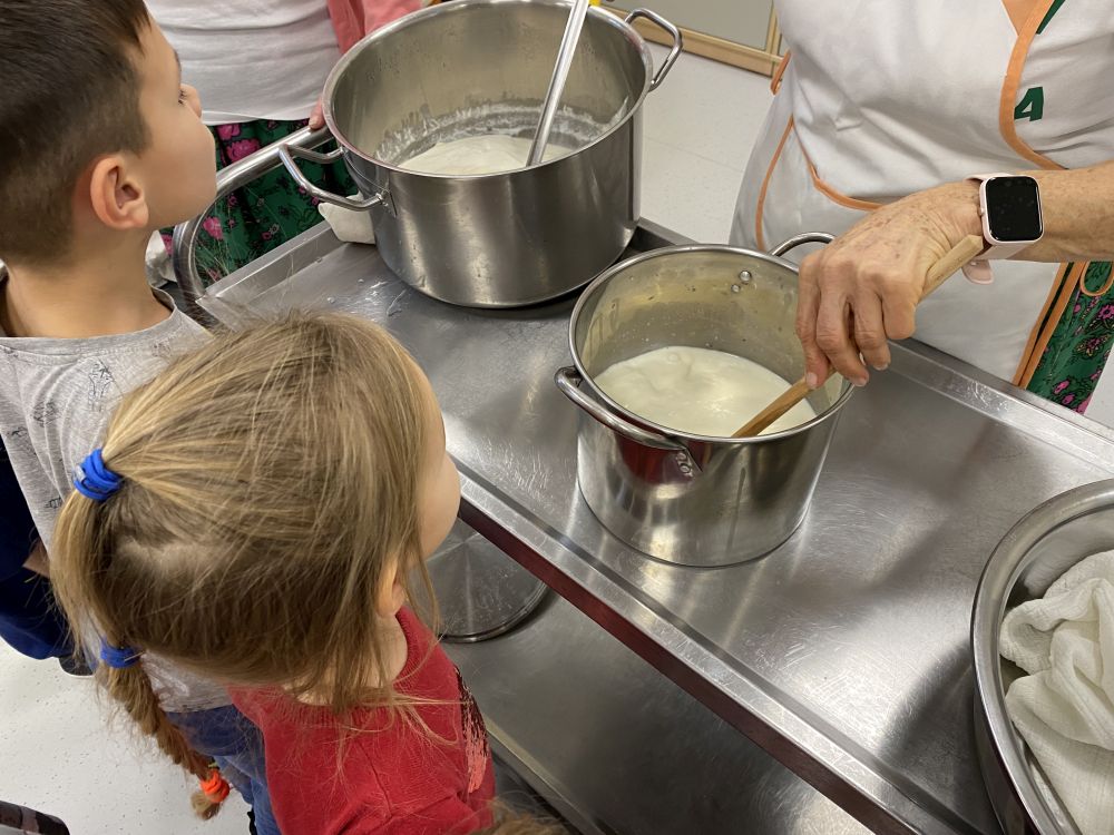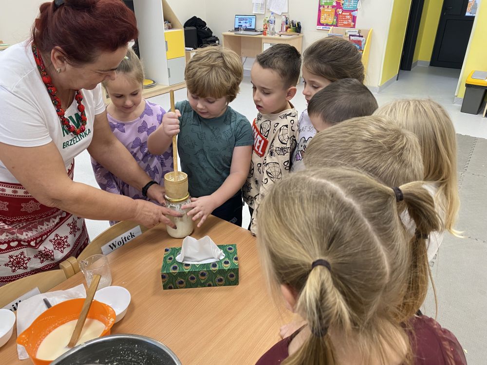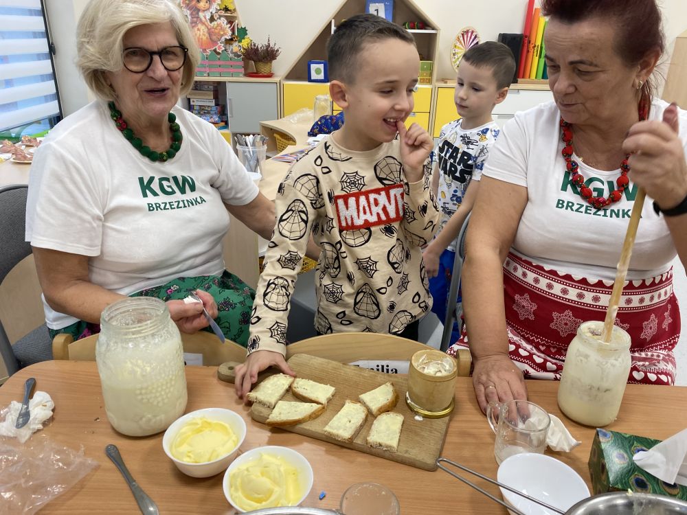 Dzieci w ramach projektu robiły masło i twaróg. Dzięki warsztatom dowiedziały się, jak powstają tradycyjne produkty spożywcze – od ubijania śmietany, aż po oddzielanie serwatki przy produkcji twarogu. Poznały różnice między produktami świeżymi a przetworzonymi, zobaczyły, jak ważna jest cierpliwość podczas pracy oraz jak wiele można zrobić samodzielnie z prostych składników. Na koniec każdy spróbował wykonanego przez siebie wyrobu, z dumą kosztując efektów własnej pracy.