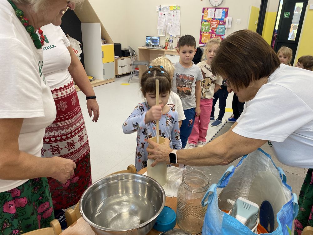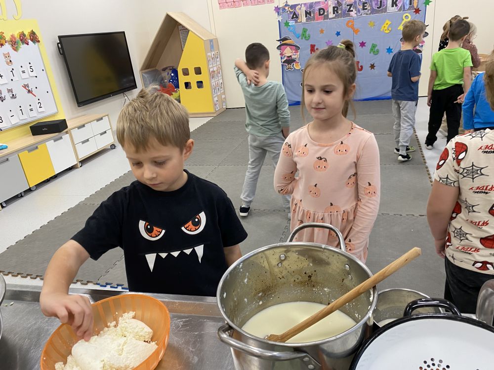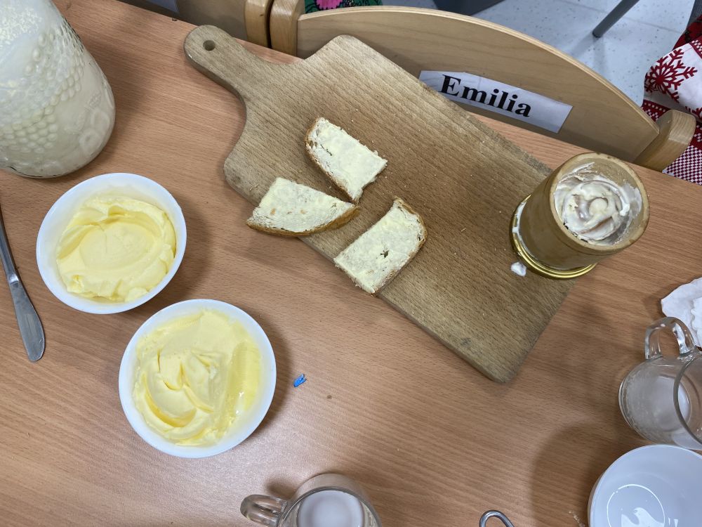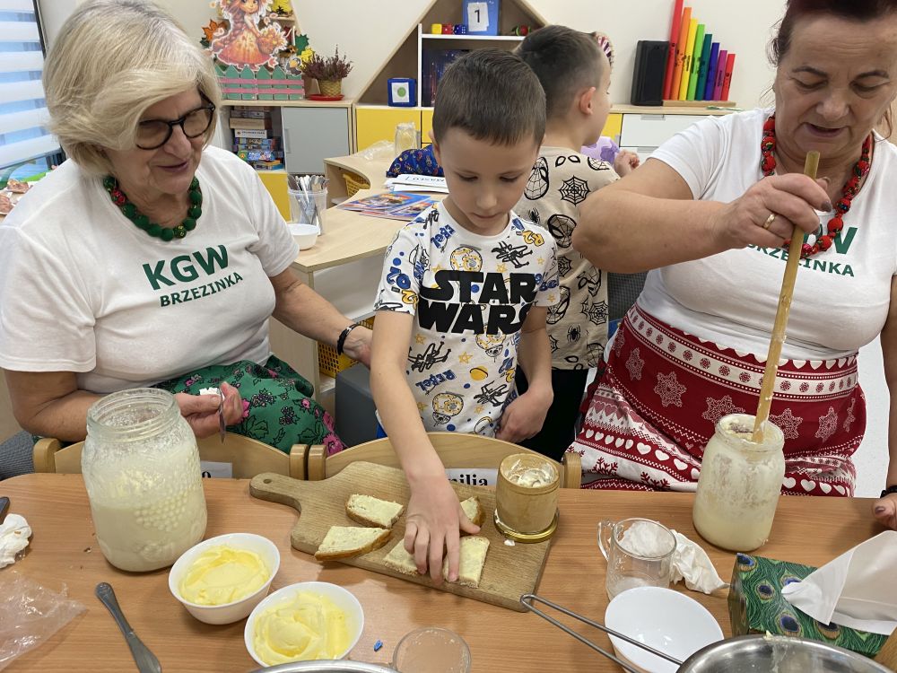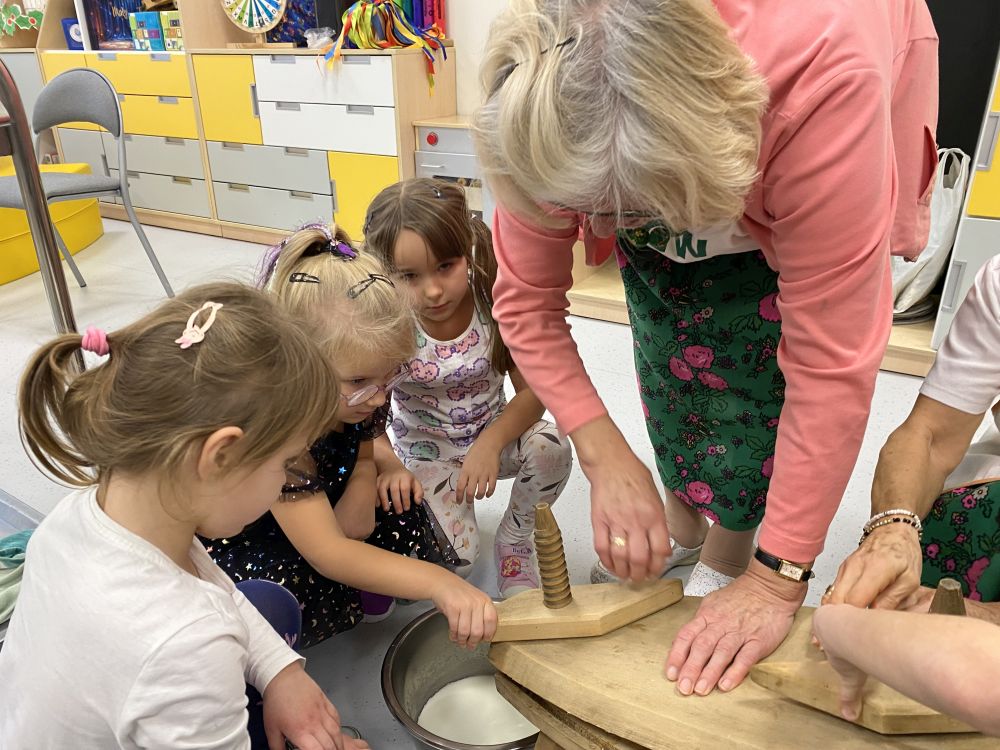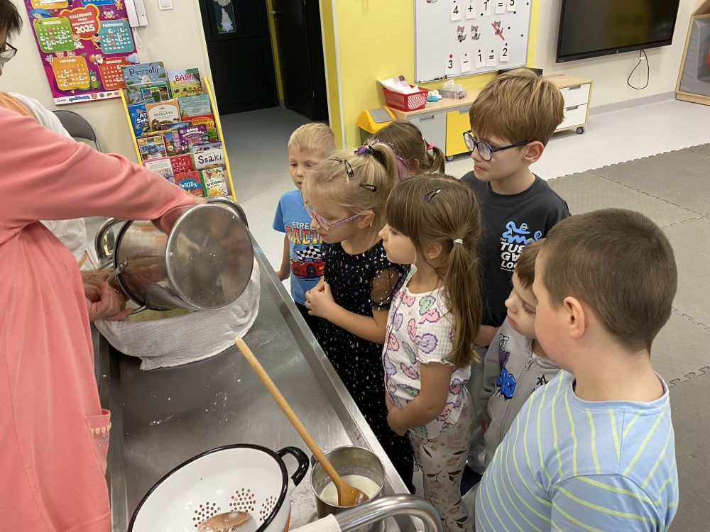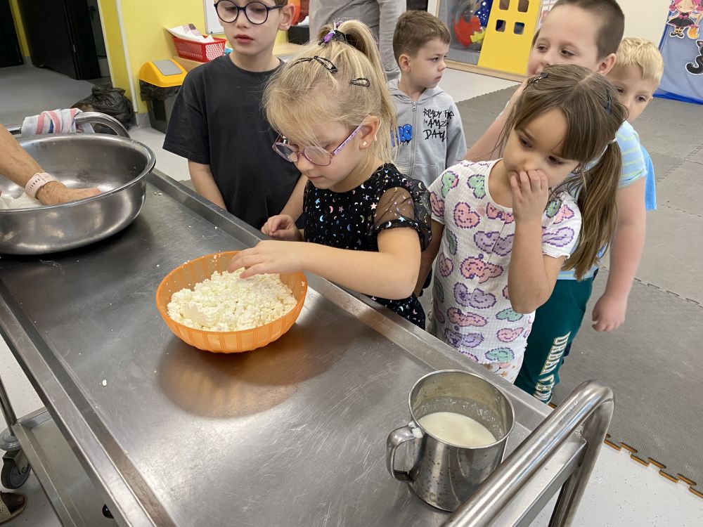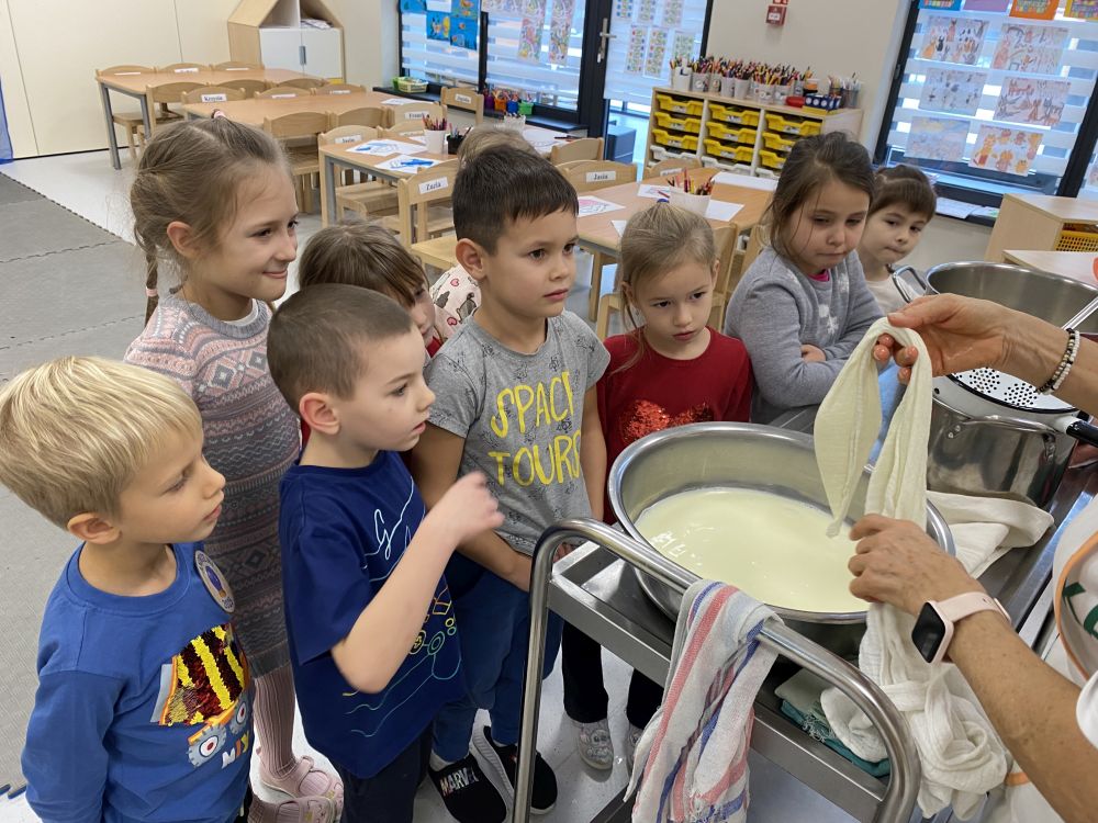 Dzieci w ramach projektu robiły masło i twaróg. Dzięki warsztatom dowiedziały się, jak powstają tradycyjne produkty spożywcze – od ubijania śmietany, aż po oddzielanie serwatki przy produkcji twarogu. Poznały różnice między produktami świeżymi a przetworzonymi, zobaczyły, jak ważna jest cierpliwość podczas pracy oraz jak wiele można zrobić samodzielnie z prostych składników. Na koniec każdy spróbował wykonanego przez siebie wyrobu, z dumą kosztując efektów własnej pracy.