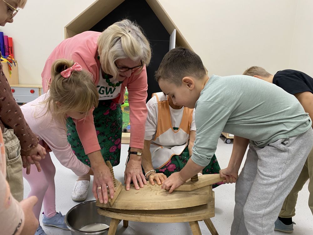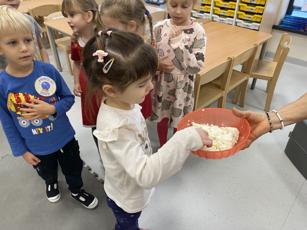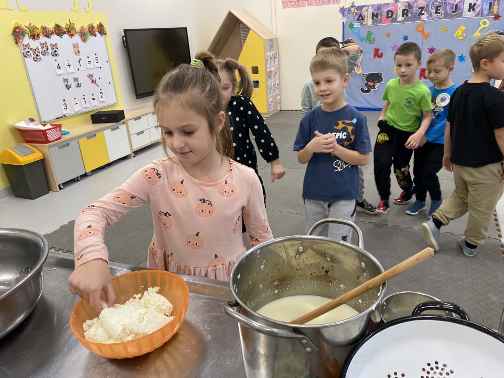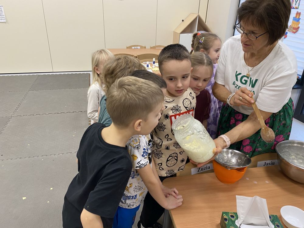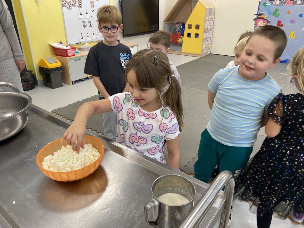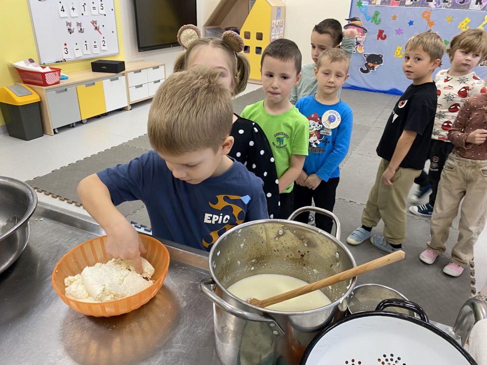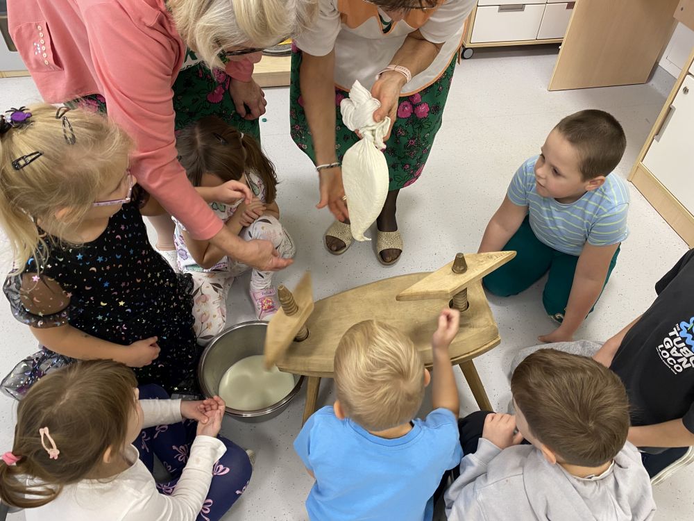 Dzieci w ramach projektu robiły masło i twaróg. Dzięki warsztatom dowiedziały się, jak powstają tradycyjne produkty spożywcze – od ubijania śmietany, aż po oddzielanie serwatki przy produkcji twarogu. Poznały różnice między produktami świeżymi a przetworzonymi, zobaczyły, jak ważna jest cierpliwość podczas pracy oraz jak wiele można zrobić samodzielnie z prostych składników. Na koniec każdy spróbował wykonanego przez siebie wyrobu, z dumą kosztując efektów własnej pracy.