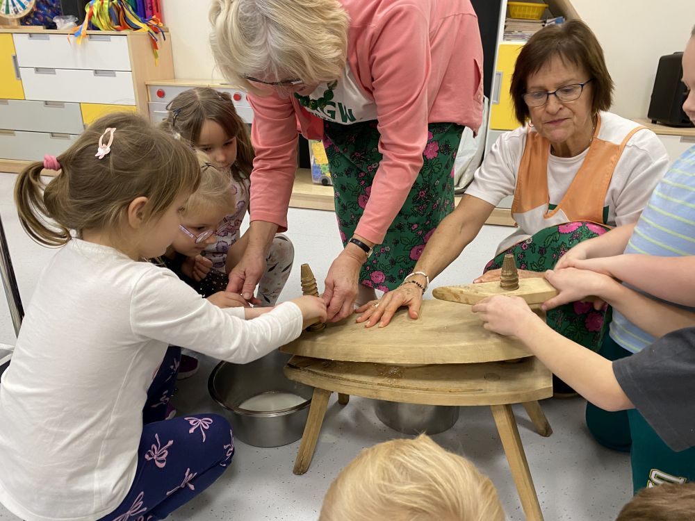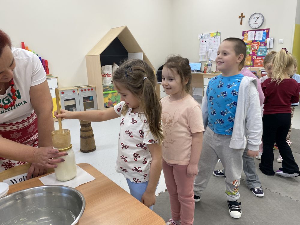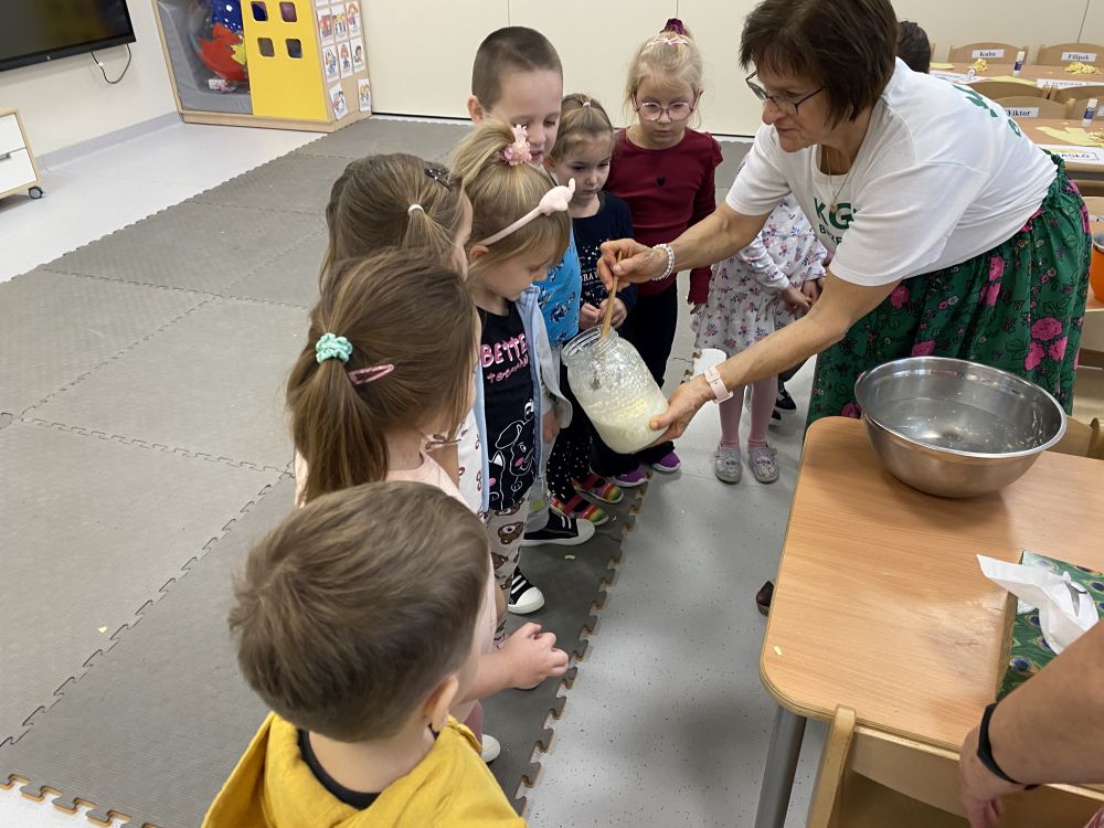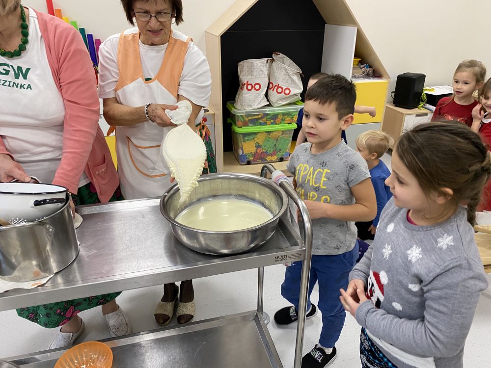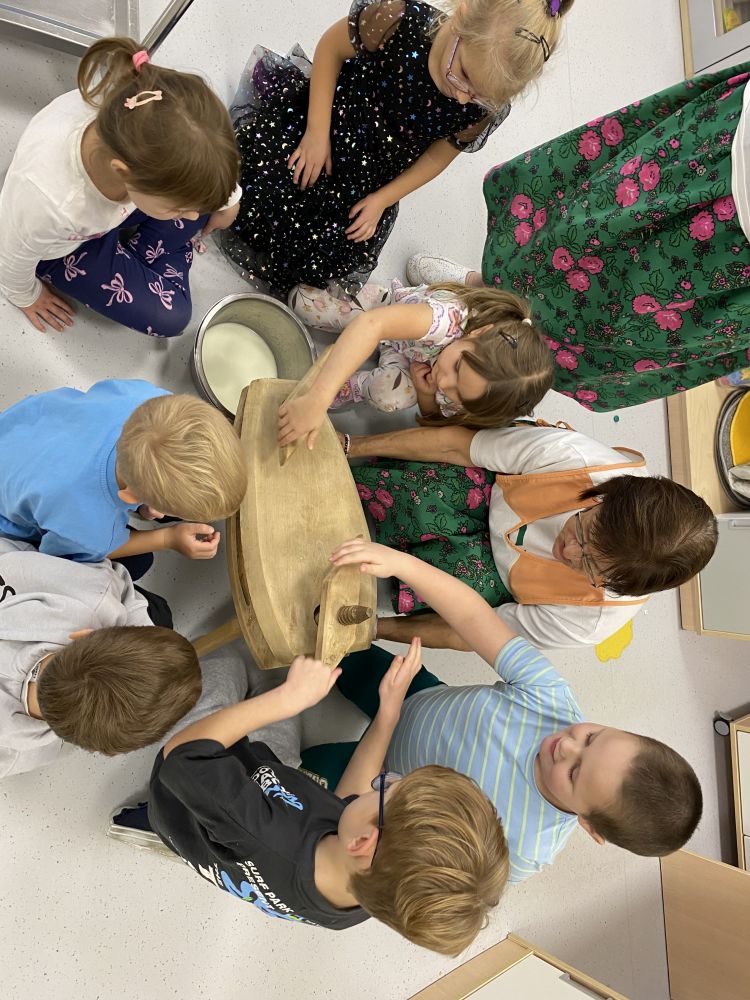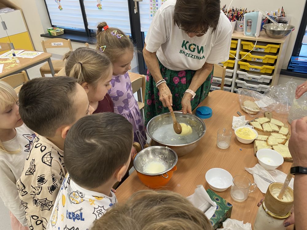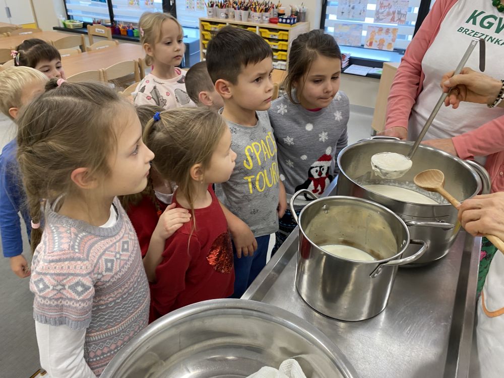Dzieci w ramach projektu robiły masło i twaróg. Dzięki warsztatom dowiedziały się, jak powstają tradycyjne produkty spożywcze – od ubijania śmietany, aż po oddzielanie serwatki przy produkcji twarogu. Poznały różnice między produktami świeżymi a przetworzonymi, zobaczyły, jak ważna jest cierpliwość podczas pracy oraz jak wiele można zrobić samodzielnie z prostych składników. Na koniec każdy spróbował wykonanego przez siebie wyrobu, z dumą kosztując efektów własnej pracy.
