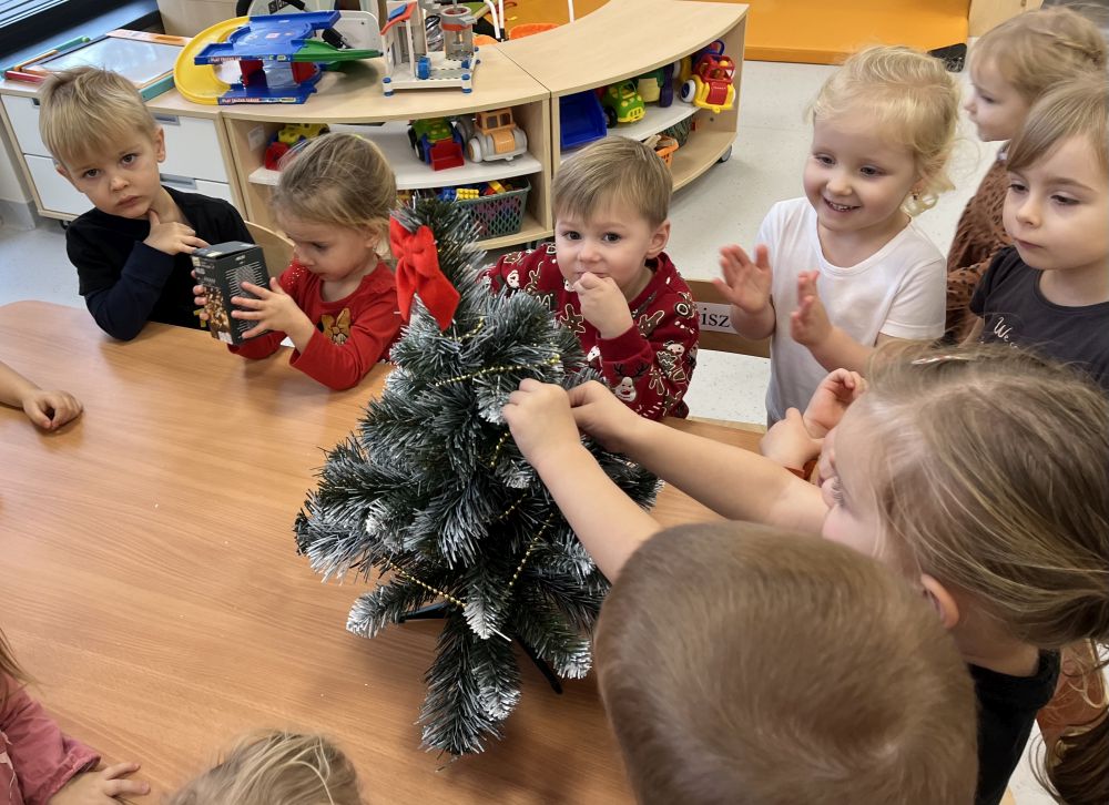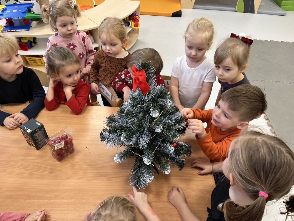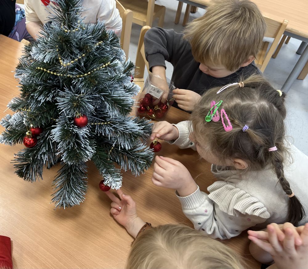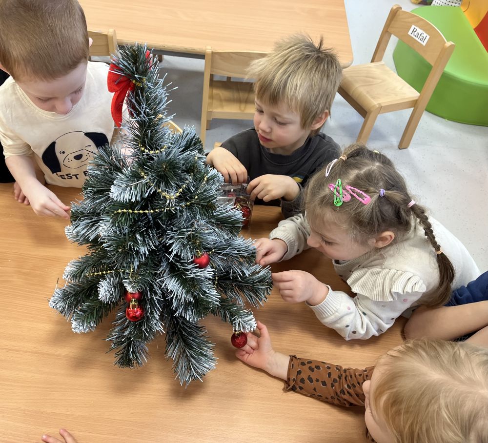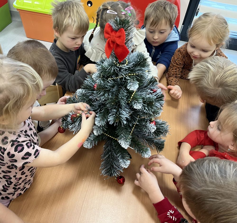 W grupie Biedronek zapanował prawdziwie magiczny, świąteczny nastrój! Nasze przedszkolaki z ogromnym zaangażowaniem i radością udekorowały przedszkolną choinkę. Dzieci starannie wybierały bombki, zawieszały kolorowe łańcuchy, dzięki czemu drzewko wygląda wyjątkowo i niepowtarzalnie.