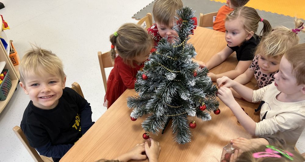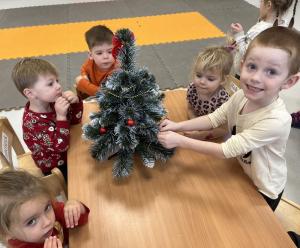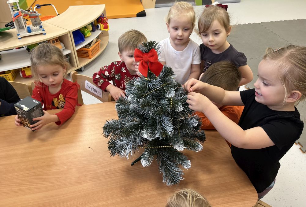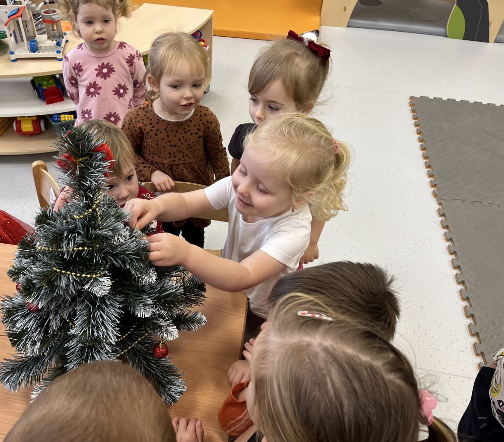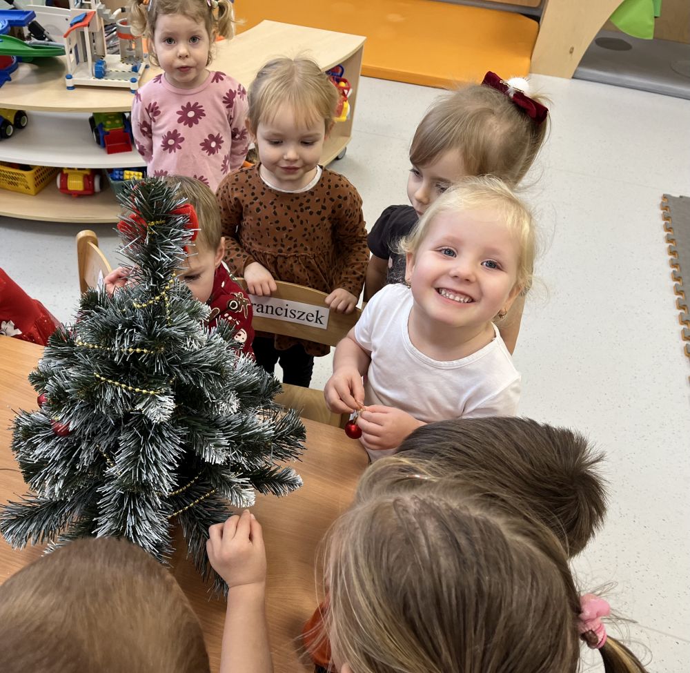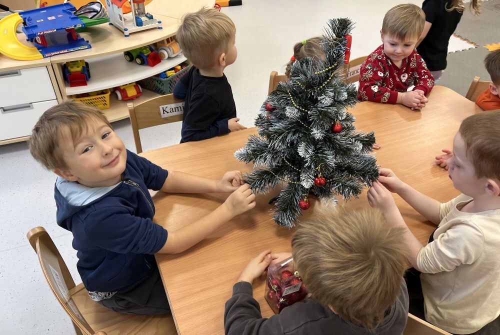 W grupie Biedronek zapanował prawdziwie magiczny, świąteczny nastrój! Nasze przedszkolaki z ogromnym zaangażowaniem i radością udekorowały przedszkolną choinkę. Dzieci starannie wybierały bombki, zawieszały kolorowe łańcuchy, dzięki czemu drzewko wygląda wyjątkowo i niepowtarzalnie.