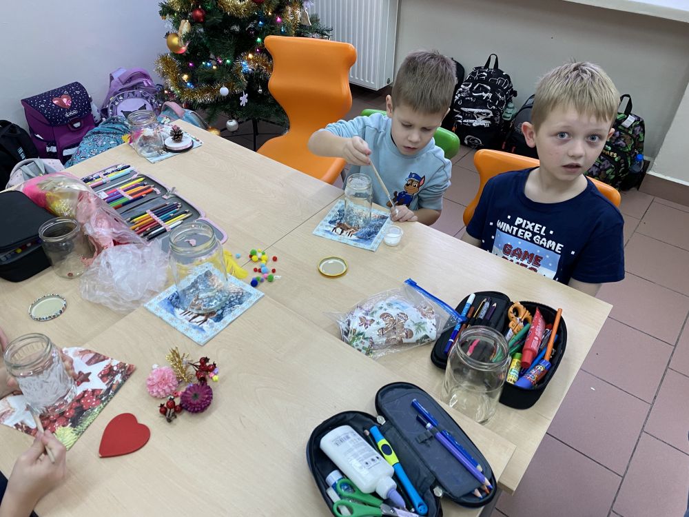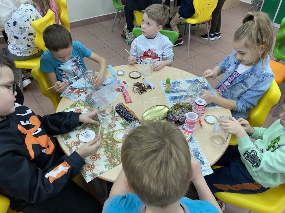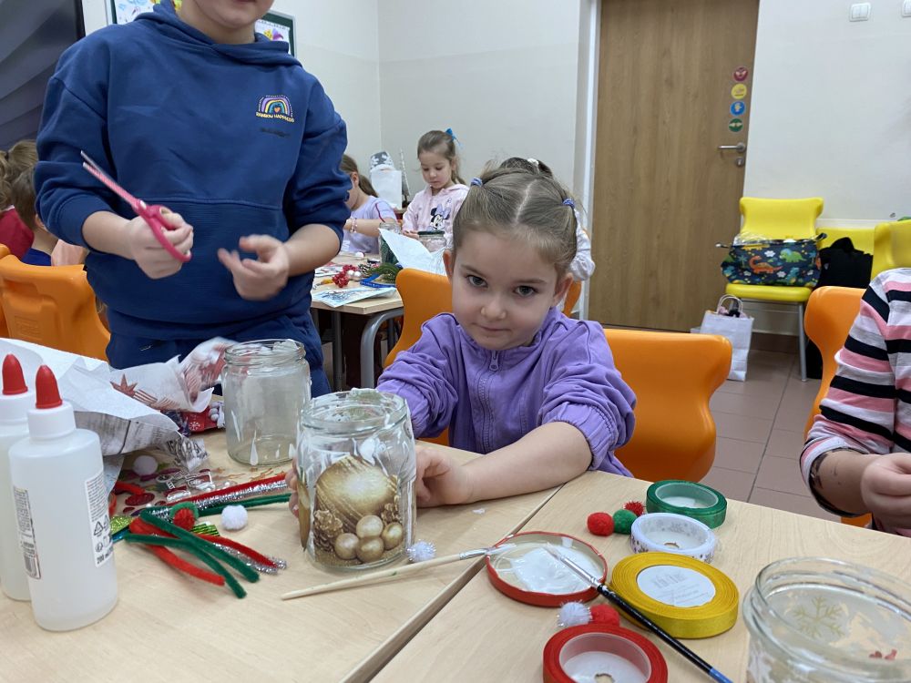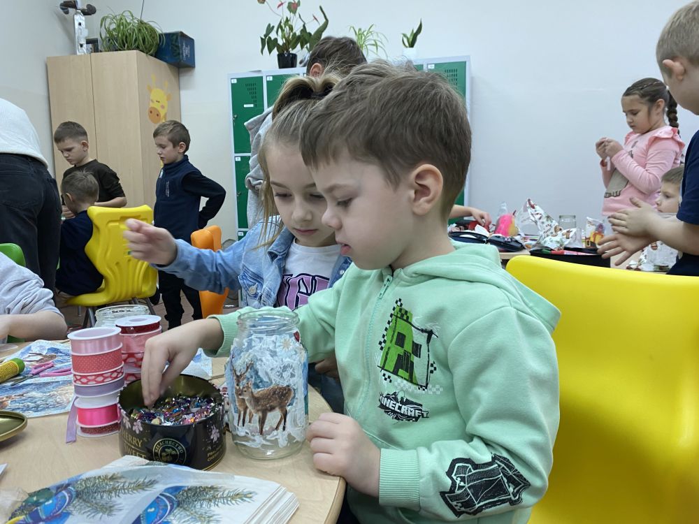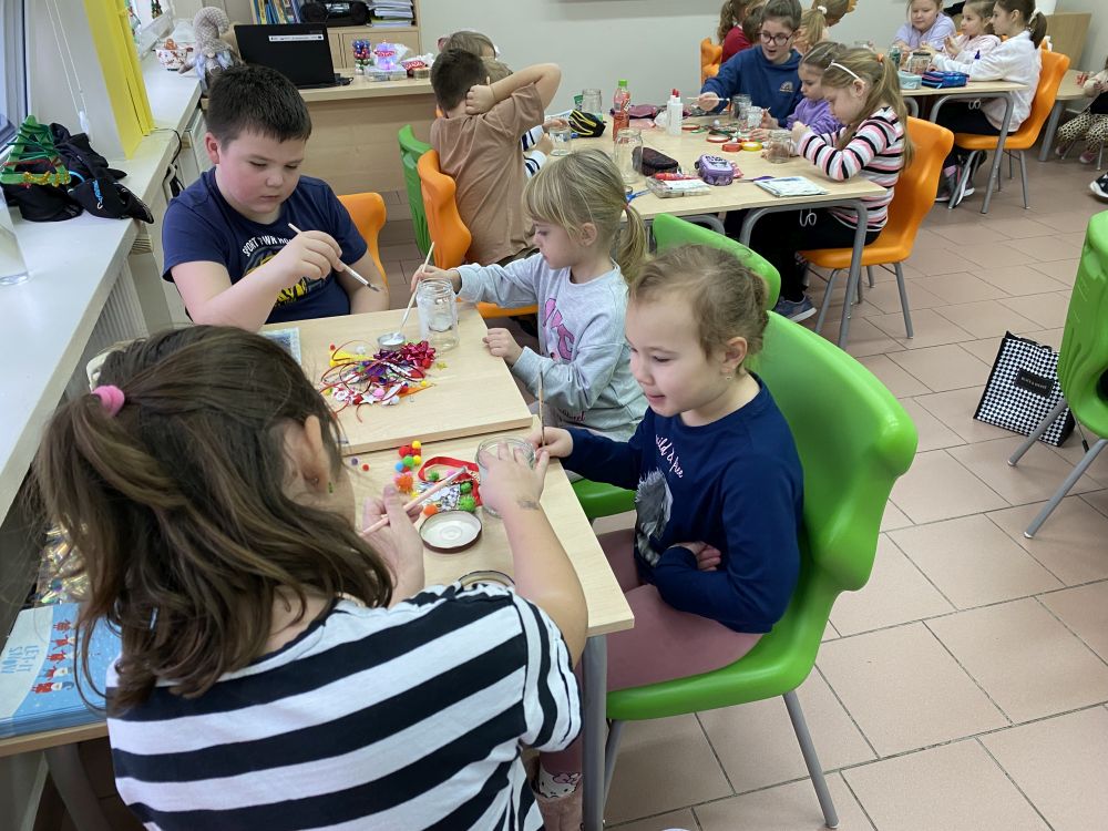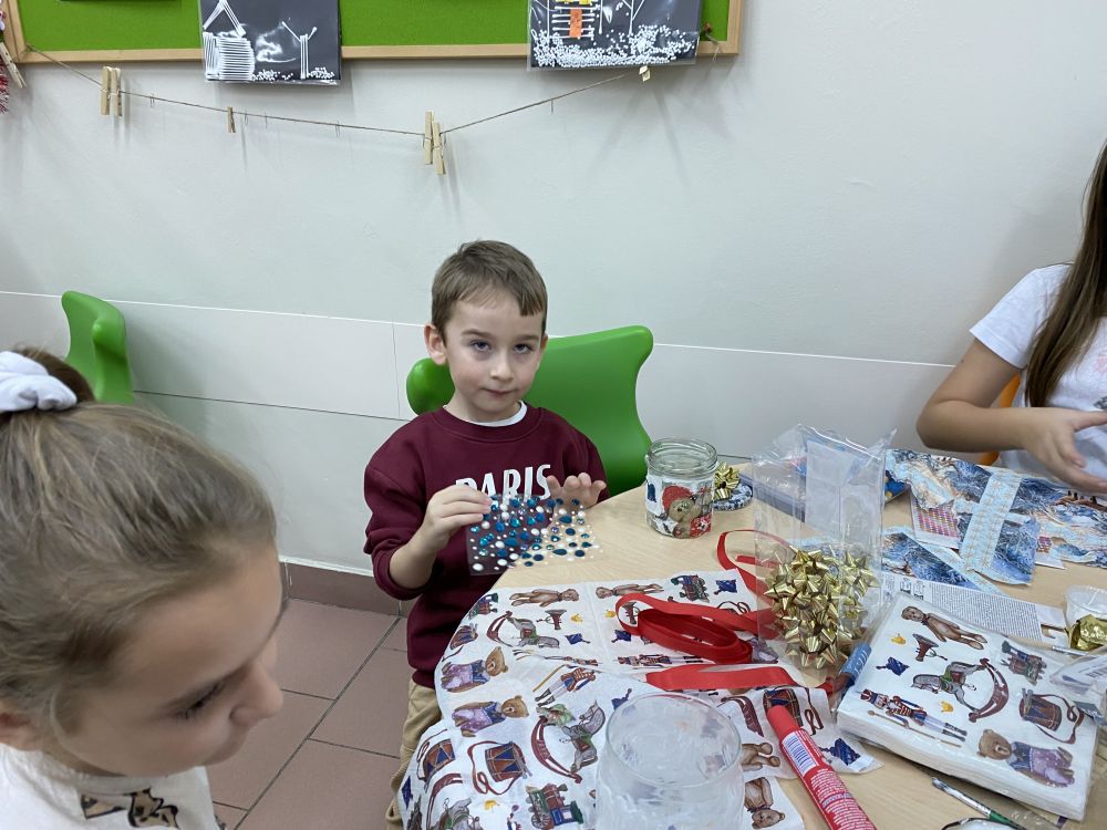 Grupa „Jeżyki” udała się na warsztaty do swoich starszych kolegów ze Szkoły Podstawowej w Brzezince. Wspólnie z ich pomocą dzieci wykonały lampiony z serwetek oraz różnych materiałów przyniesionych z domu. Każdy lampion był wyjątkowy i niepowtarzalny. Podczas spotkania dzieci zintegrowały się z kolegami i koleżankami, a także miały okazję zobaczyć szkołę i poznać jej wnętrze.