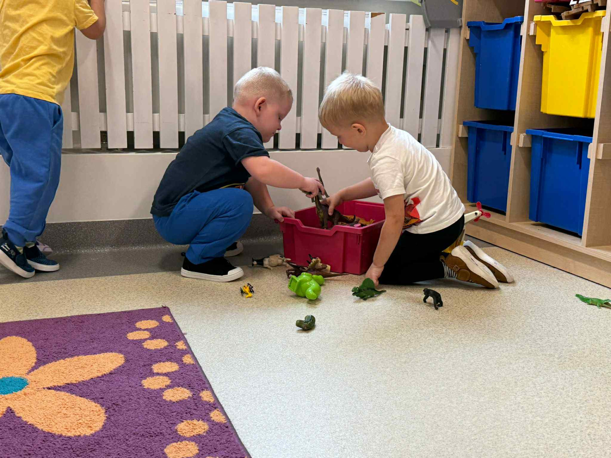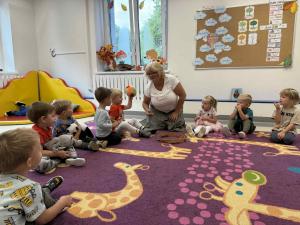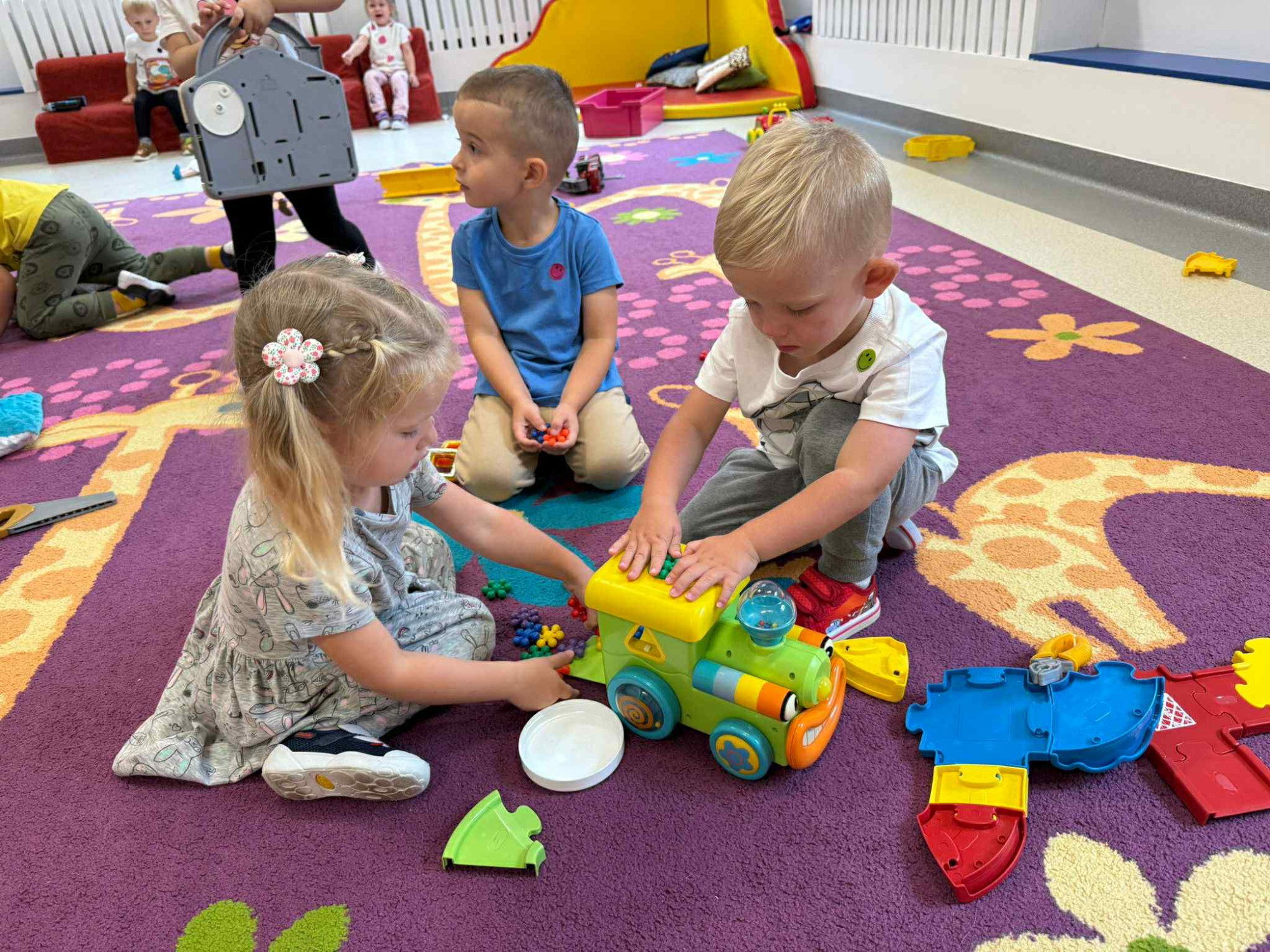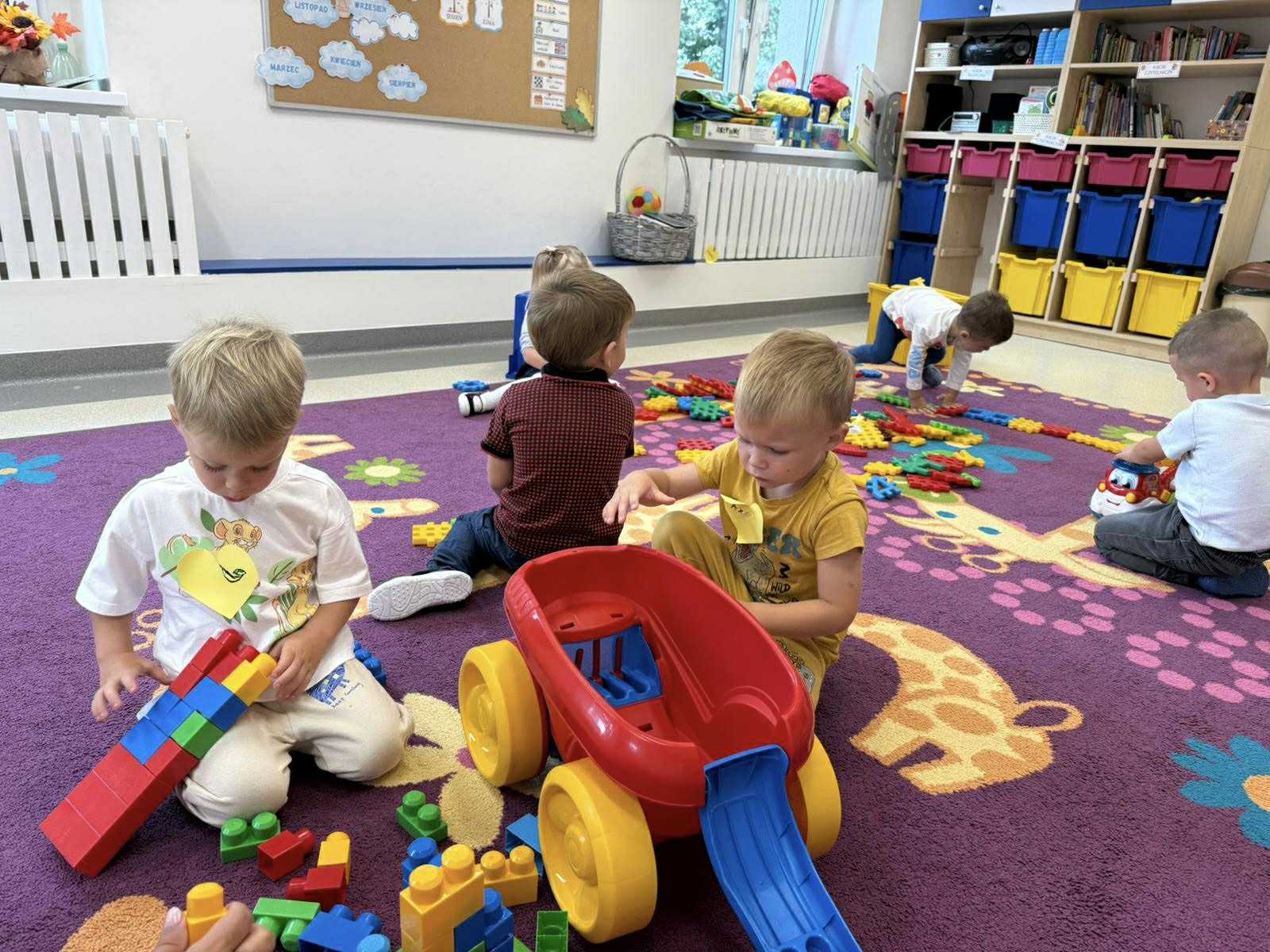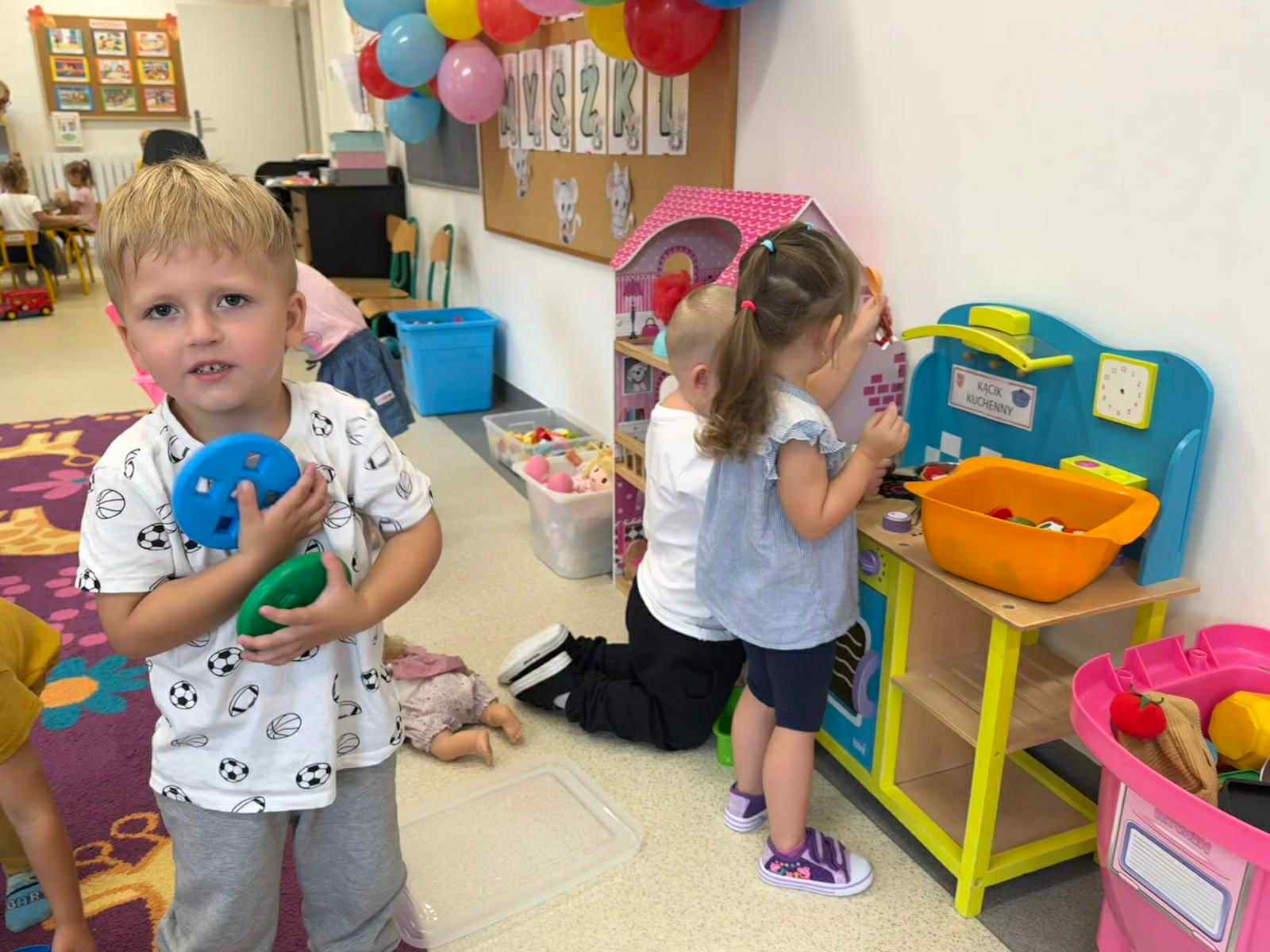 Dzieci poznały swoje panie, nowe koleżanki i kolegów, a także zasady obowiązujące w sali. Było budowanie z klocków, pierwsze wspólne tańce, zabawy ruchowe i oczywiście odkrywanie przedszkolnych zabawek.