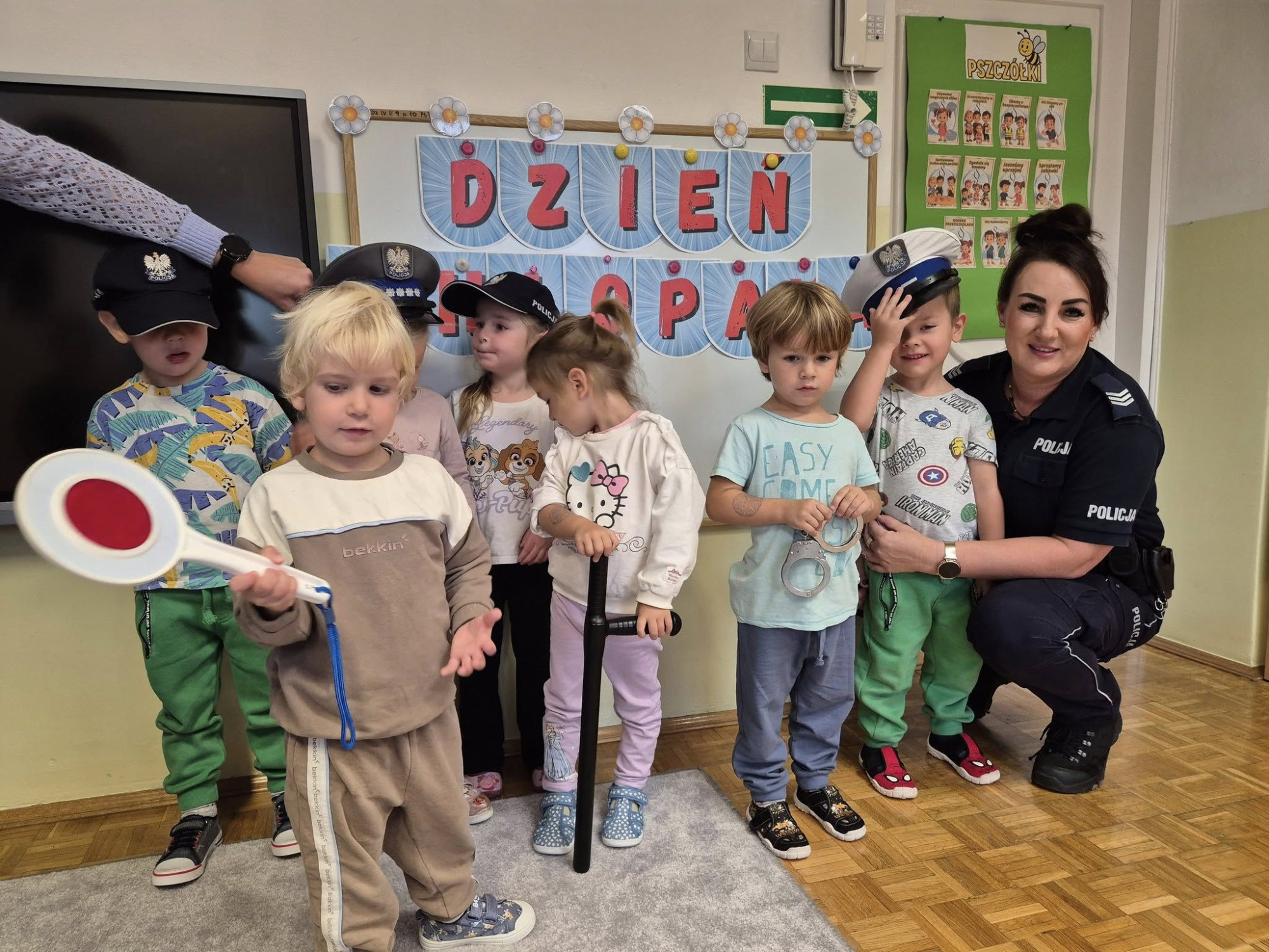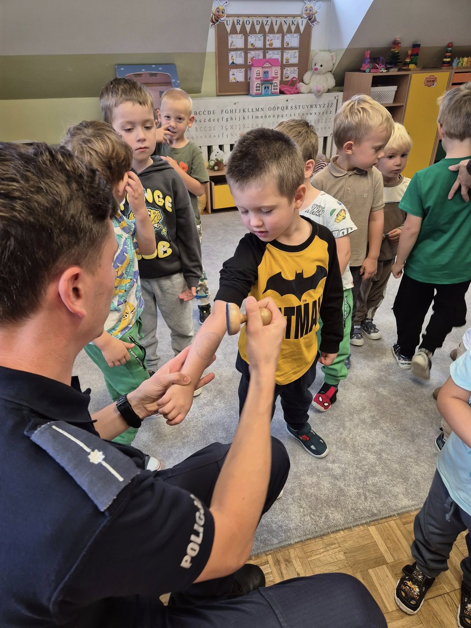 Tematem spotkania, równie ważnym jak bezpieczeństwo, było dla przedszkolaków poznanie tajników służby policjanta. Każde dziecko chciało obejrzeć z bliska kajdanki, lizak, a także przymierzyć policyjną czapkę. Było to bardzo udane spotkanie. Na zakończenie wszyscy uczestnicy spotkania wykonali z policjantami pamiątkowe zdjęcie.