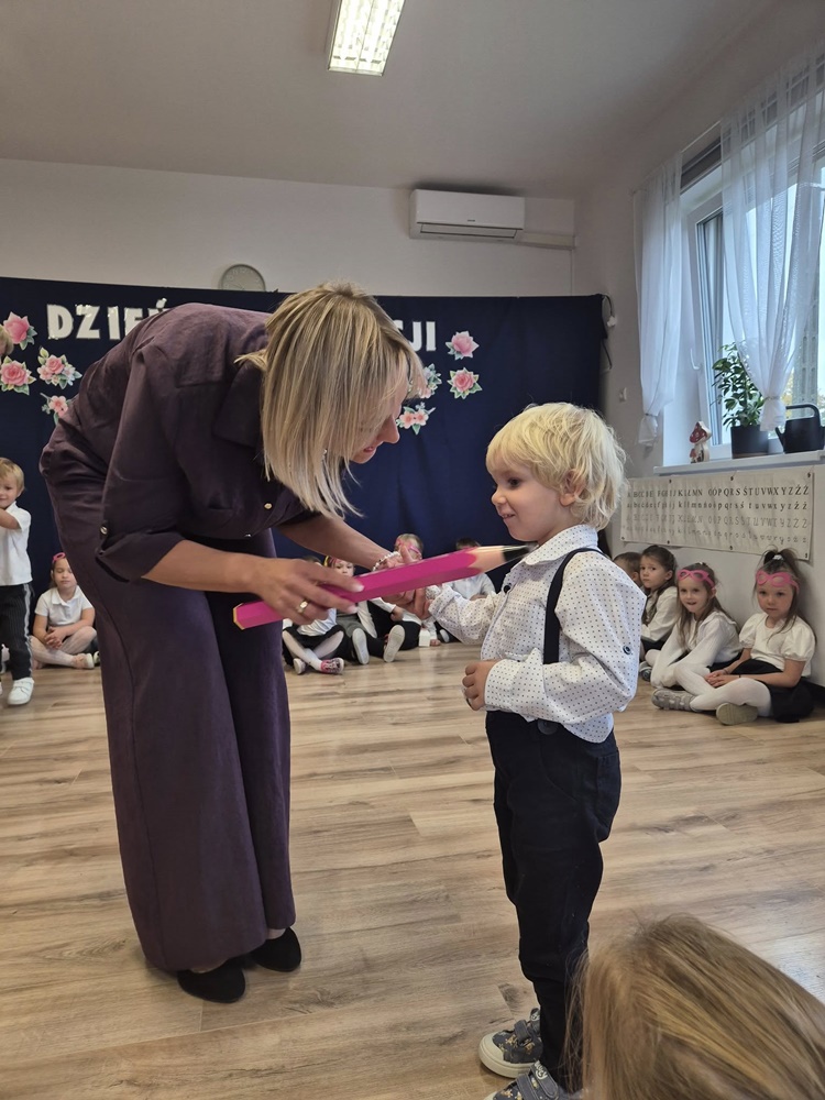 Po części artystycznej, głos zabrała pani dyrektor Renata Krakowczak dziękując za wspaniały występ i przystąpiła do aktu pasowania naszych nowych kolegów na prawdziwych przedszkolaków. Wszyscy pracownicy naszego przedszkola otrzymali, także miłe upominki które przygotowała Rada Rodziców. Dziękujemy!