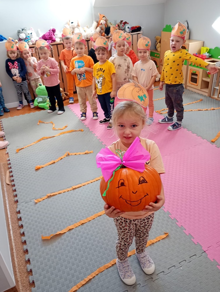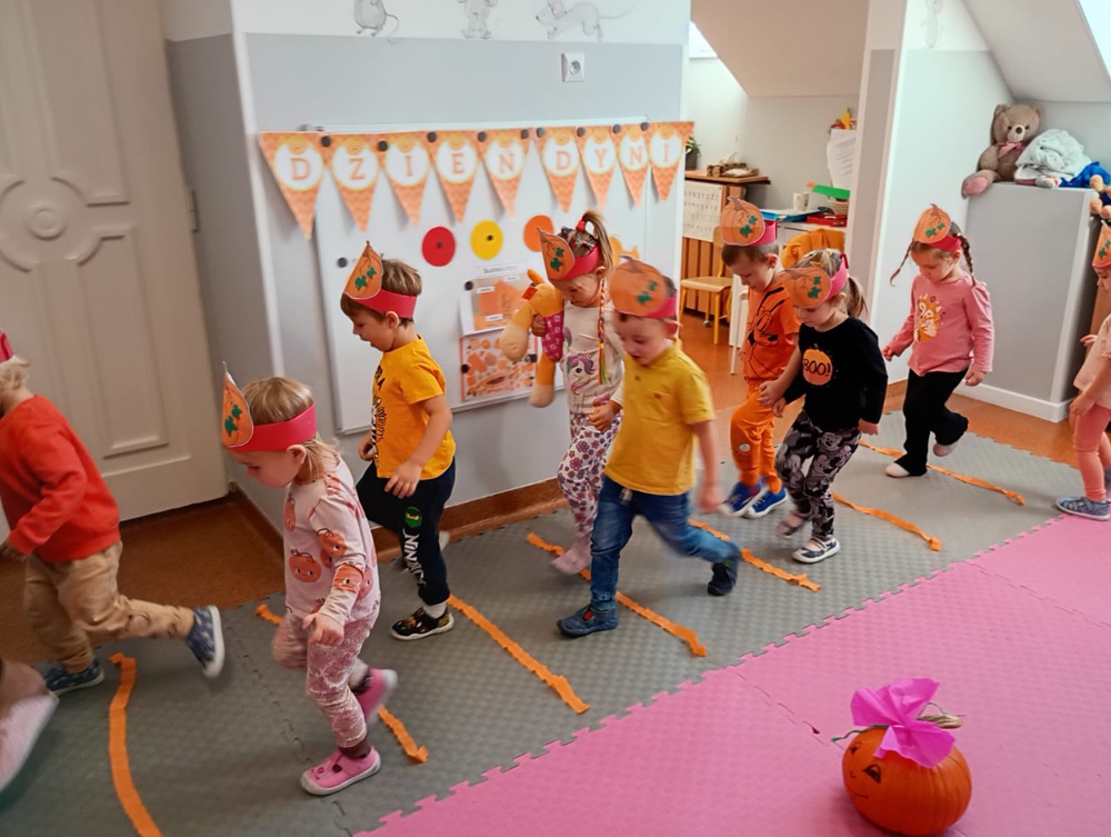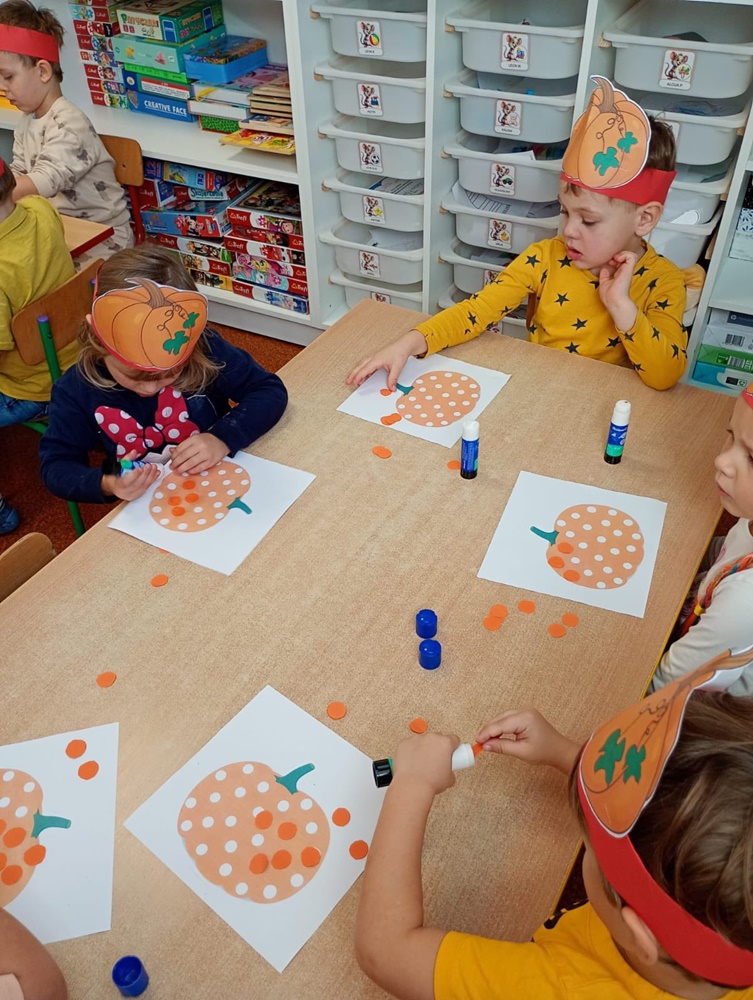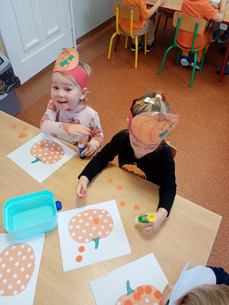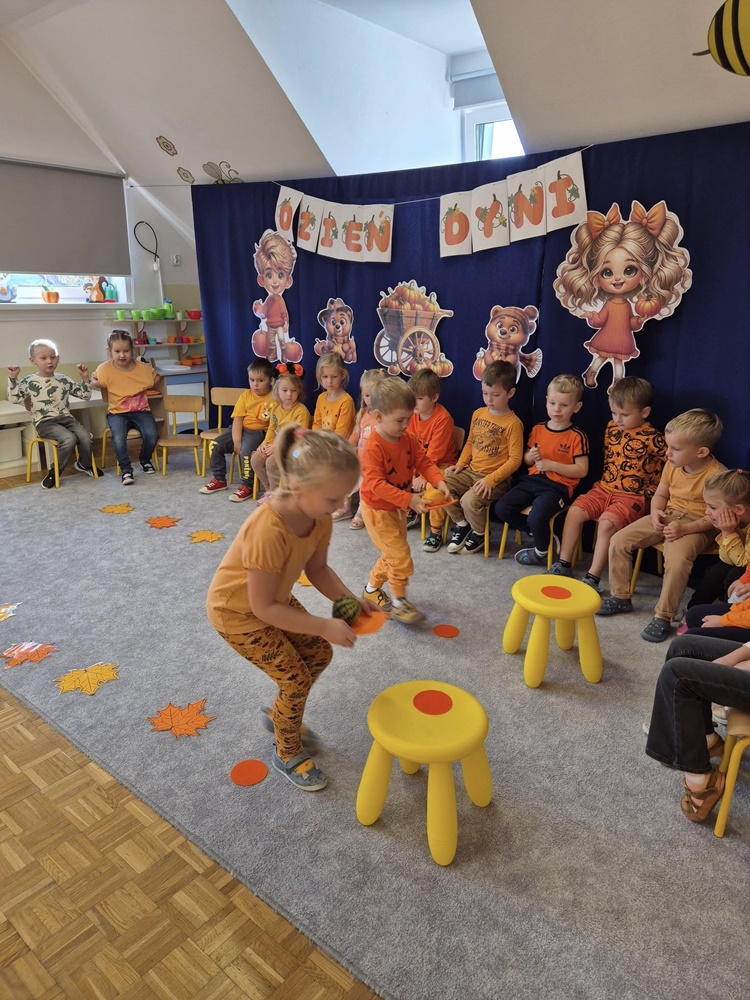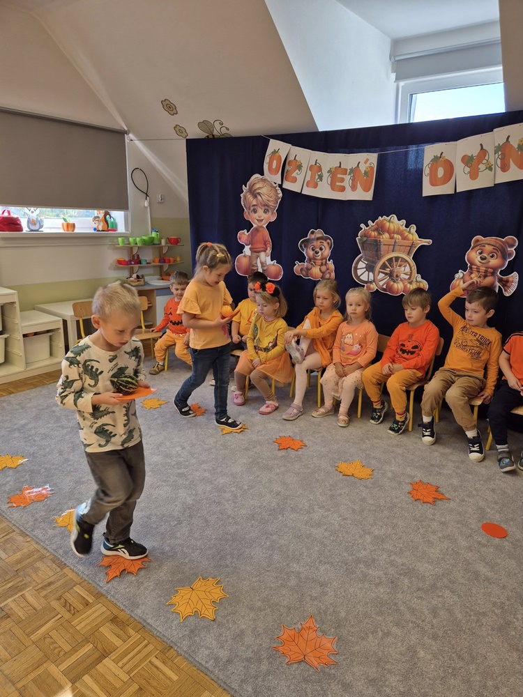 Podczas spotkania dzieci w swoich salach uczestniczyły w zabawach muzyczno - ruchowych, plastycznych, rozwiązywały zagadki, wykonywały prace plastyczne, bawiły się darami jesieni. Było dyniowo, marchewkowo, kasztanowo i jesiennie pomarańczowo.