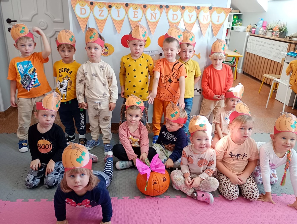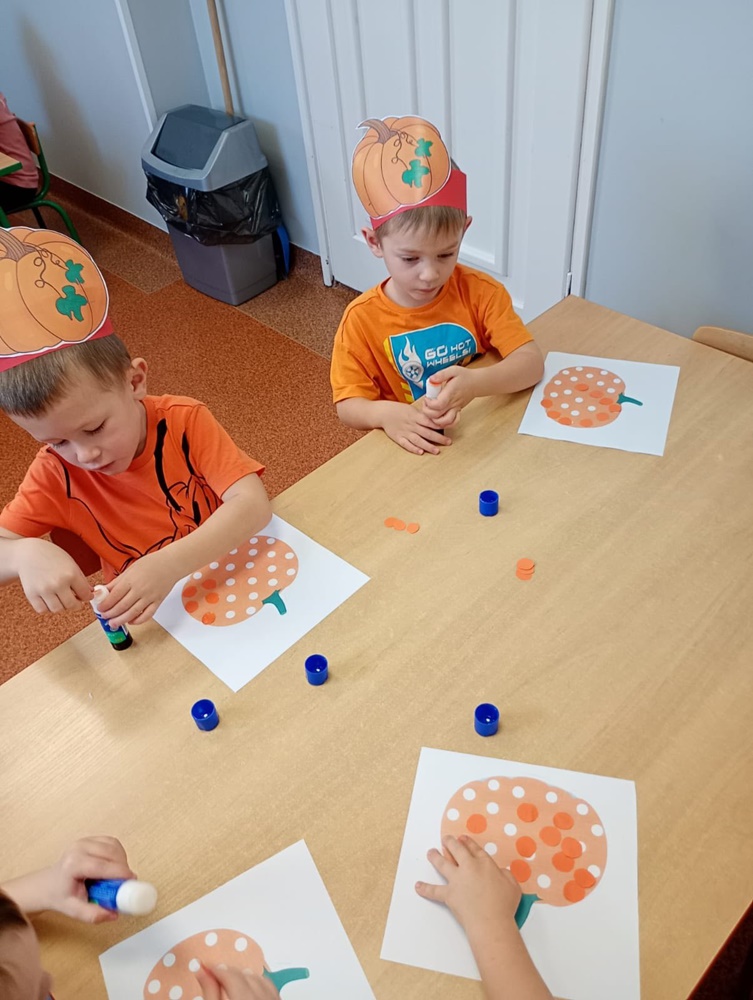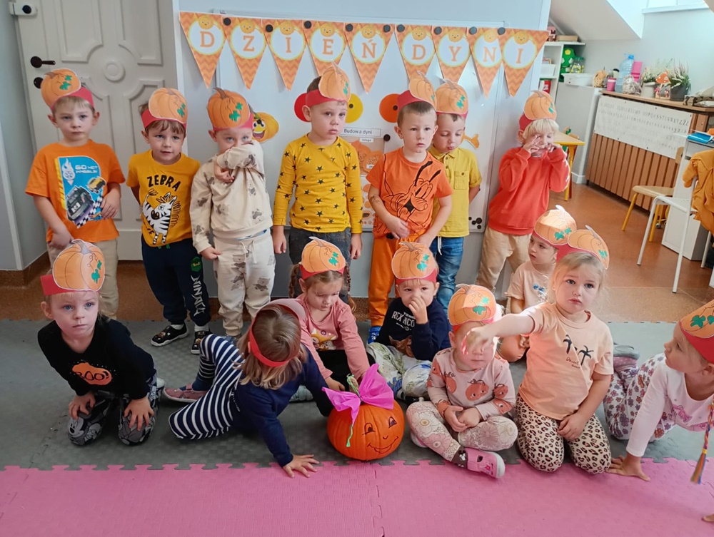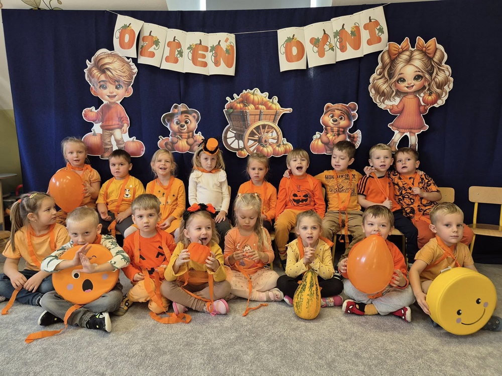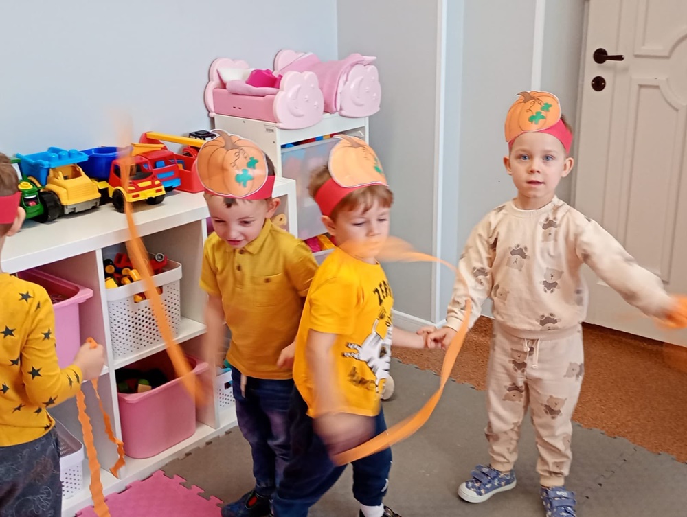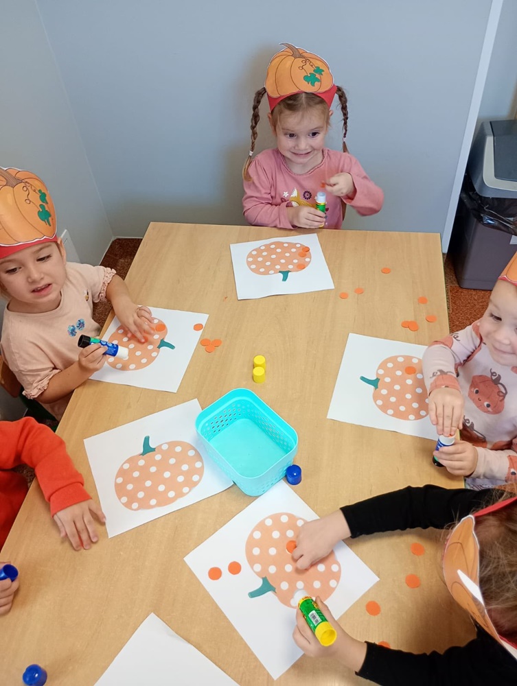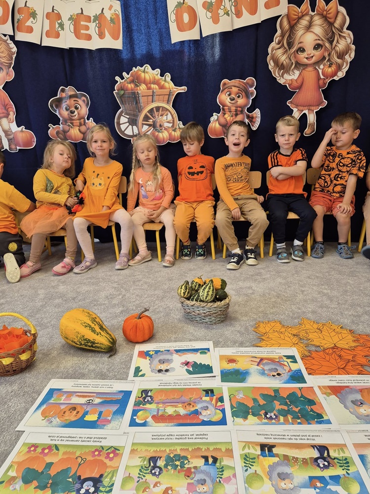 Podczas spotkania dzieci w swoich salach uczestniczyły w zabawach muzyczno - ruchowych, plastycznych, rozwiązywały zagadki, wykonywały prace plastyczne, bawiły się darami jesieni. Było dyniowo, marchewkowo, kasztanowo i jesiennie pomarańczowo.