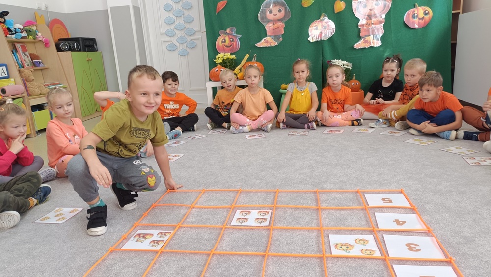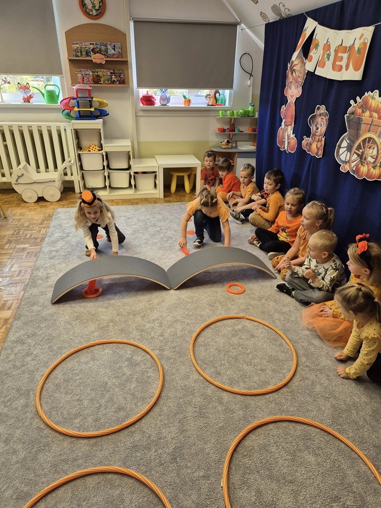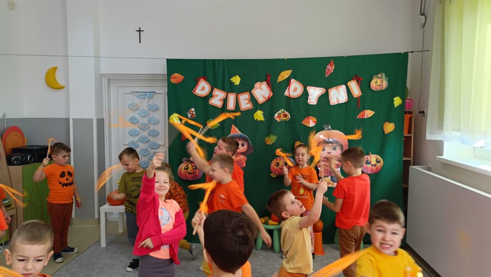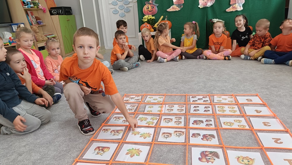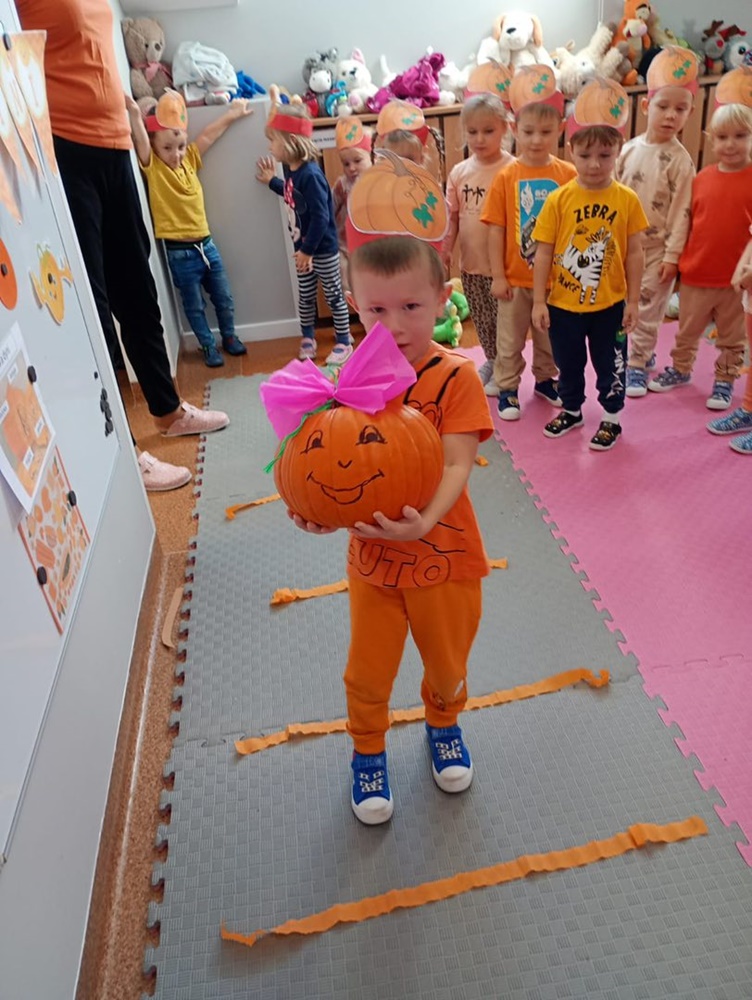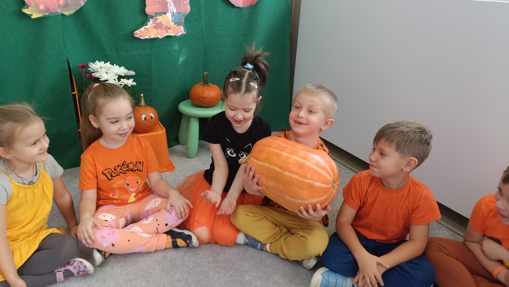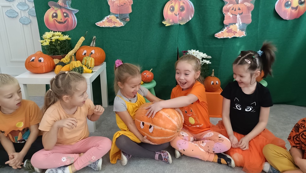 Podczas spotkania dzieci w swoich salach uczestniczyły w zabawach muzyczno - ruchowych, plastycznych, rozwiązywały zagadki, wykonywały prace plastyczne, bawiły się darami jesieni. Było dyniowo, marchewkowo, kasztanowo i jesiennie pomarańczowo.