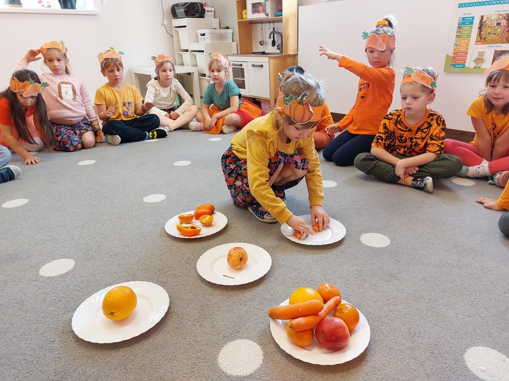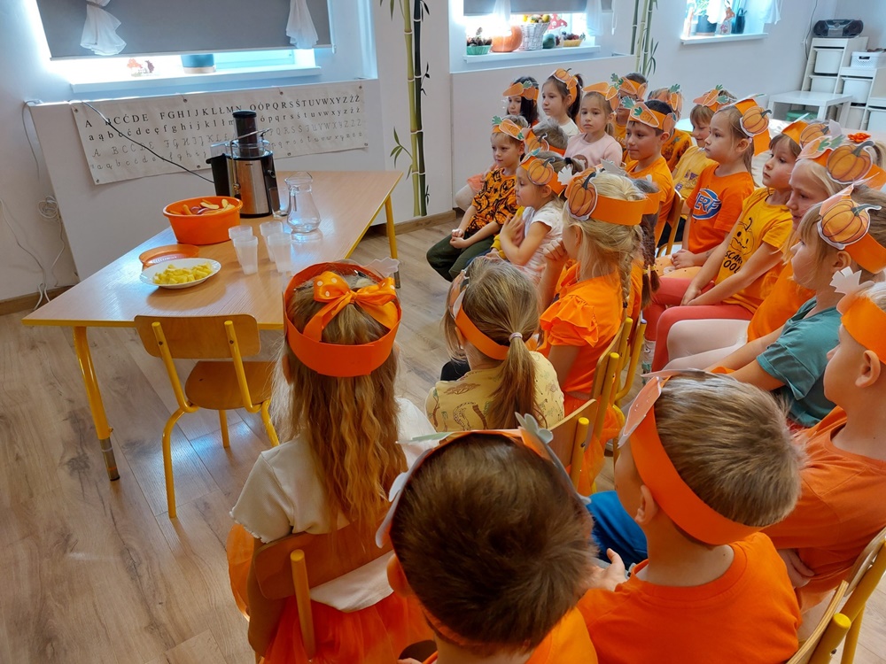 Skoro pomarańczowy dzień, to nie mogło zabraknąć pomarańczowych przekąsek. Przedszkolaki ze smakiem piły sok marchewkowy i pomarańczowy, zajadały pomarańczowe owoce.
