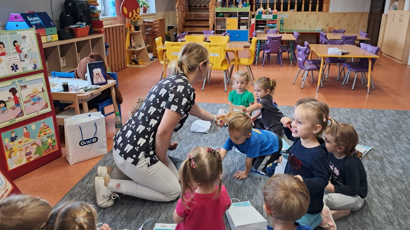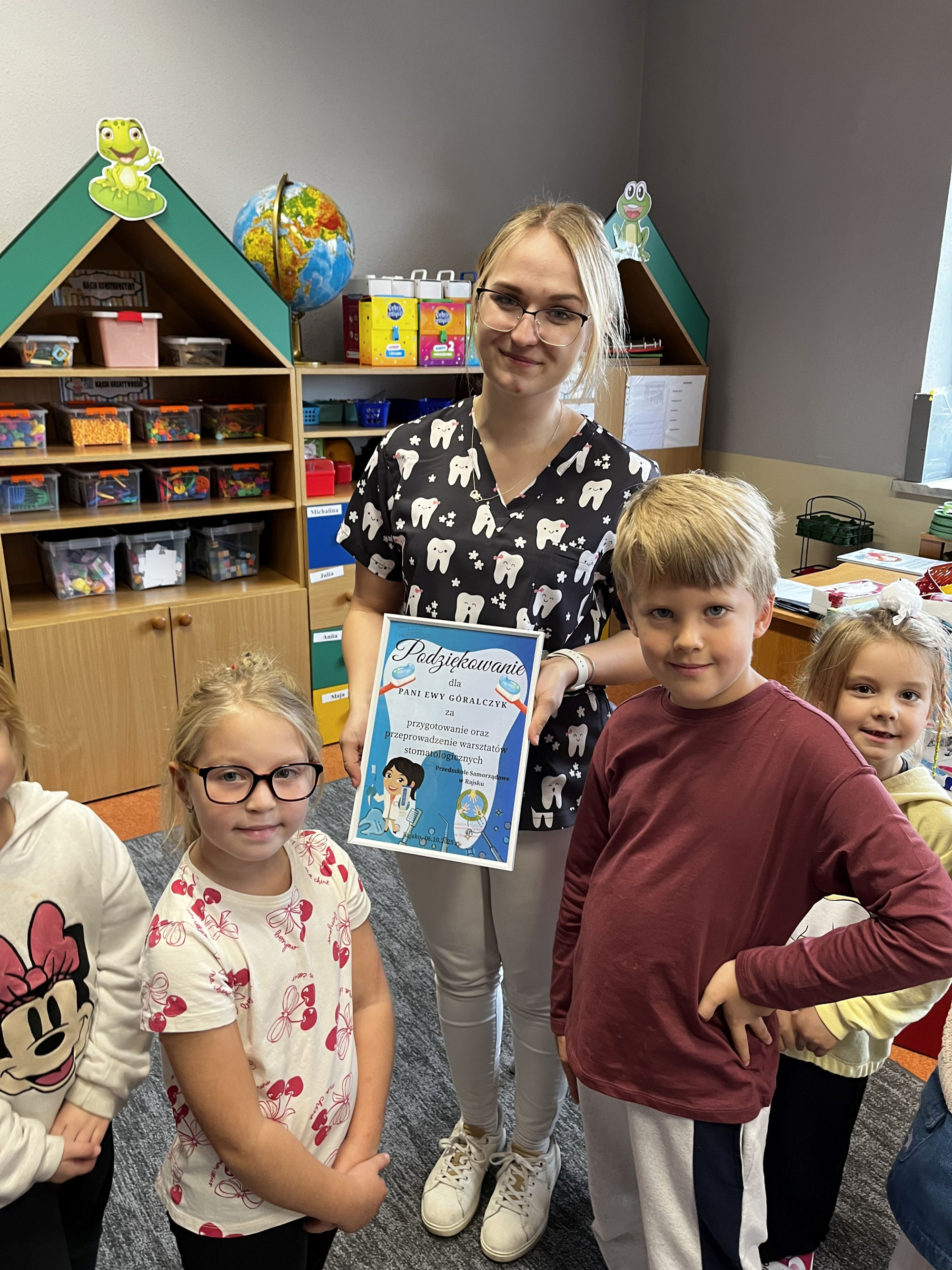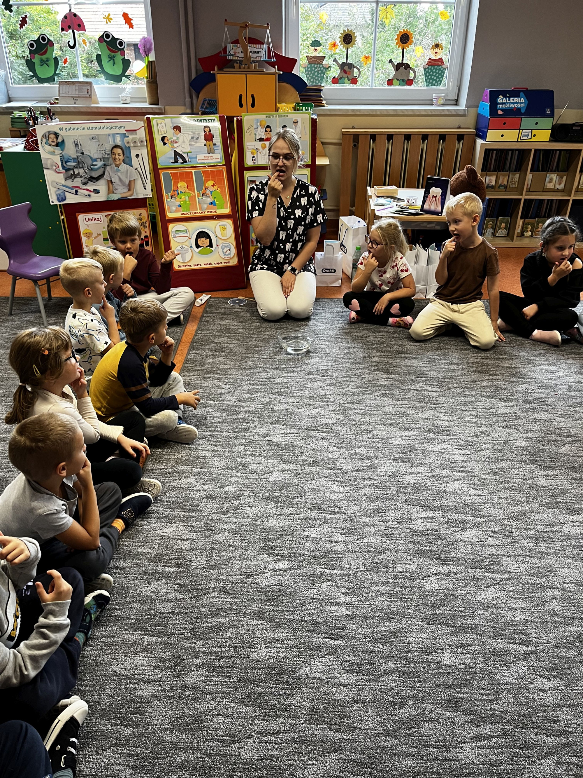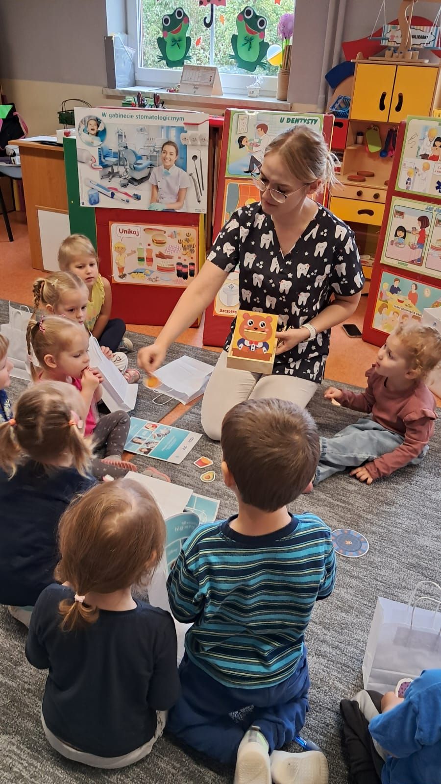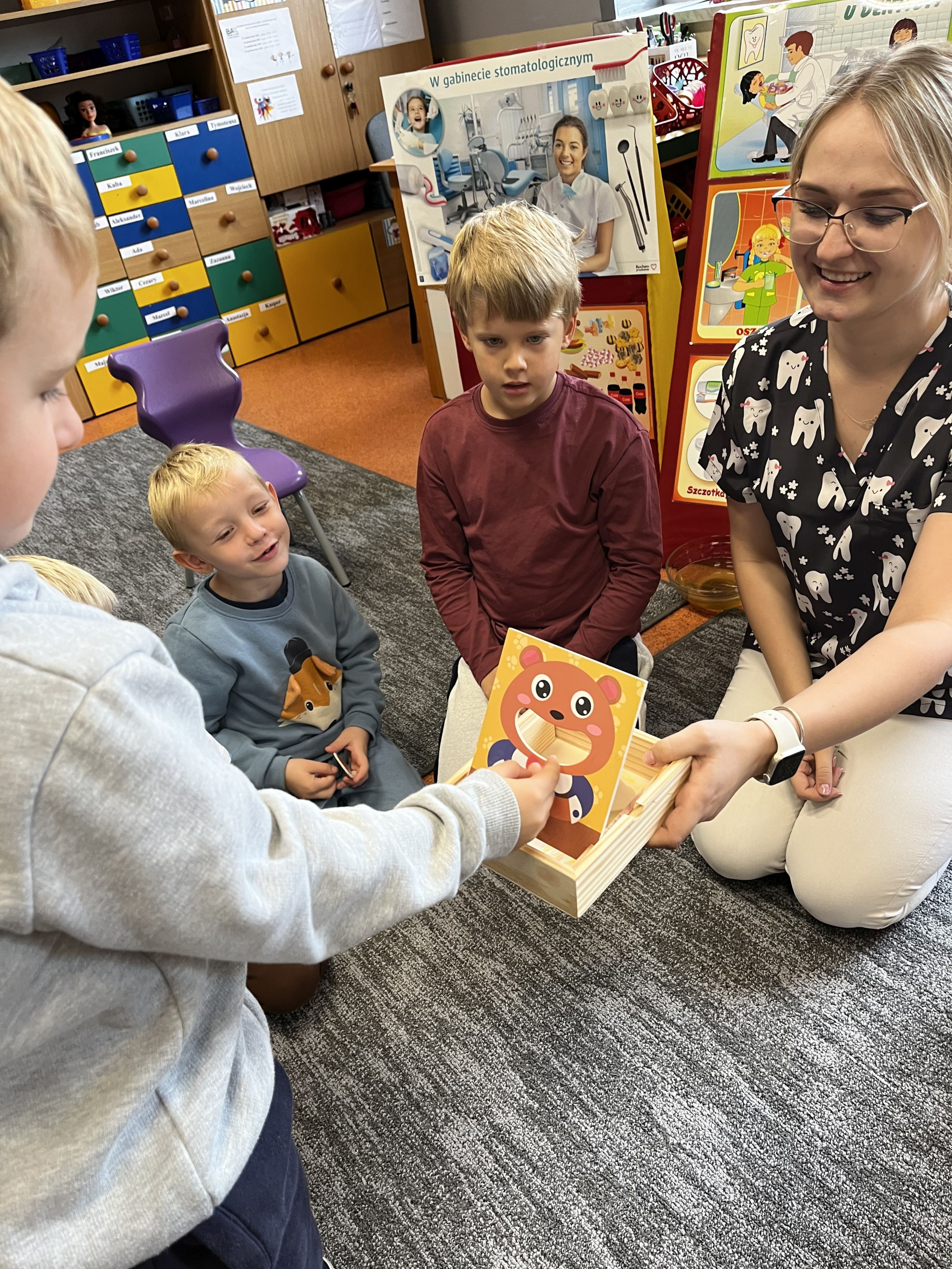 W dniu 6 października do naszego przedszkola zawitała Pani Ewa Góralczyk , która jest asystentką stomatologiczną. Pani Ewa opowiedziałóa dzieciom o swojej pracy oraz o tym jak należy dbać o swoje zęby. Serdecznie dziękujemy za wspaniałe warsztaty.