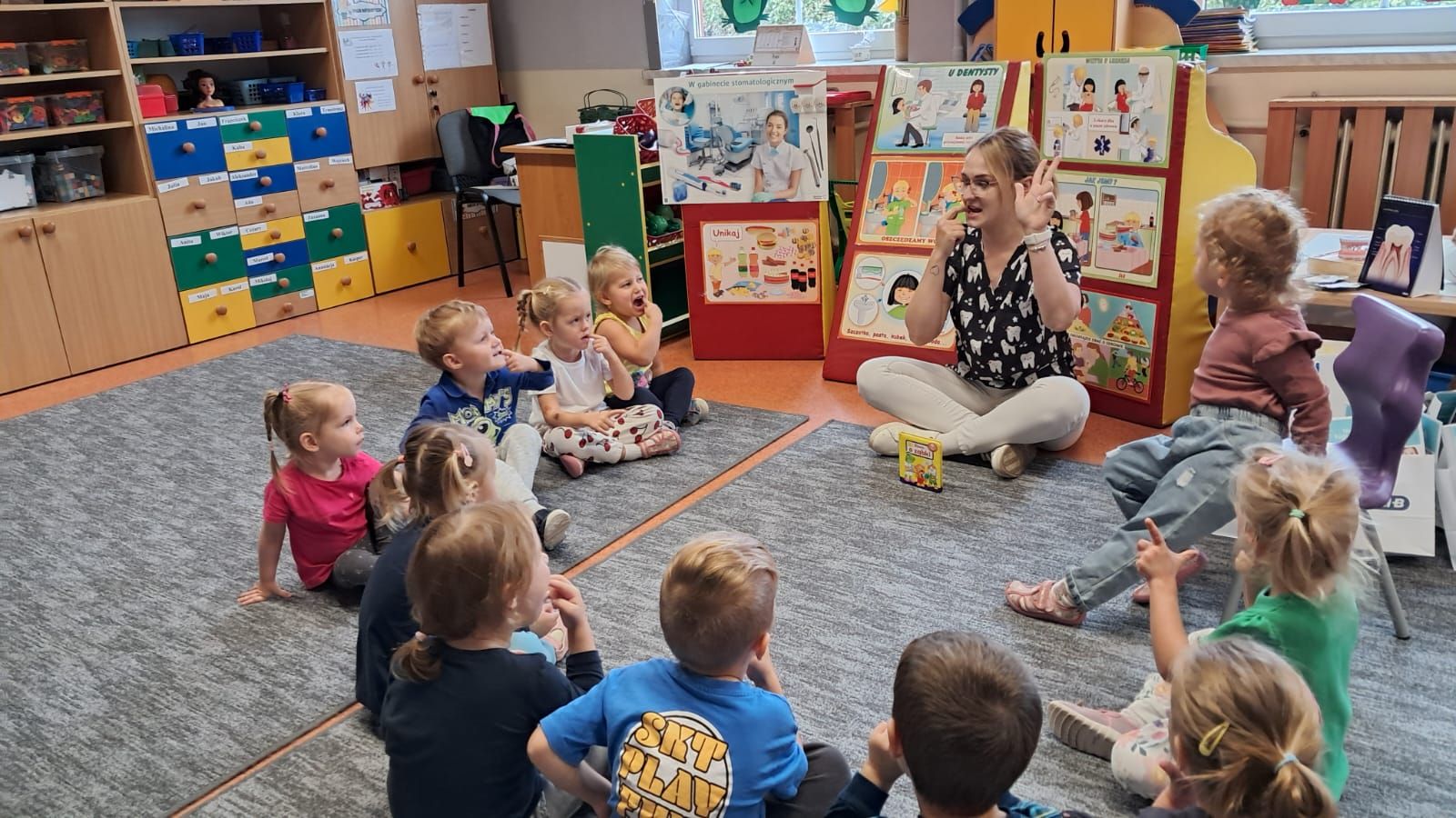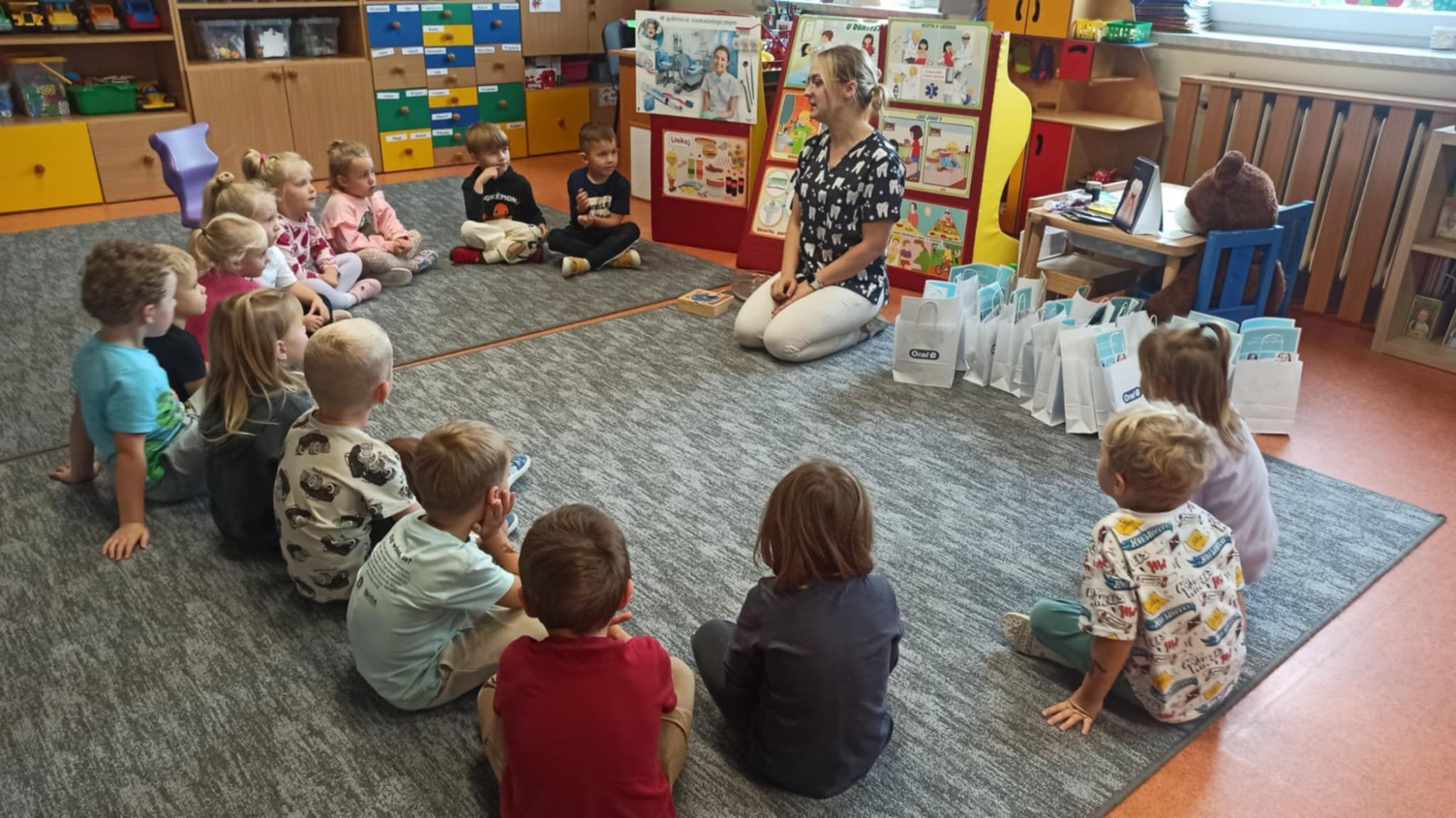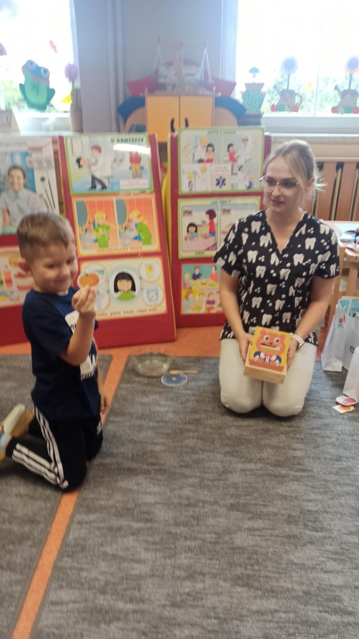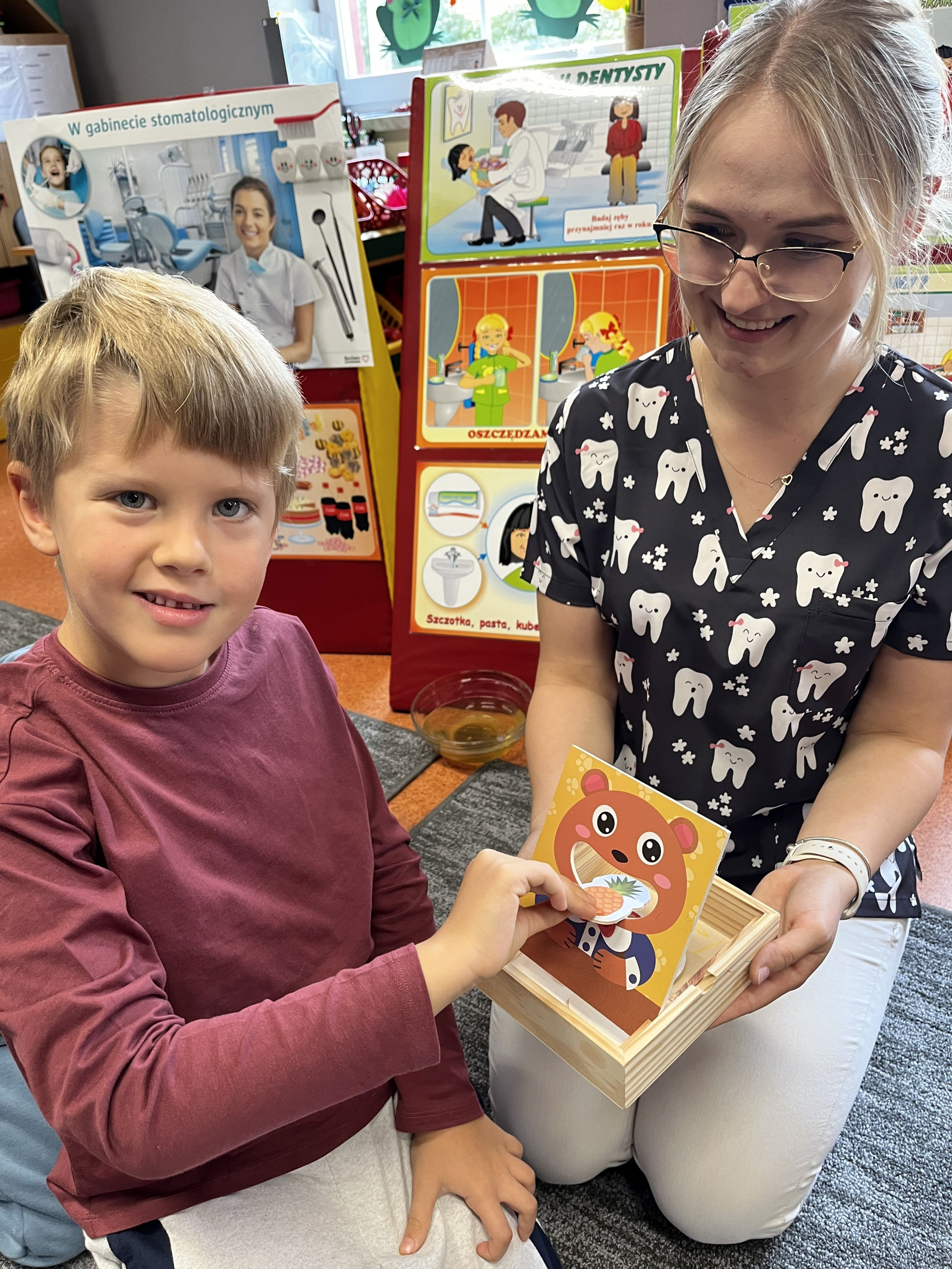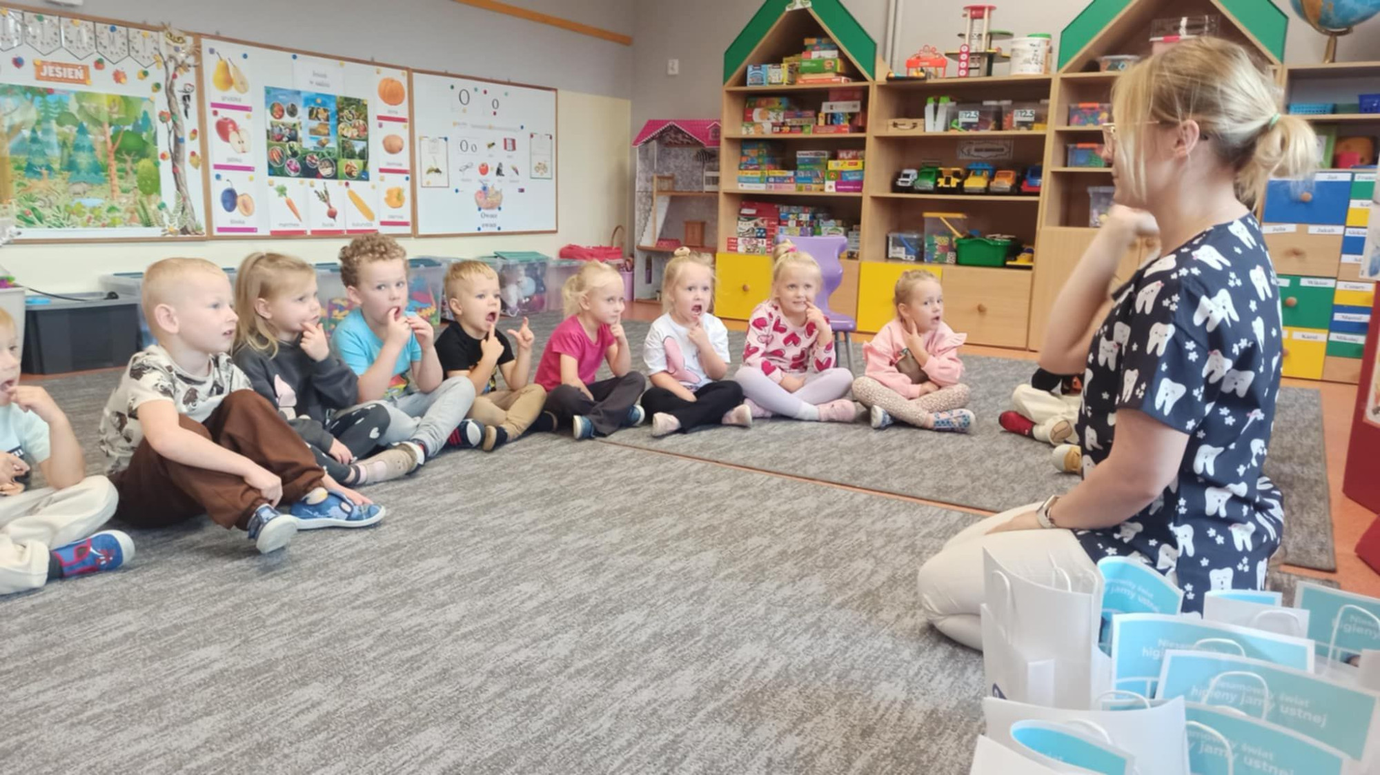 W dniu 6 października do naszego przedszkola zawitała Pani Ewa Góralczyk , która jest asystentką stomatologiczną. Pani Ewa opowiedziałóa dzieciom o swojej pracy oraz o tym jak należy dbać o swoje zęby. Serdecznie dziękujemy za wspaniałe warsztaty.
