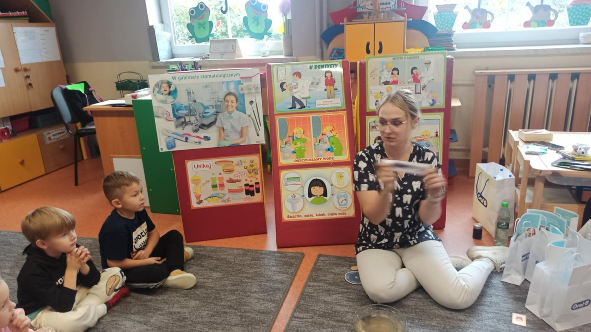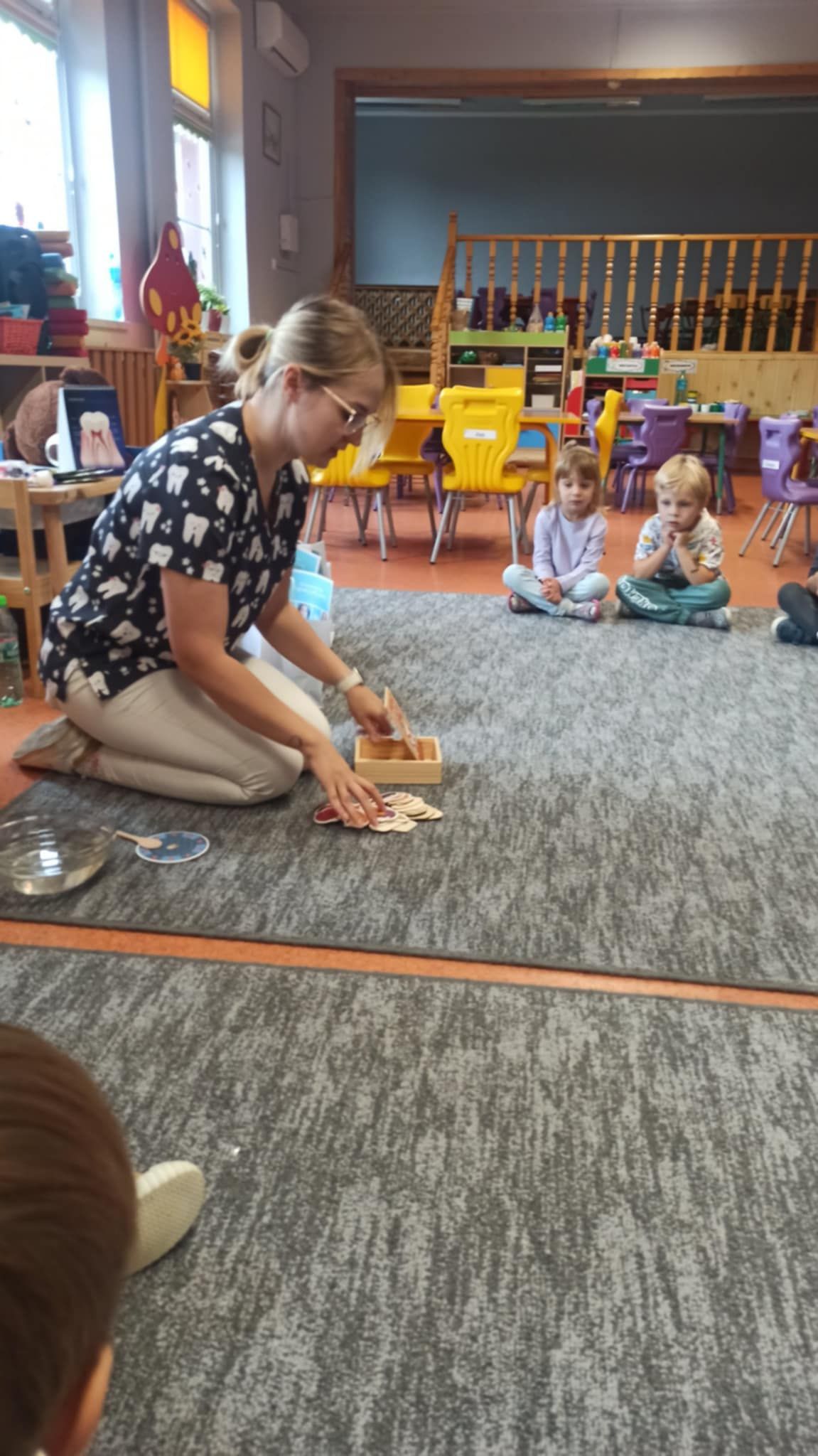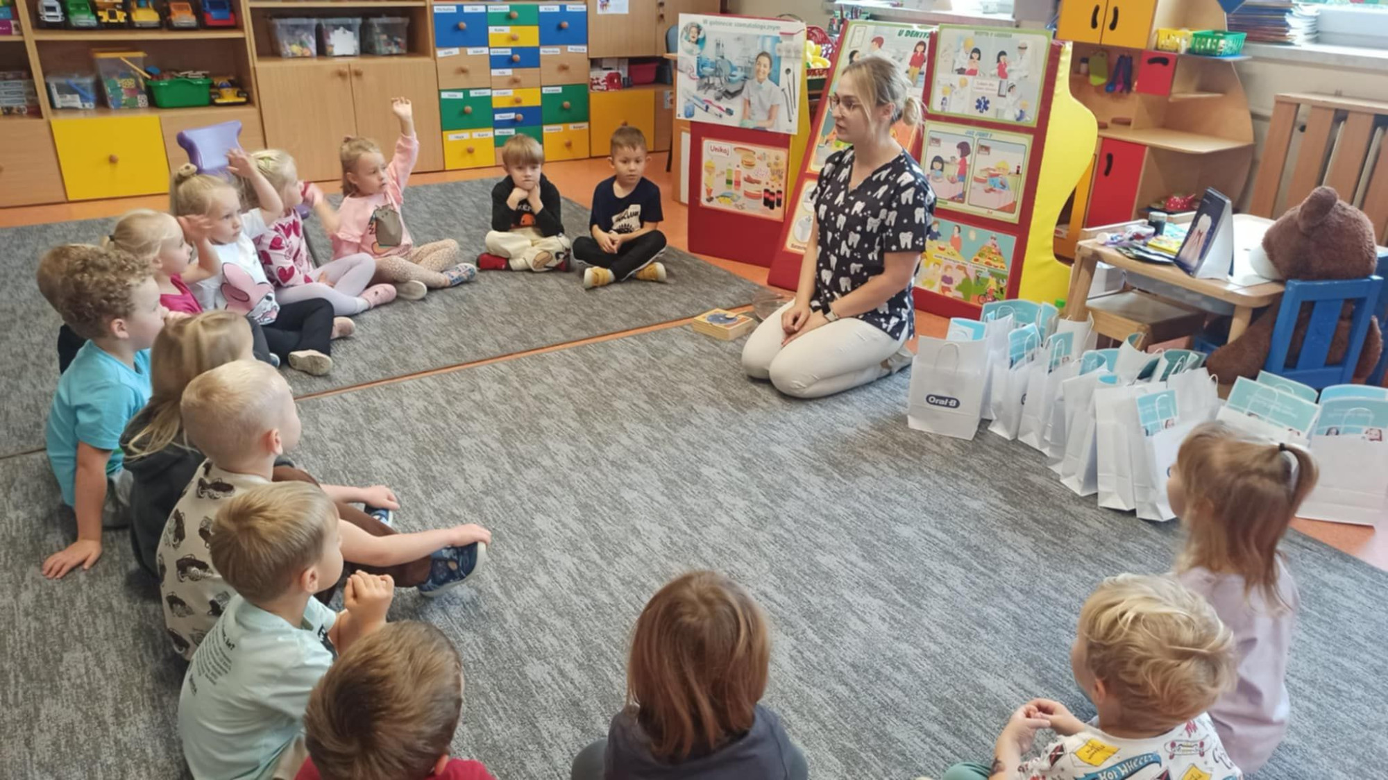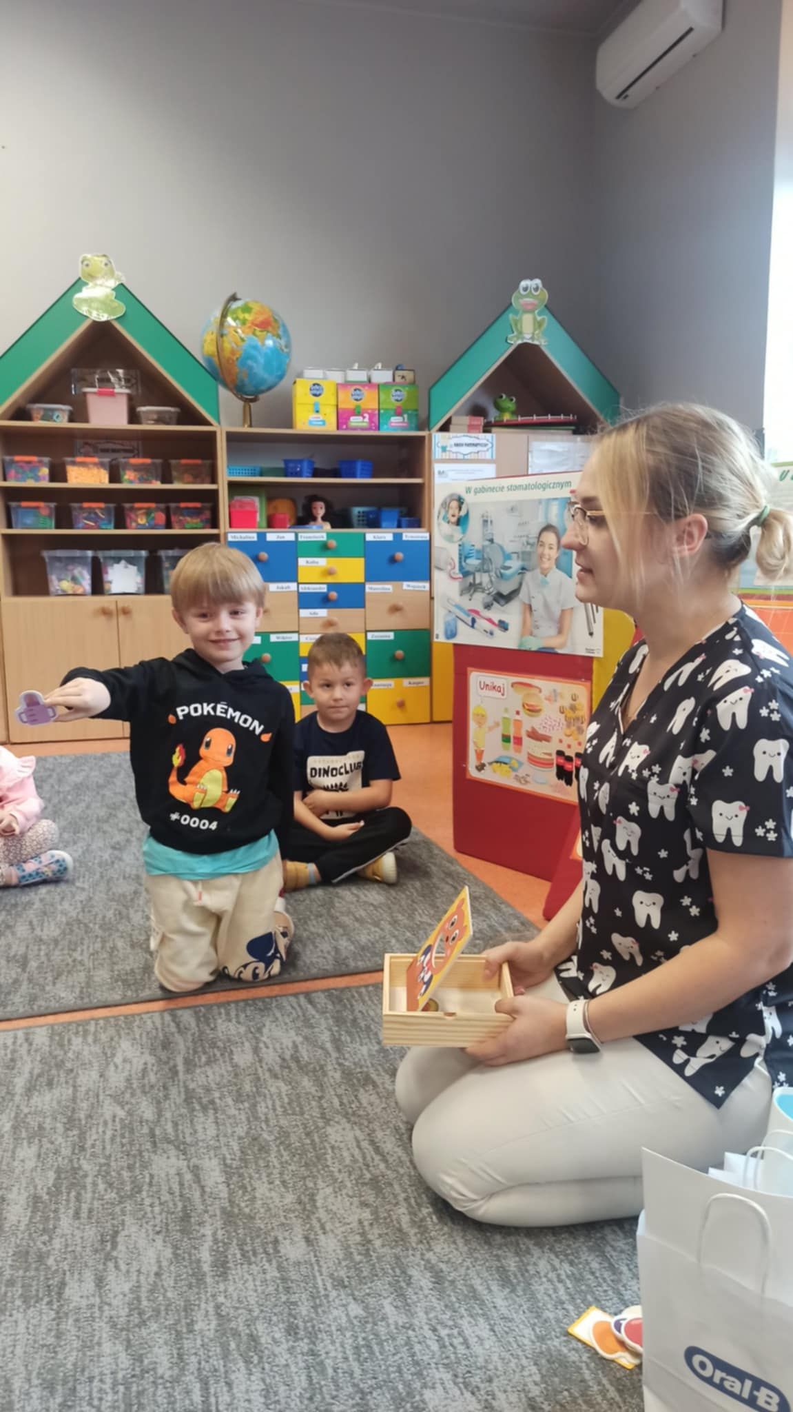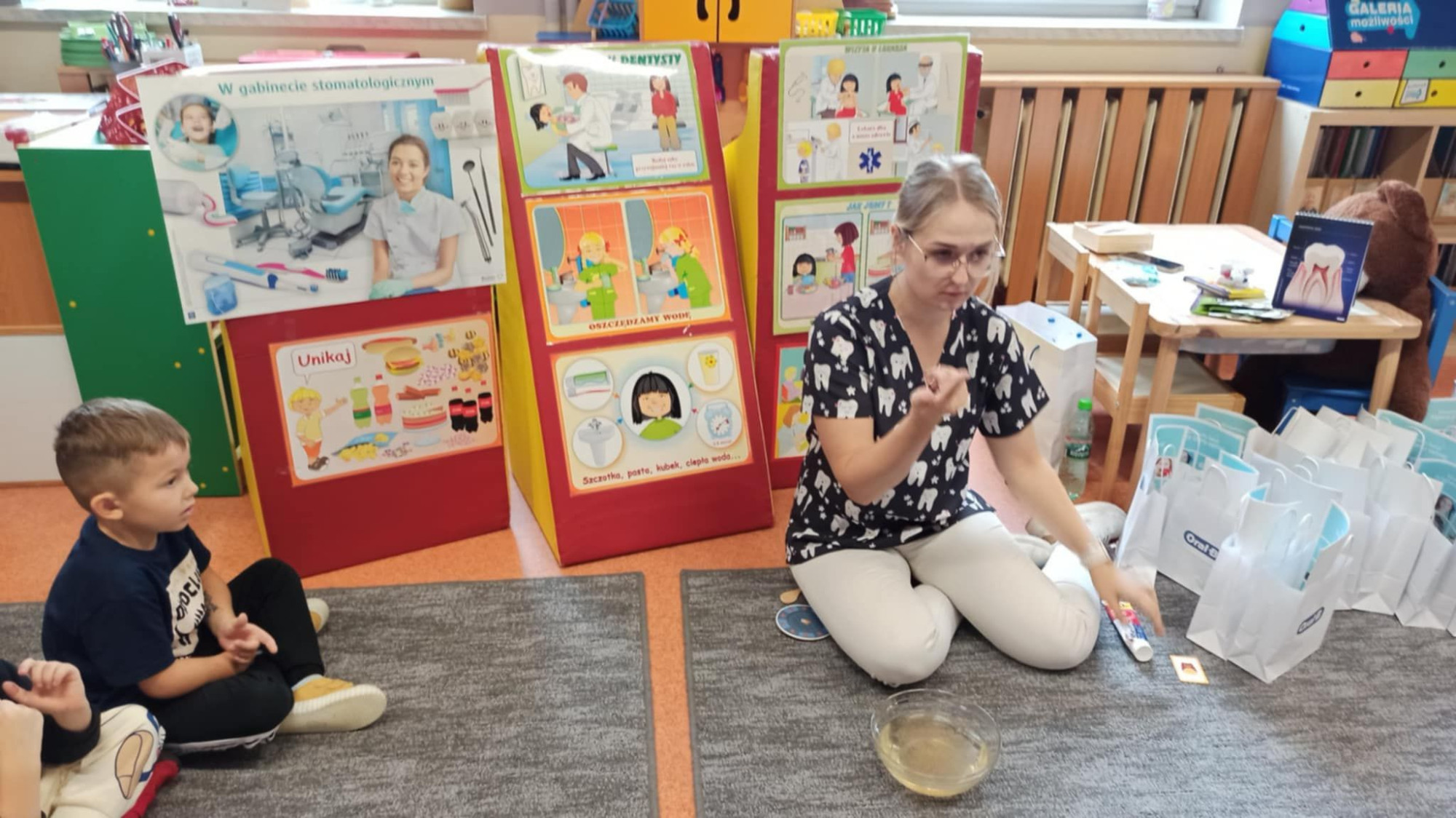W dniu 6 października do naszego przedszkola zawitała Pani Ewa Góralczyk , która jest asystentką stomatologiczną. Pani Ewa opowiedziałóa dzieciom o swojej pracy oraz o tym jak należy dbać o swoje zęby. Serdecznie dziękujemy za wspaniałe warsztaty.