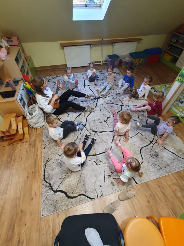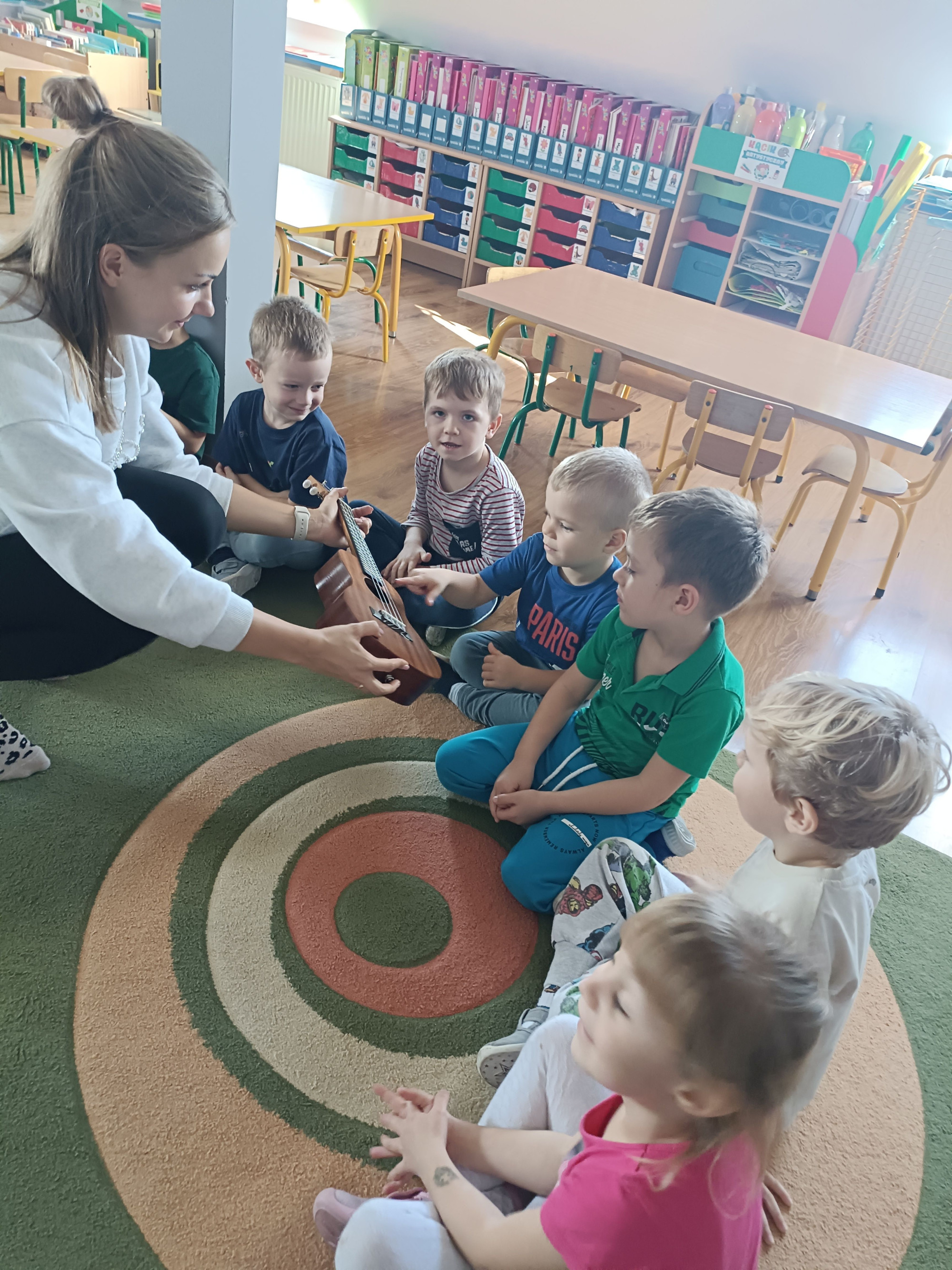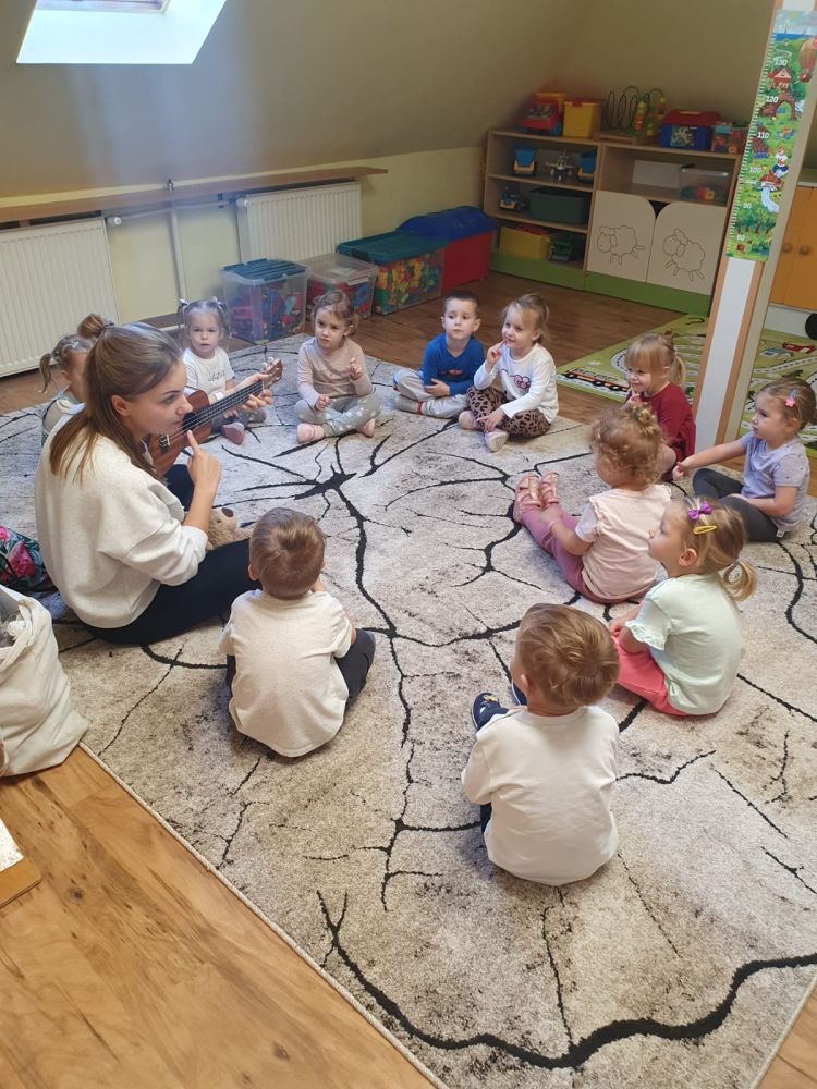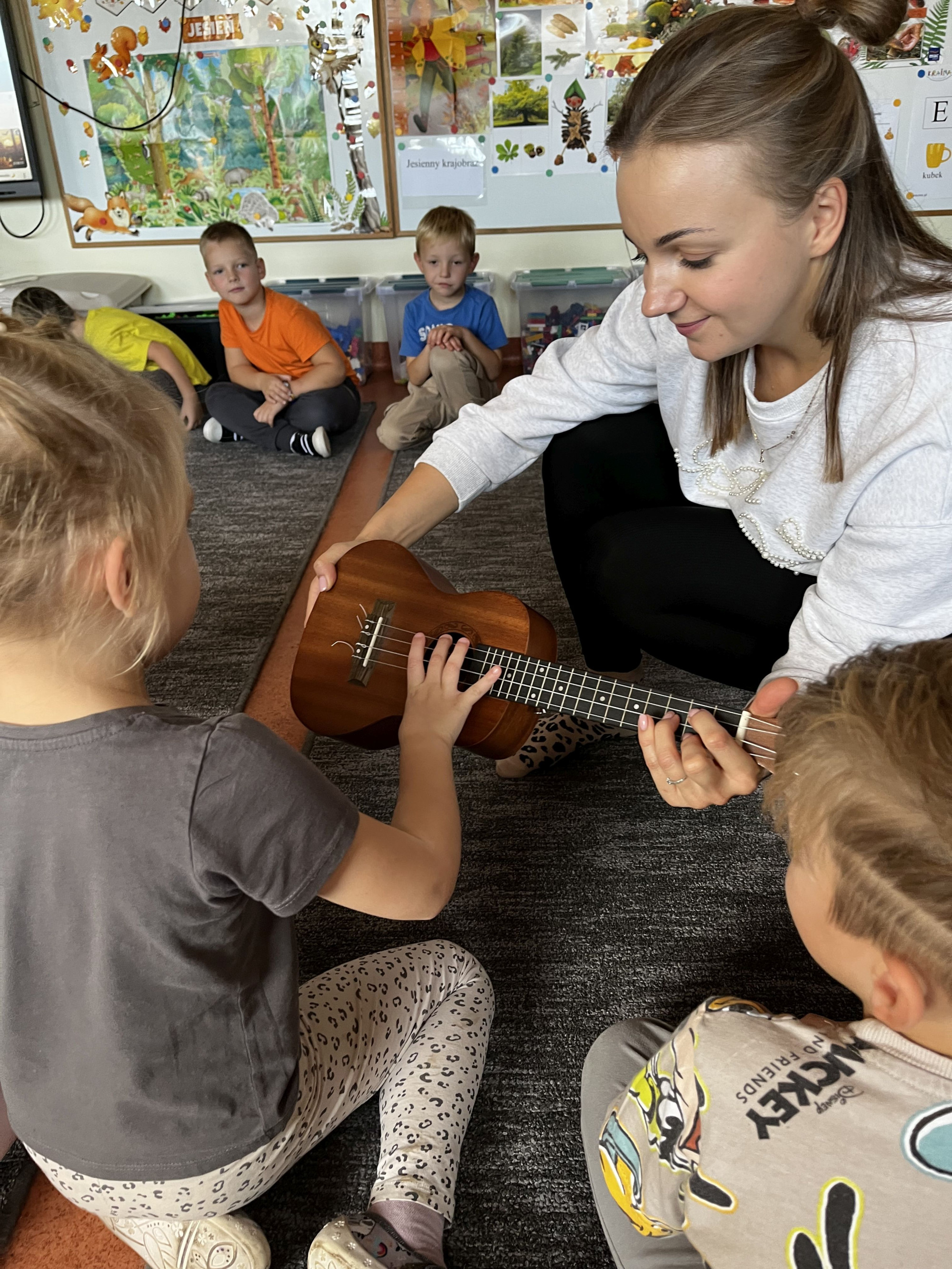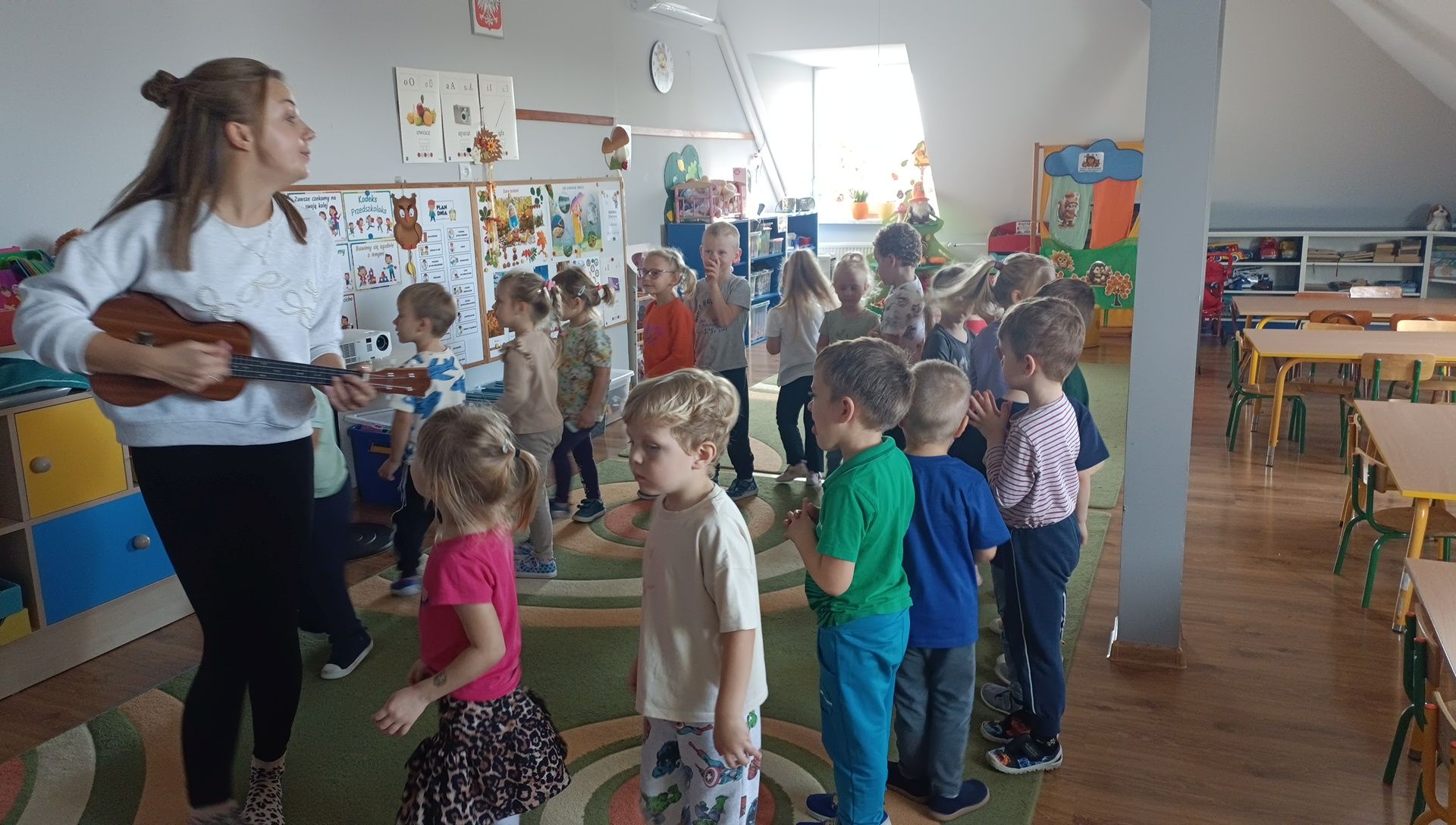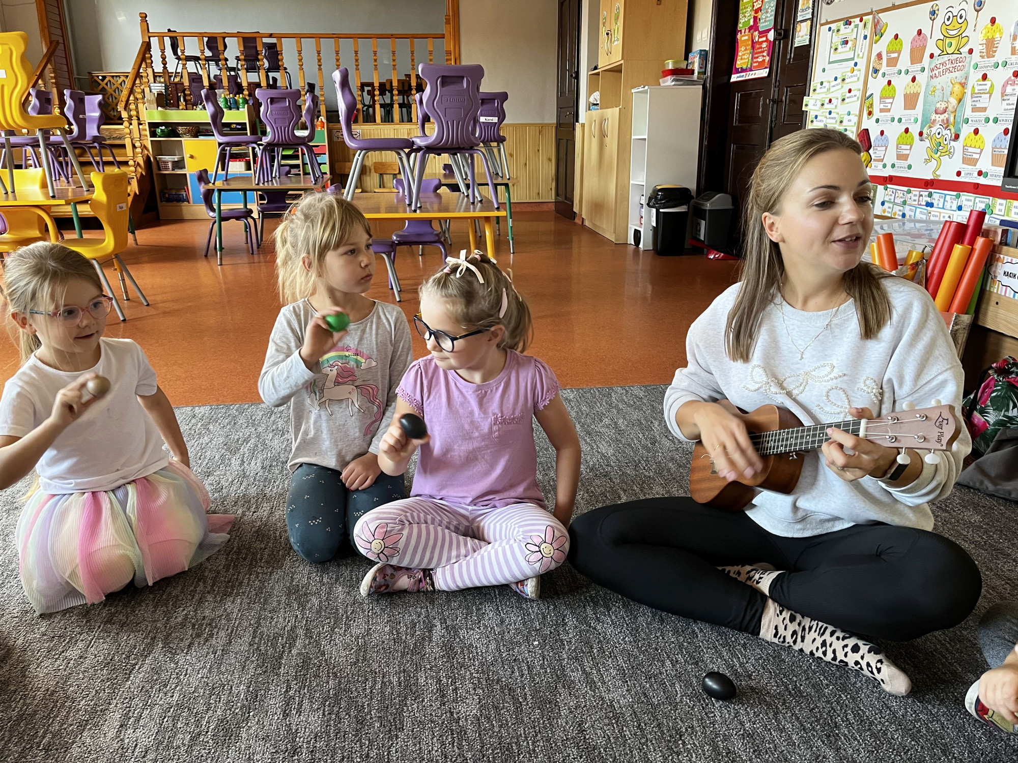 | Oddziały przedszkolne „Słoneczek”, „Kaczuszek” oraz „Żabek” 23 października uczestniczyły w warsztatach muzycznych prowadzonych przez rytmiczkę p. Agnieszkę. Warsztaty miały na celu rozwijanie wrażliwości i słuchu muzycznego dzieci. Poznały nowy instrument strunowy - okulele, na którym grała prowadząca. Brały udział w zabawach rytmiczno-muzycznych z użyciem kubeczków, marakasów. Grały na bębenku i klawesach. |