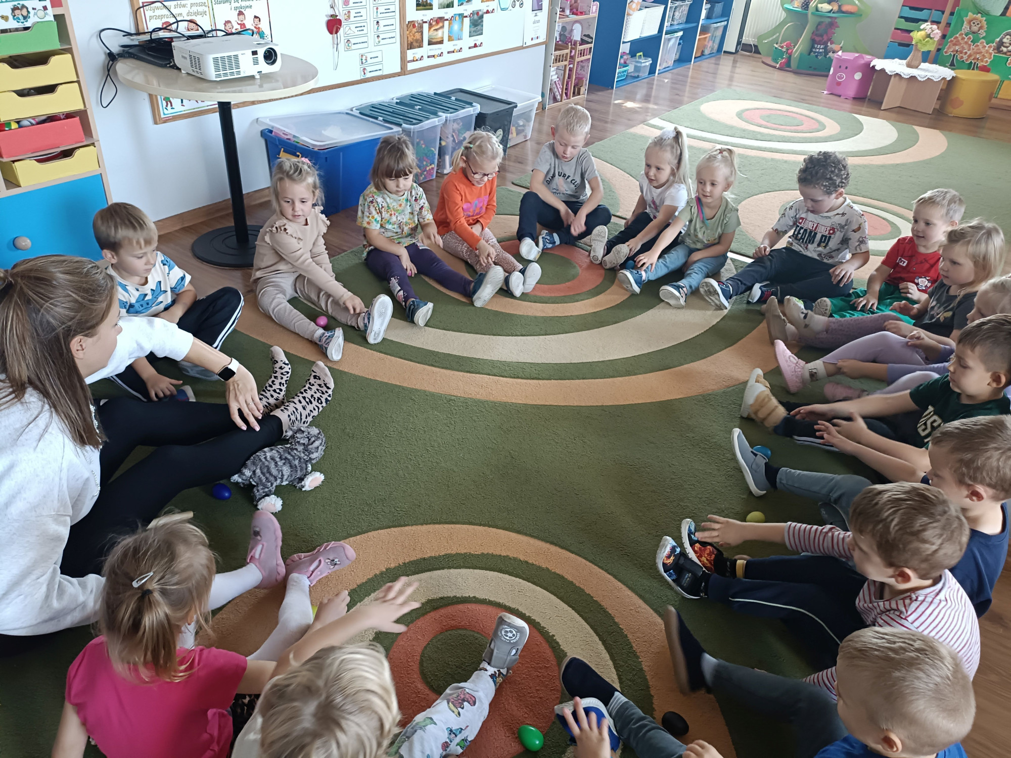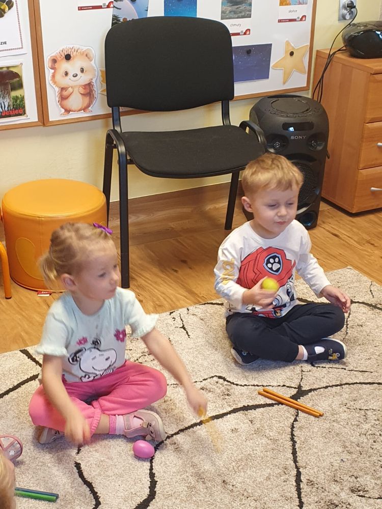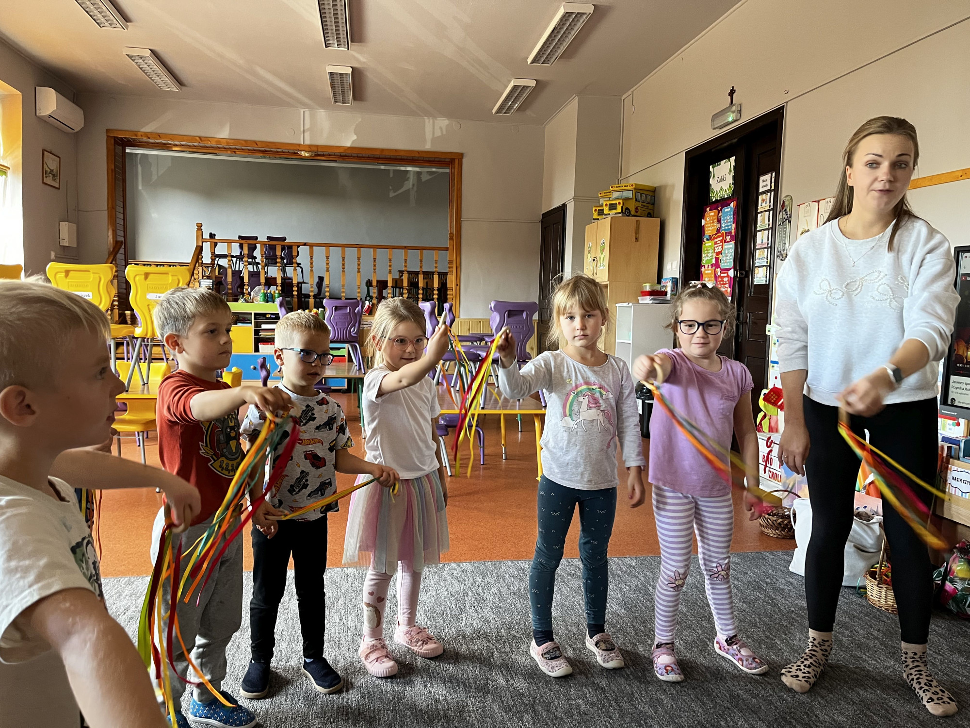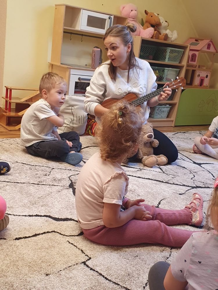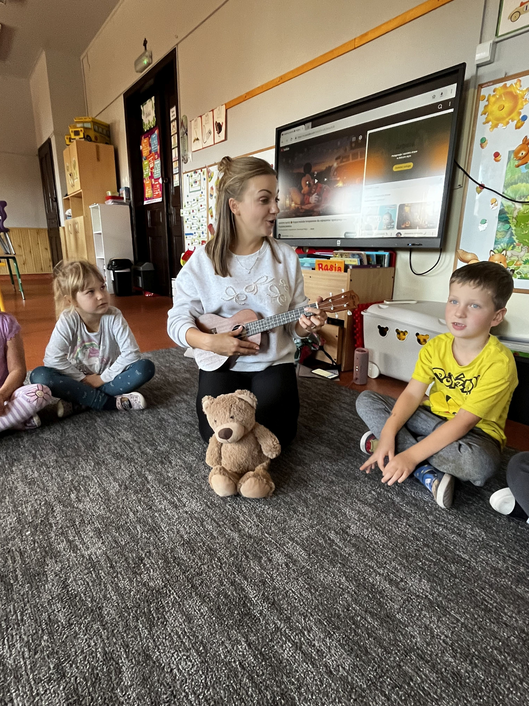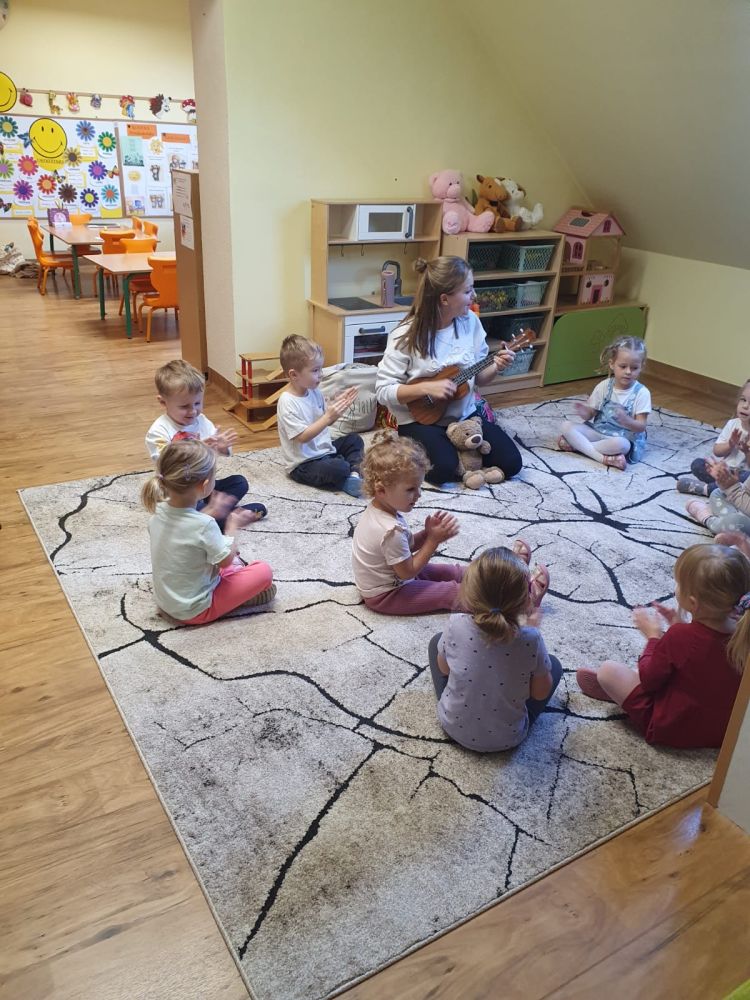 | Oddziały przedszkolne „Słoneczek”, „Kaczuszek” oraz „Żabek” 23 października uczestniczyły w warsztatach muzycznych prowadzonych przez rytmiczkę p. Agnieszkę. Warsztaty miały na celu rozwijanie wrażliwości i słuchu muzycznego dzieci. Poznały nowy instrument strunowy - okulele, na którym grała prowadząca. Brały udział w zabawach rytmiczno-muzycznych z użyciem kubeczków, marakasów. Grały na bębenku i klawesach. |