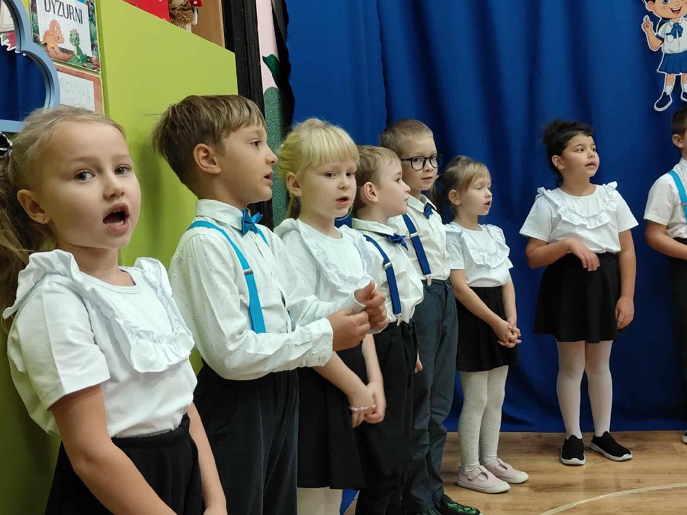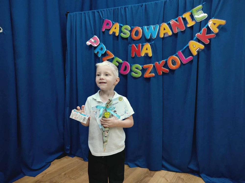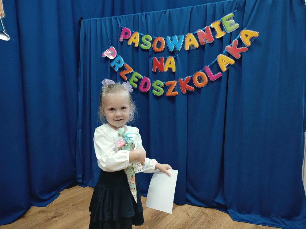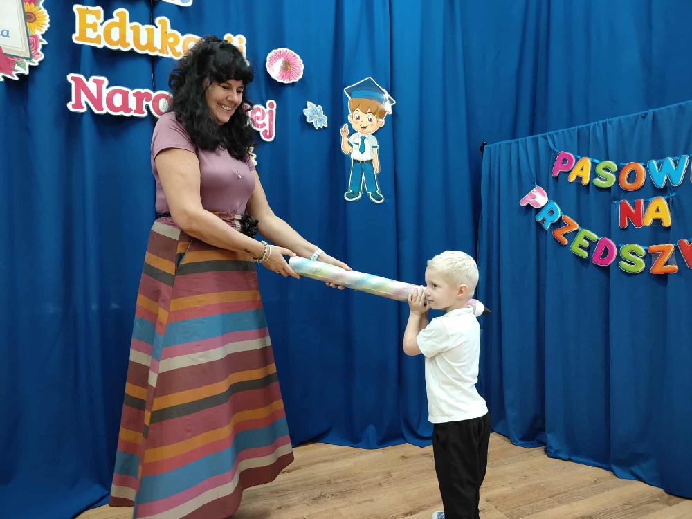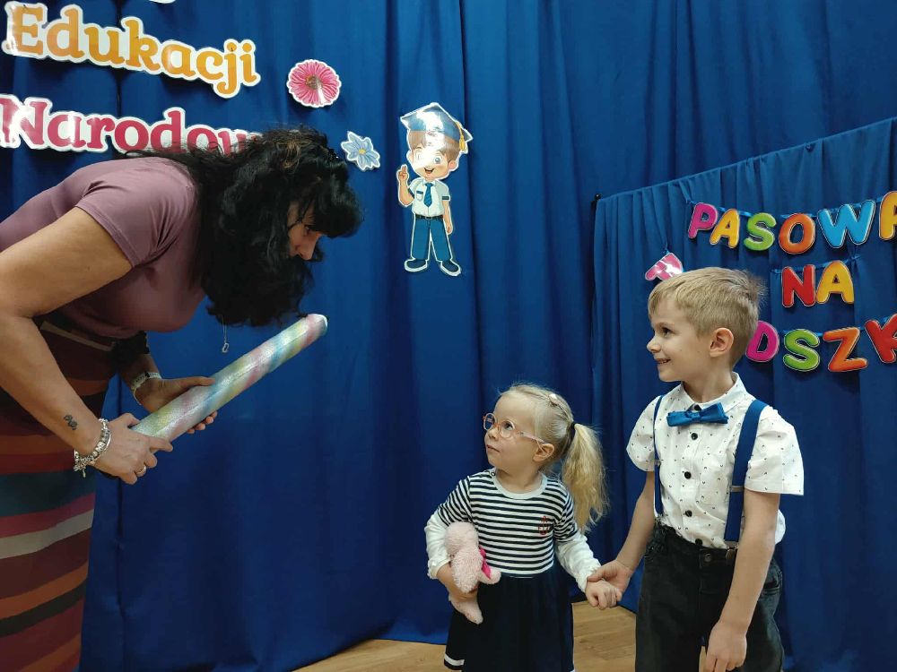 Najważniejszym momentem uroczystości było oczywiście Pasowanie na Przedszkolaka. Najmłodsze dzieci złożyły uroczyste przyrzeczenie, po czym pani dyrektor dokonała symbolicznego pasowania „czarodziejskim ołówkiem”.